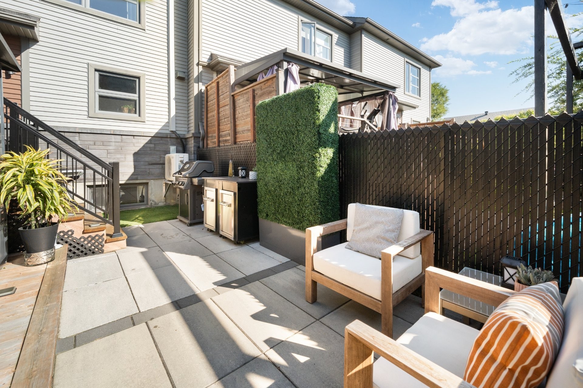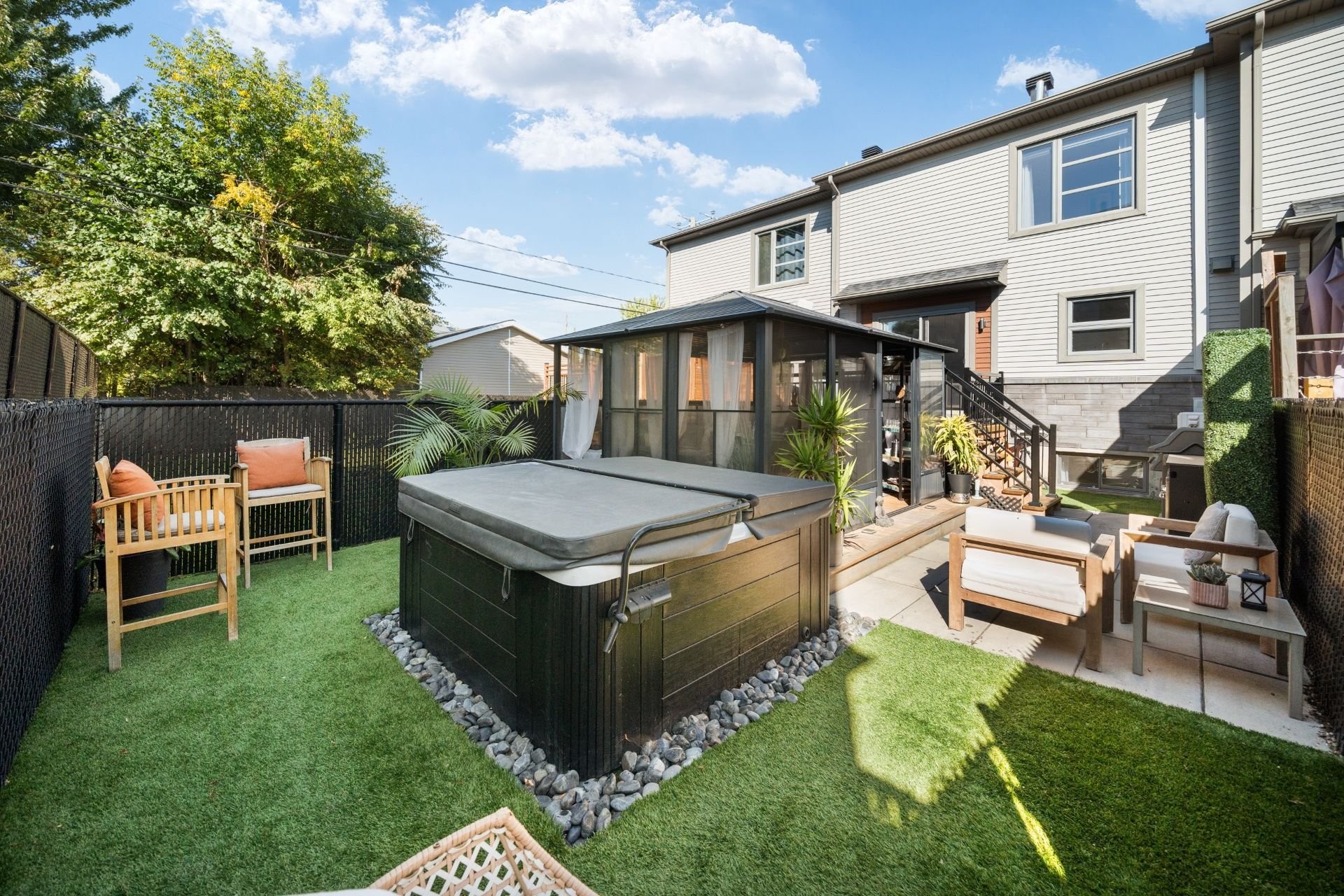 Aménagement paysager avec pavé-uni à l'avant et à l'arrière. Rampe en aluminium au balcon arrière. Plateforme pour gazebo. Gazon synthétique et gazebo inclus.