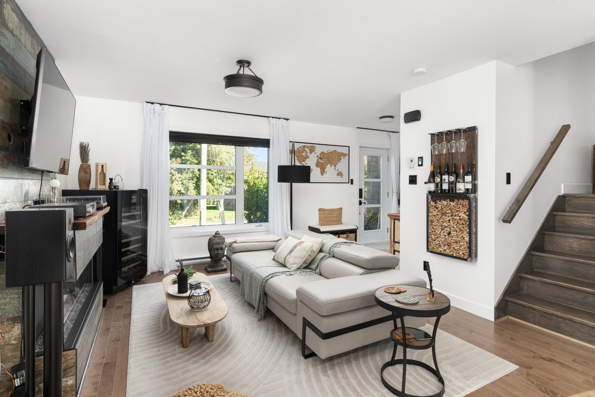 Concept à aire ouverte offrant une belle luminosité. Cuisine modernisée avec armoires mises à jour, comptoirs en quartz et plancher chauffant. Salon chaleureux avec foyer électrique 3 faces et élégant mur en céramique. Plancher de céramique chauffante dans la cuisine. Bois franc
