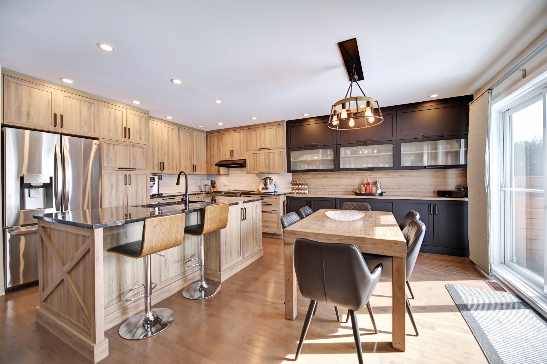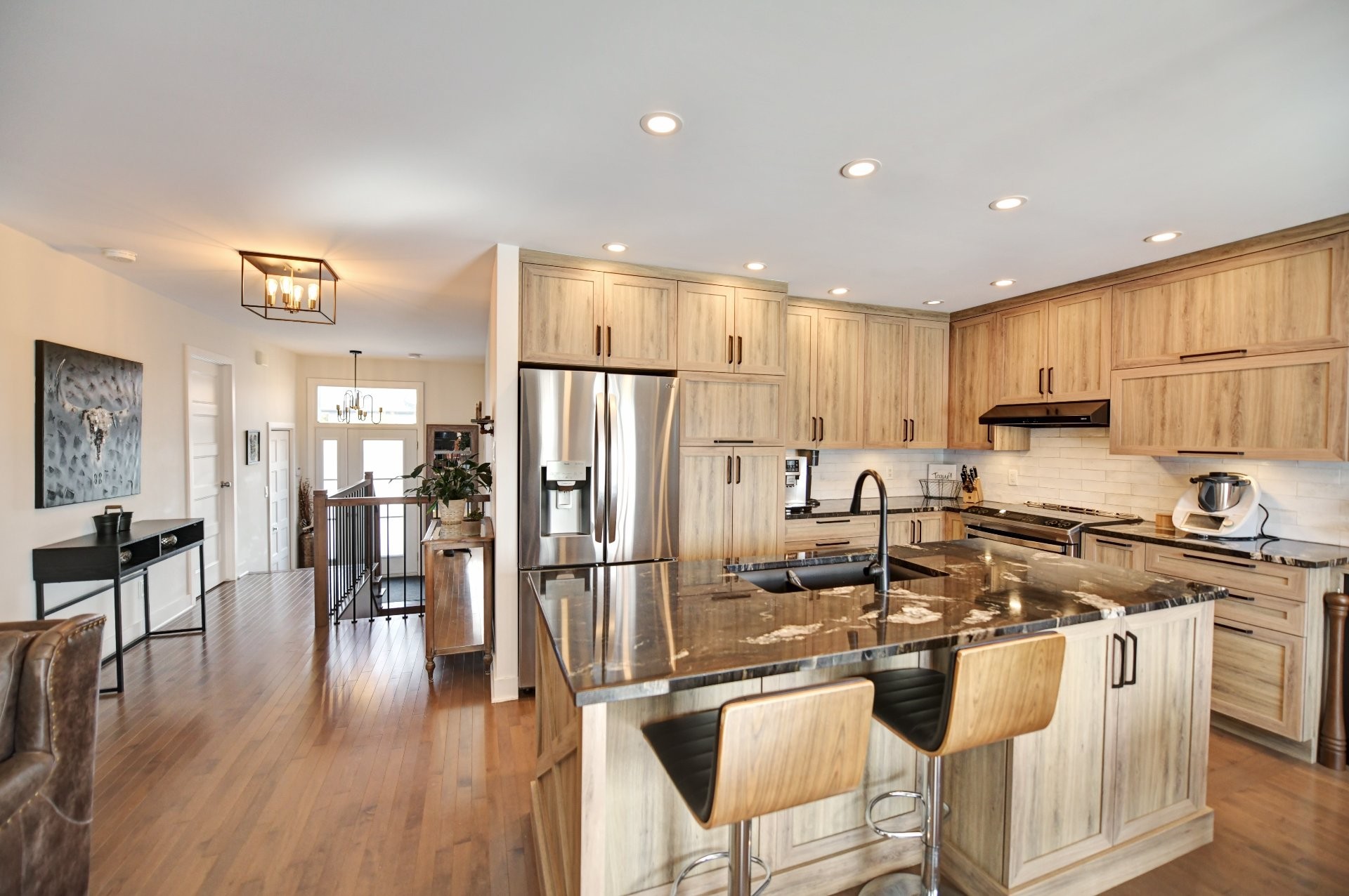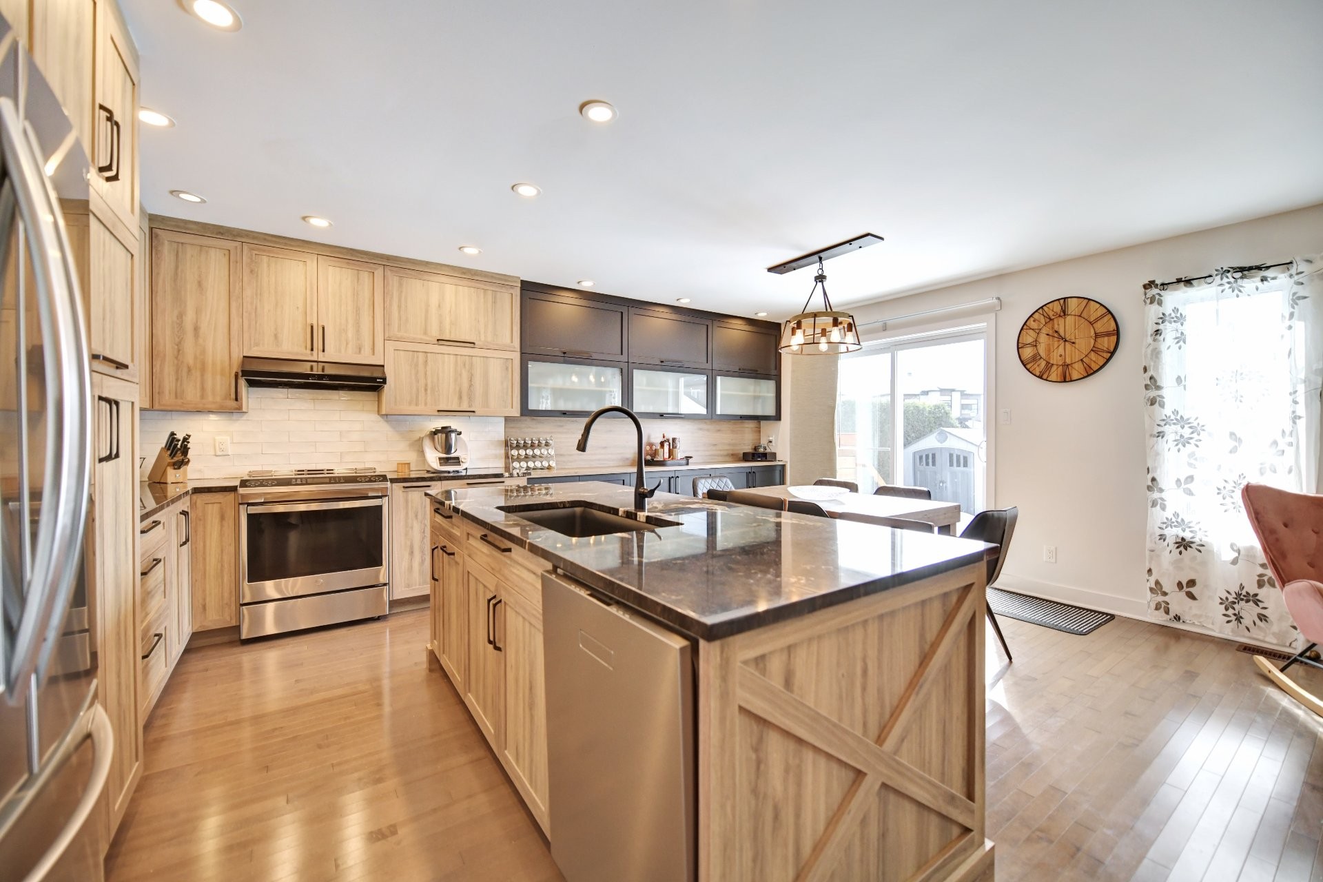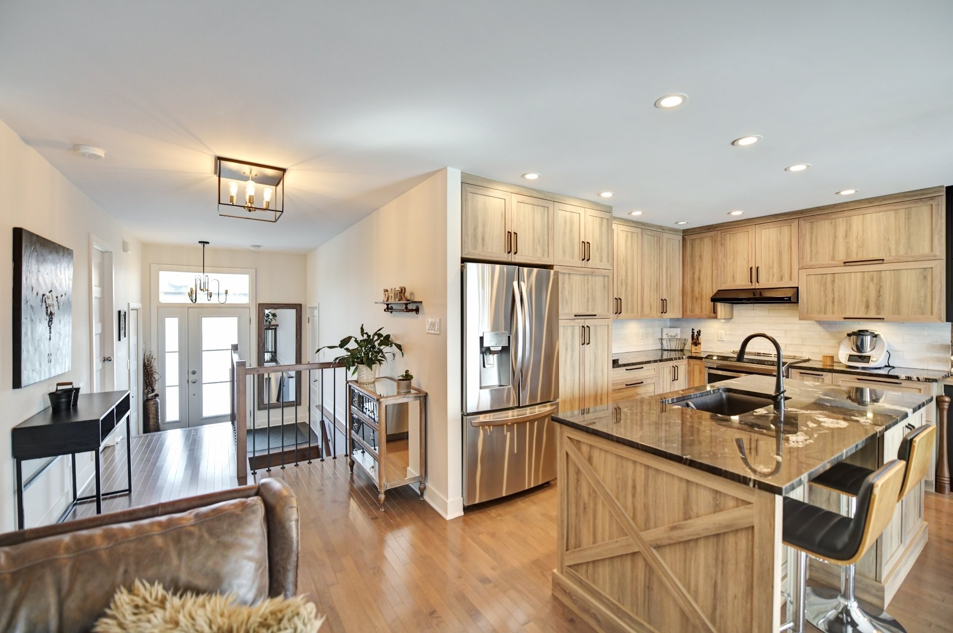 Cuisine entièrement rénovée avec nouvelles armoires en polyester de haute qualité, incluant du rangement additionnel sur mesure. Armoires plus profondes que le standard avec intérieur coloré. Quincaillerie haut de gamme Richelieu et fonds de tiroirs doublés de tapis. Rangement spécialisé : armoire à épices, tiroirs pour casseroles, panier coulissant pour lavette/linge, mécanisme cargo pour poubelle et recyclage. Marche-pied escamotable intégré et entrée d'aspirateur central intégrée au coup-de-pied. Comptoir de granite 1 1/4 po, éclairage sous les armoires, garde-manger avec tiroirs, hotte de cuisinière haut de gamme et broyeur à déchets intégré. Thermopompe centrale avec climatisation. Aspirateur central.