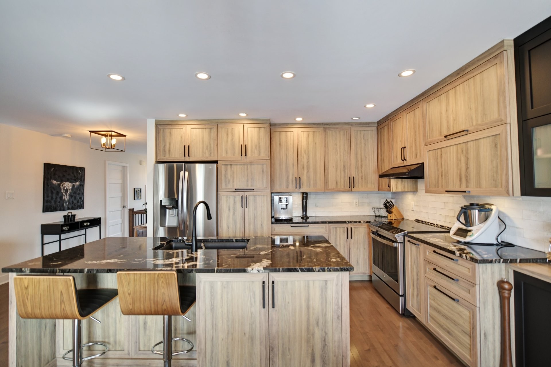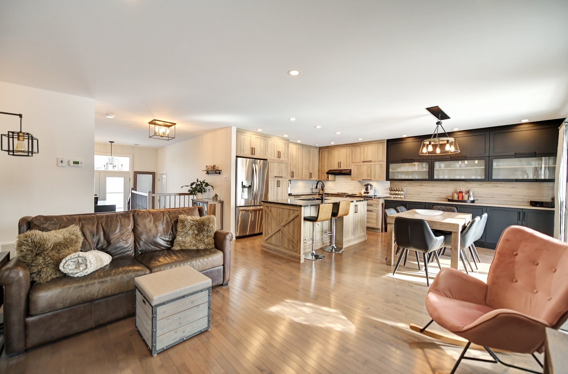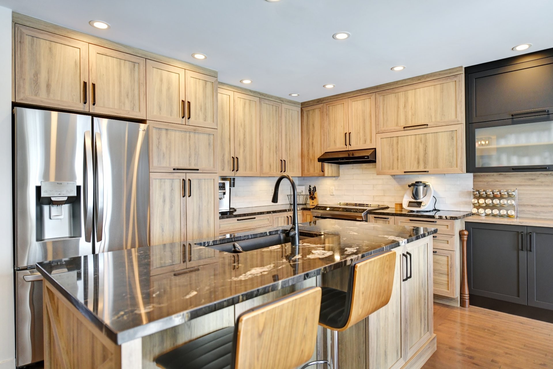 Cuisine entièrement rénovée avec nouvelles armoires en polyester de haute qualité, incluant du rangement additionnel sur mesure. Armoires plus profondes que le standard avec intérieur coloré. Quincaillerie haut de gamme Richelieu et fonds de tiroirs doublés de tapis. Rangement spécialisé : armoire à épices, tiroirs pour casseroles, panier coulissant pour lavette/linge, mécanisme cargo pour poubelle et recyclage. Marche-pied escamotable intégré et entrée d'aspirateur central intégrée au coup-de-pied. Comptoir de granite 1 1/4 po, éclairage sous les armoires, garde-manger avec tiroirs, hotte de cuisinière haut de gamme et broyeur à déchets intégré. Thermopompe centrale avec climatisation. Aspirateur central.
