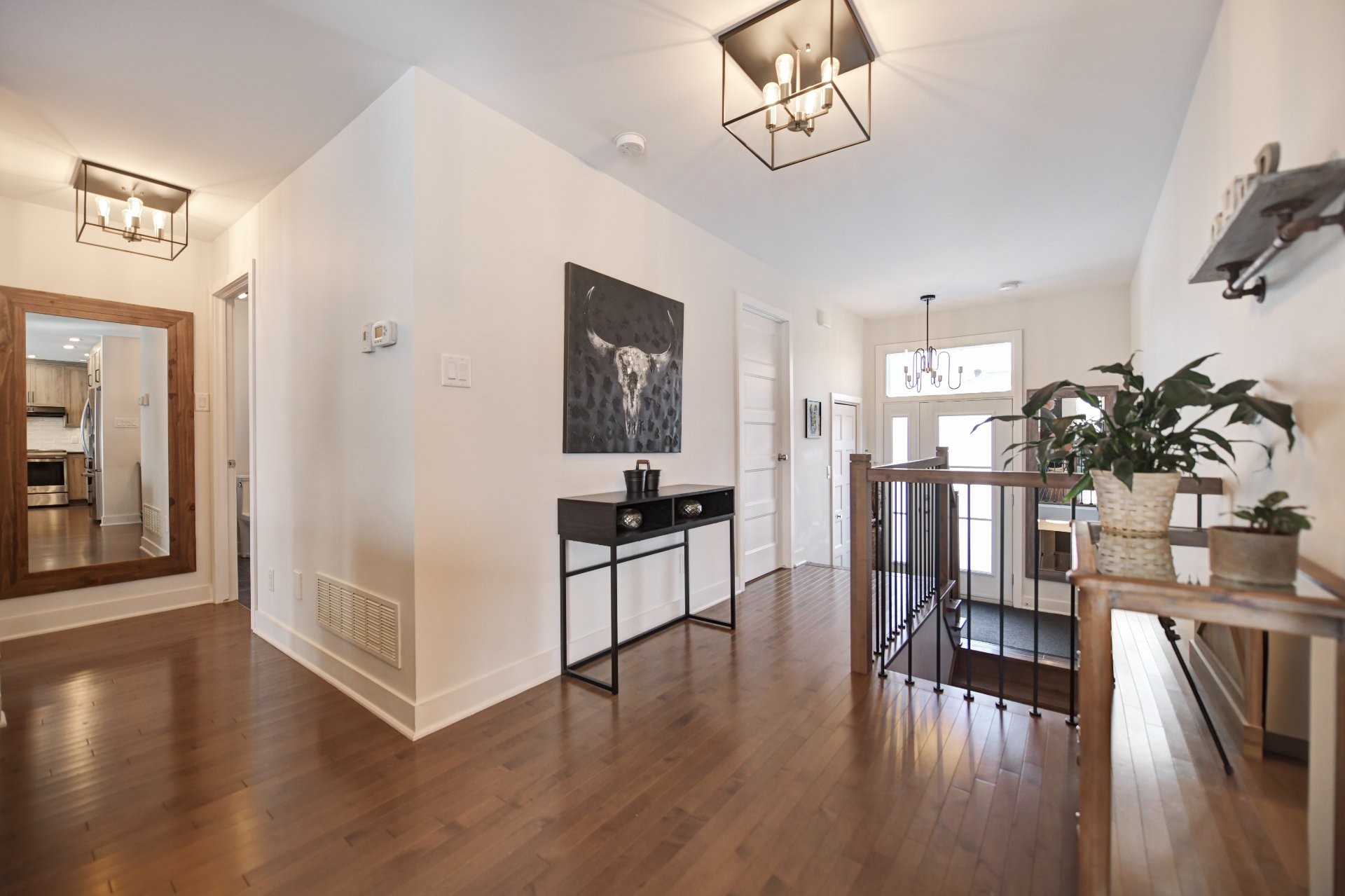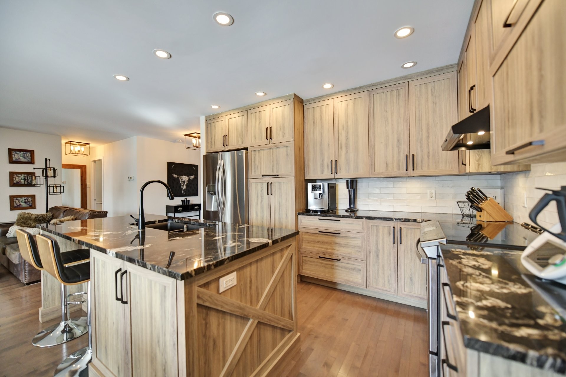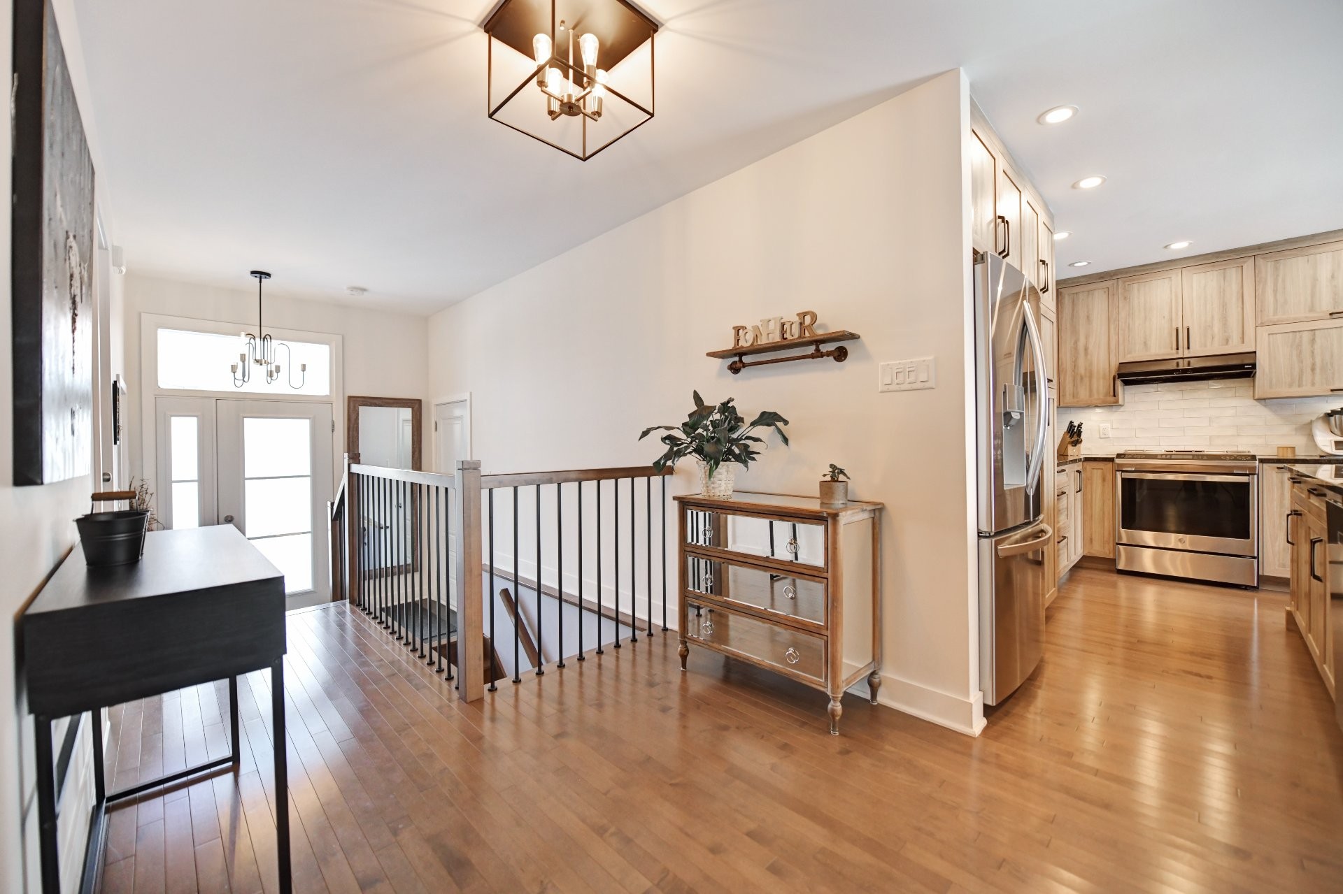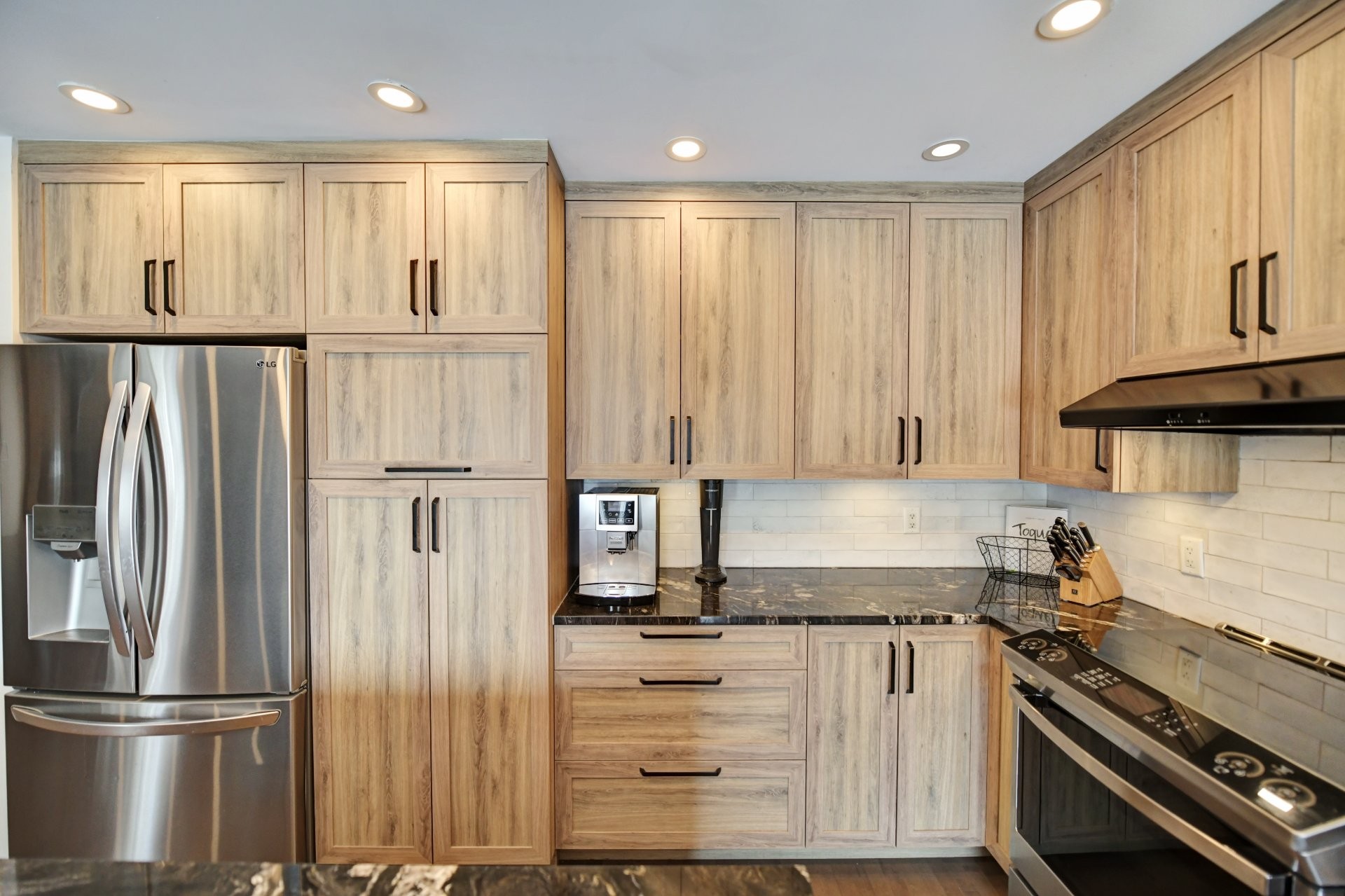 Cuisine entièrement rénovée avec nouvelles armoires en polyester de haute qualité, incluant du rangement additionnel sur mesure. Armoires plus profondes que le standard avec intérieur coloré. Quincaillerie haut de gamme Richelieu et fonds de tiroirs doublés de tapis. Rangement spécialisé : armoire à épices, tiroirs pour casseroles, panier coulissant pour lavette/linge, mécanisme cargo pour poubelle et recyclage. Marche-pied escamotable intégré et entrée d'aspirateur central intégrée au coup-de-pied. Comptoir de granite 1 1/4 po, éclairage sous les armoires, garde-manger avec tiroirs, hotte de cuisinière haut de gamme et broyeur à déchets intégré. Thermopompe centrale avec climatisation. Aspirateur central.