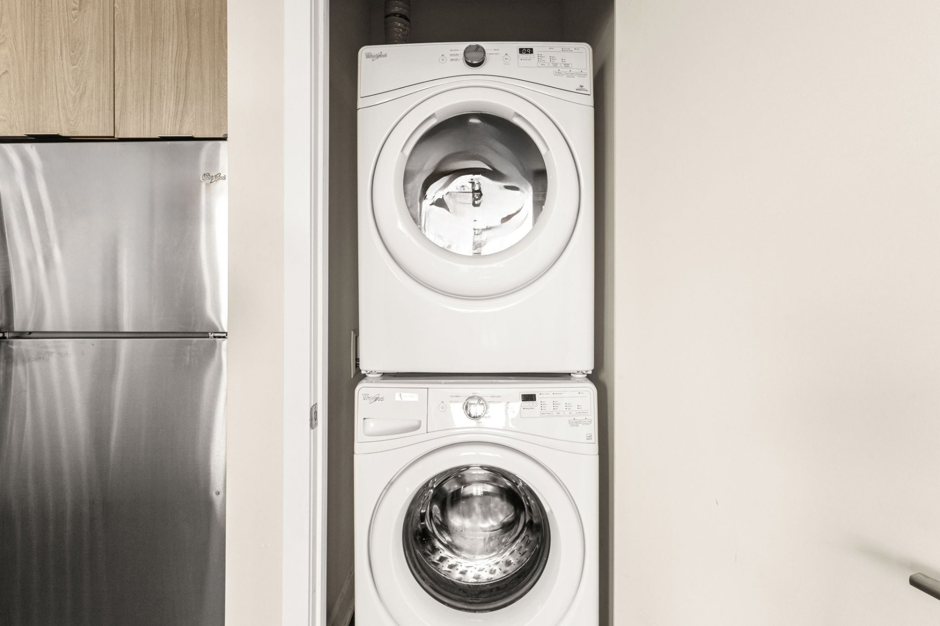 Réfrigérateur, cuisinière, lave-vaisselle, laveuse et sécheuse.