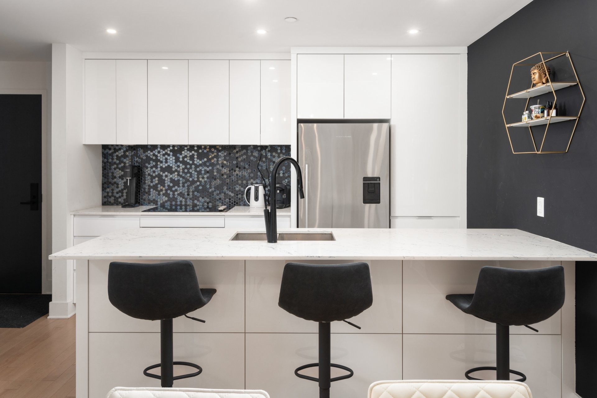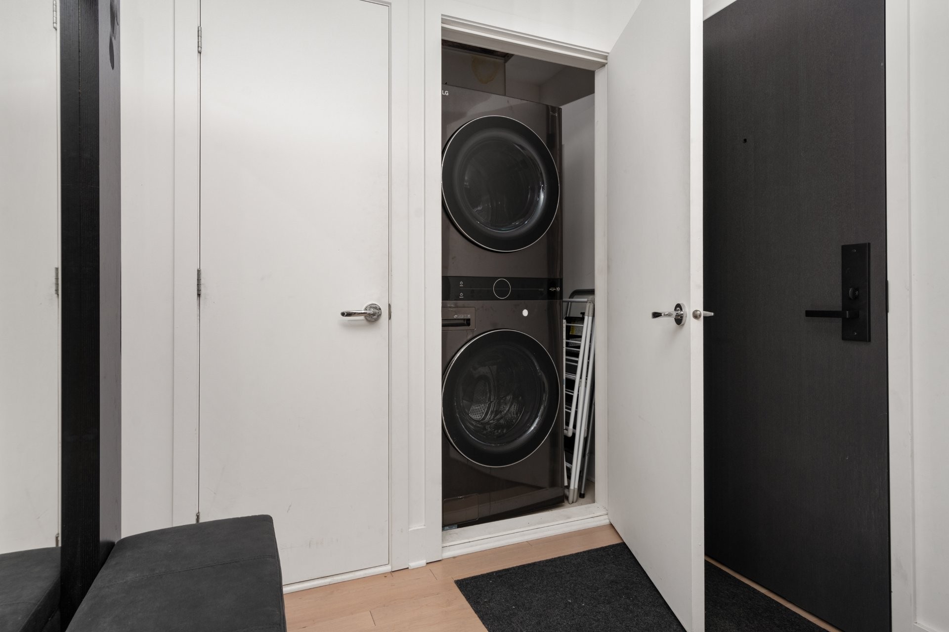 L'intérieur entièrement meublé présente de élégants planchers en bois franc et une cuisine moderne avec un comptoir Quartz White Attica, une arrivée d'eau pour le réfrigérateur et un espace de rangement généreux. La disposition réfléchie comprend un grand walk-in adjacent à la chambre principale, deux placards supplémentaires, ainsi qu'un espace polyvalent idéal pour un garde-manger ou un rangement additionnel.