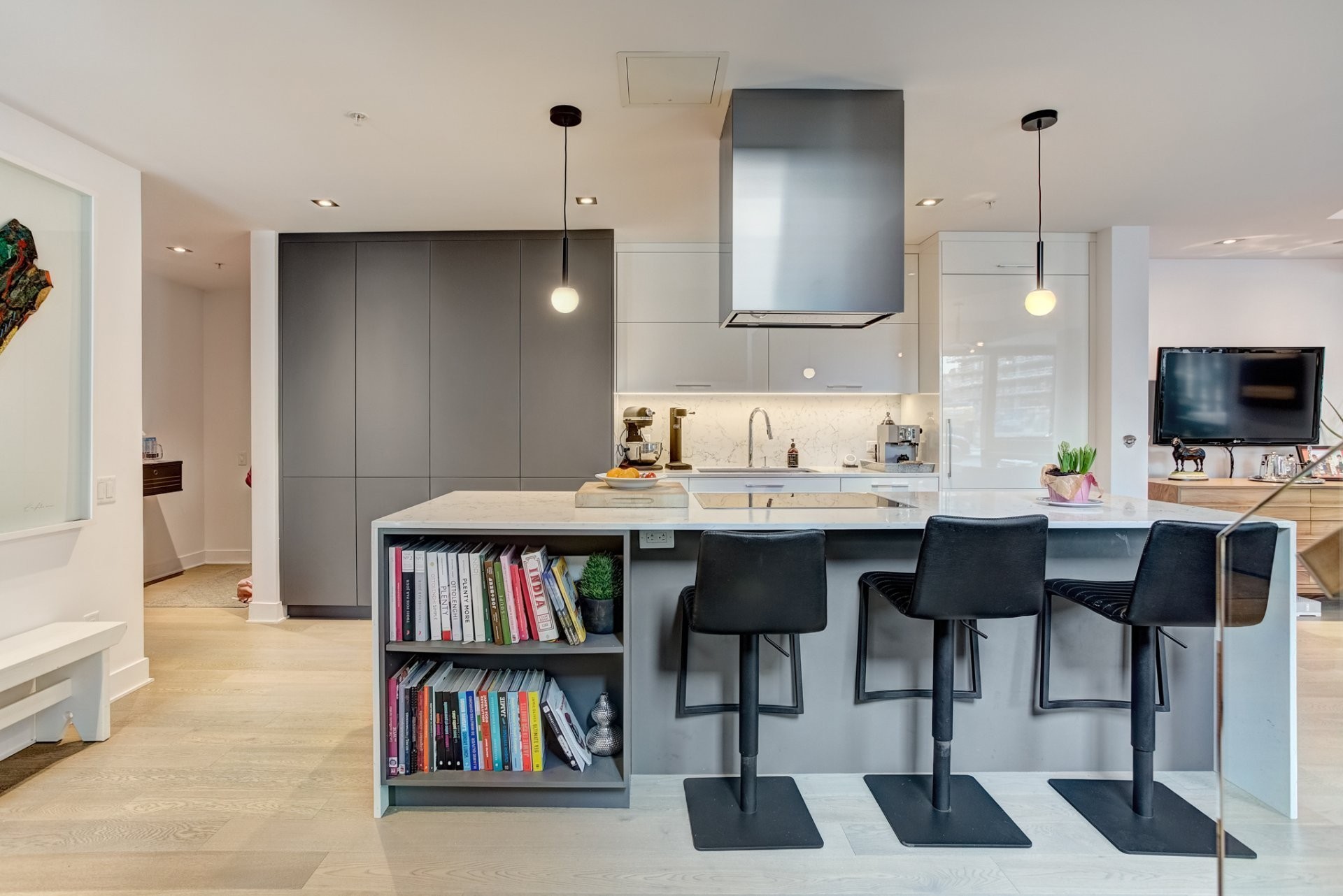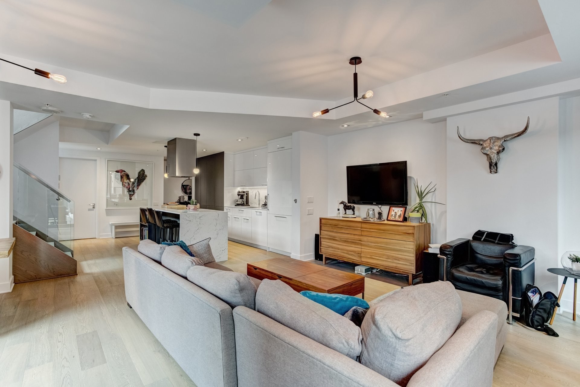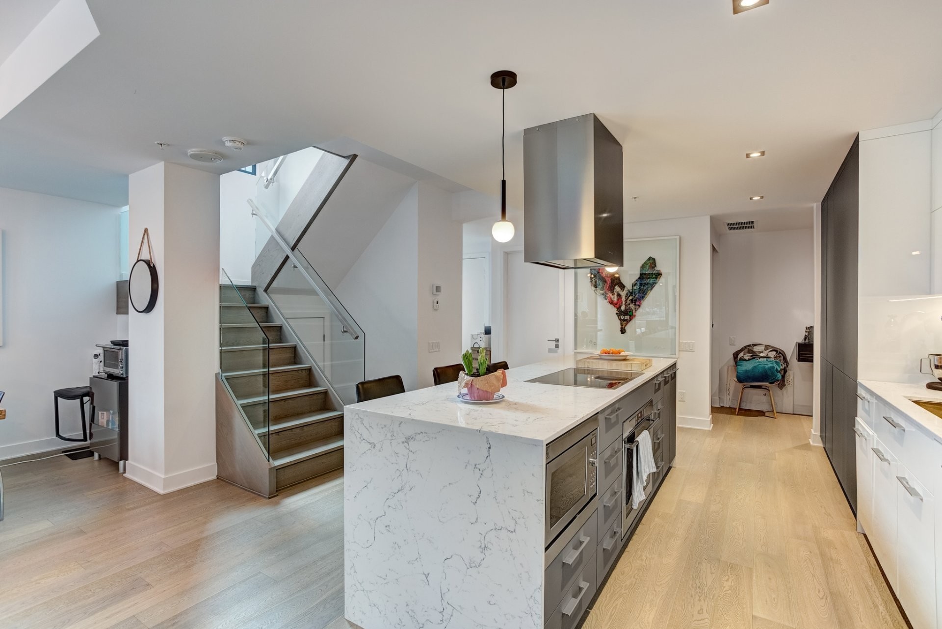 Tous les électroménagers (réfrigérateur, cuisinière, lave-vaisselle, micro-ondes, laveuse et sécheuse), l'éclairage entièrement automatisé et les couvre-fenêtres 3 chambres sont des stores occultants Lutron. 1 garage, 2 espaces de rangements, 1 supports à vélo.