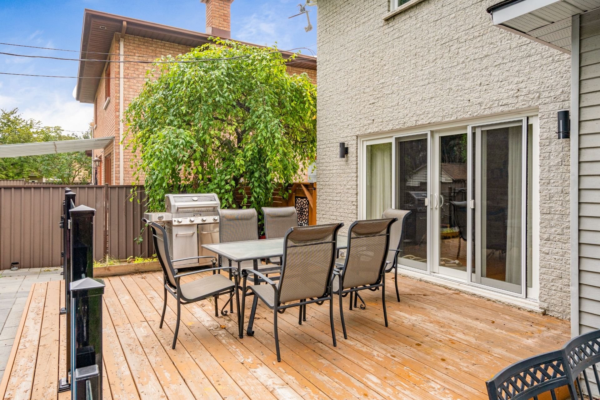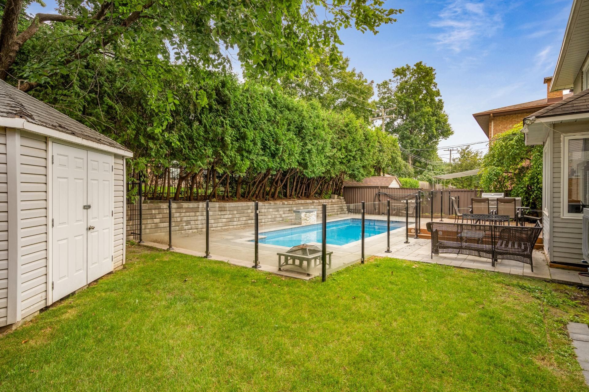 À l'extérieur, la cour arrière intime se transforme en véritable havre estival, idéal pour les barbecues, les réceptions ou la détente au bord de la piscine (sys. sel). Les arbres matures assurent intimité et tranquillité, tandis qu'une clôture récemment installée encadre la propriété. L'entrée de garage et le garage offrent amplement d'espace pour le stationnement et le rangement.