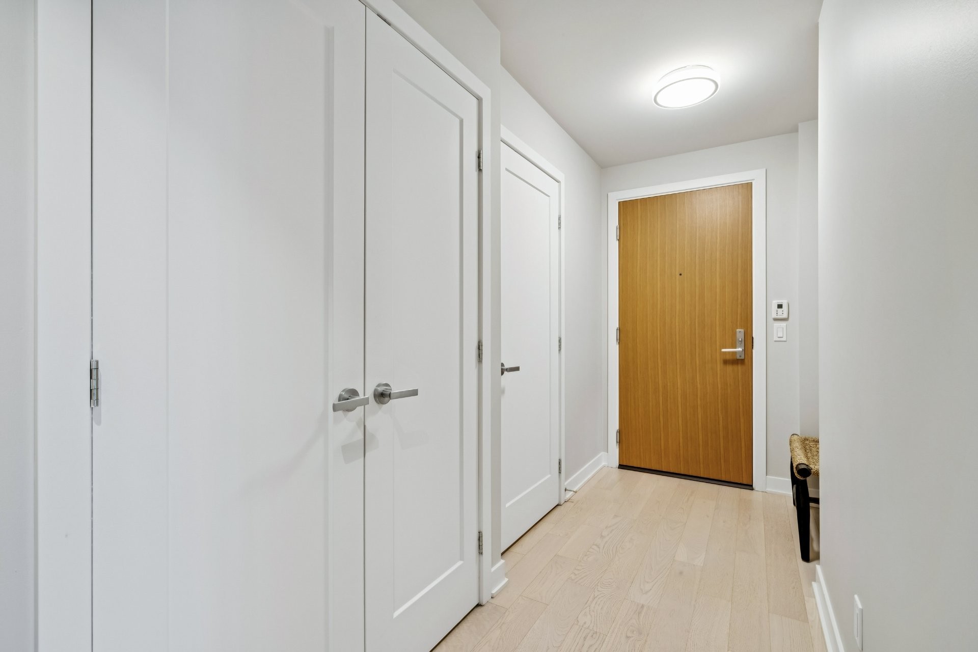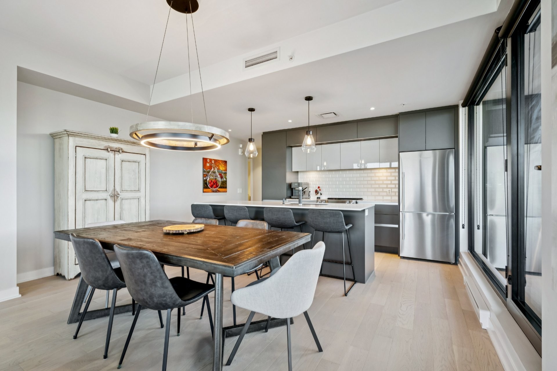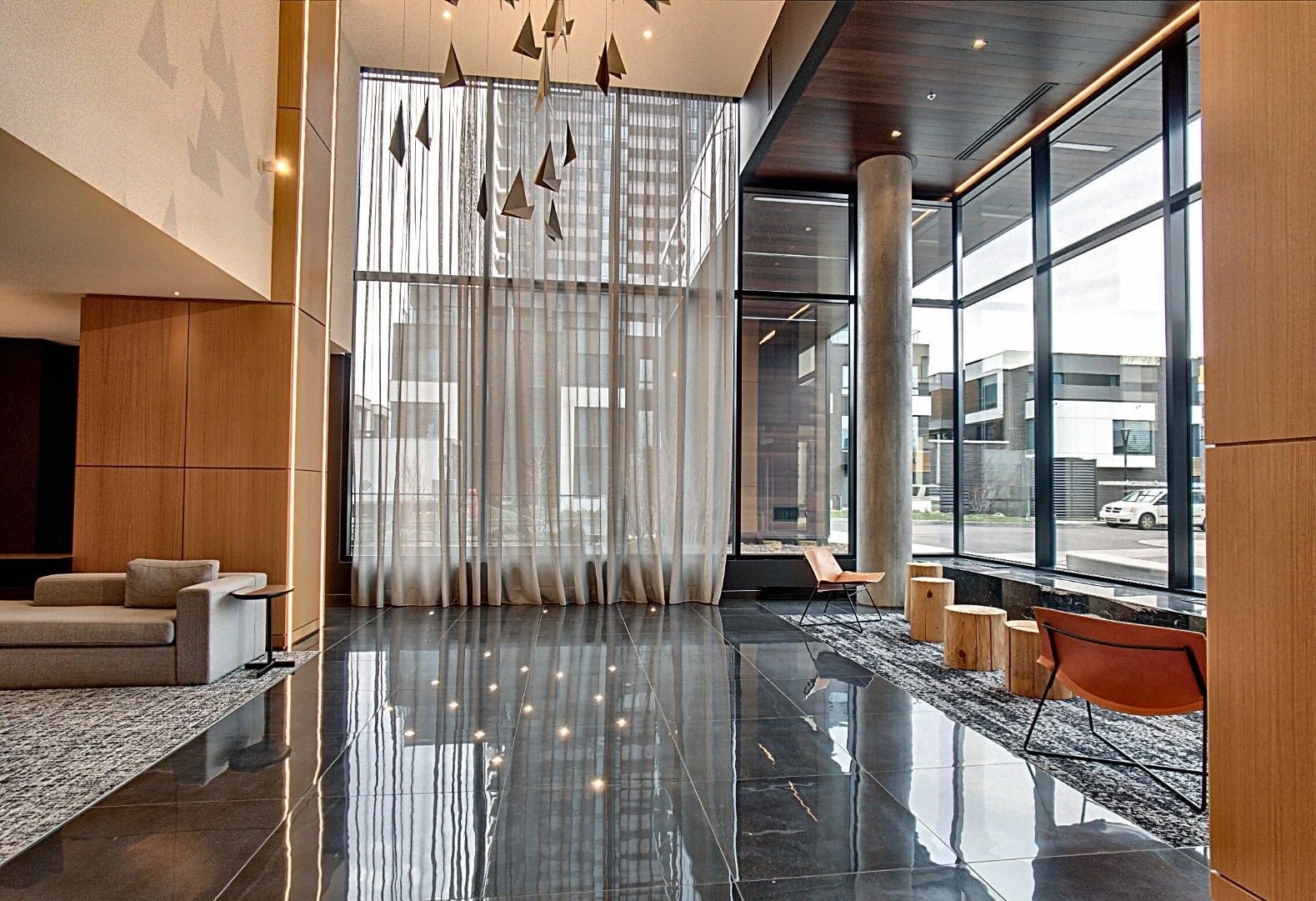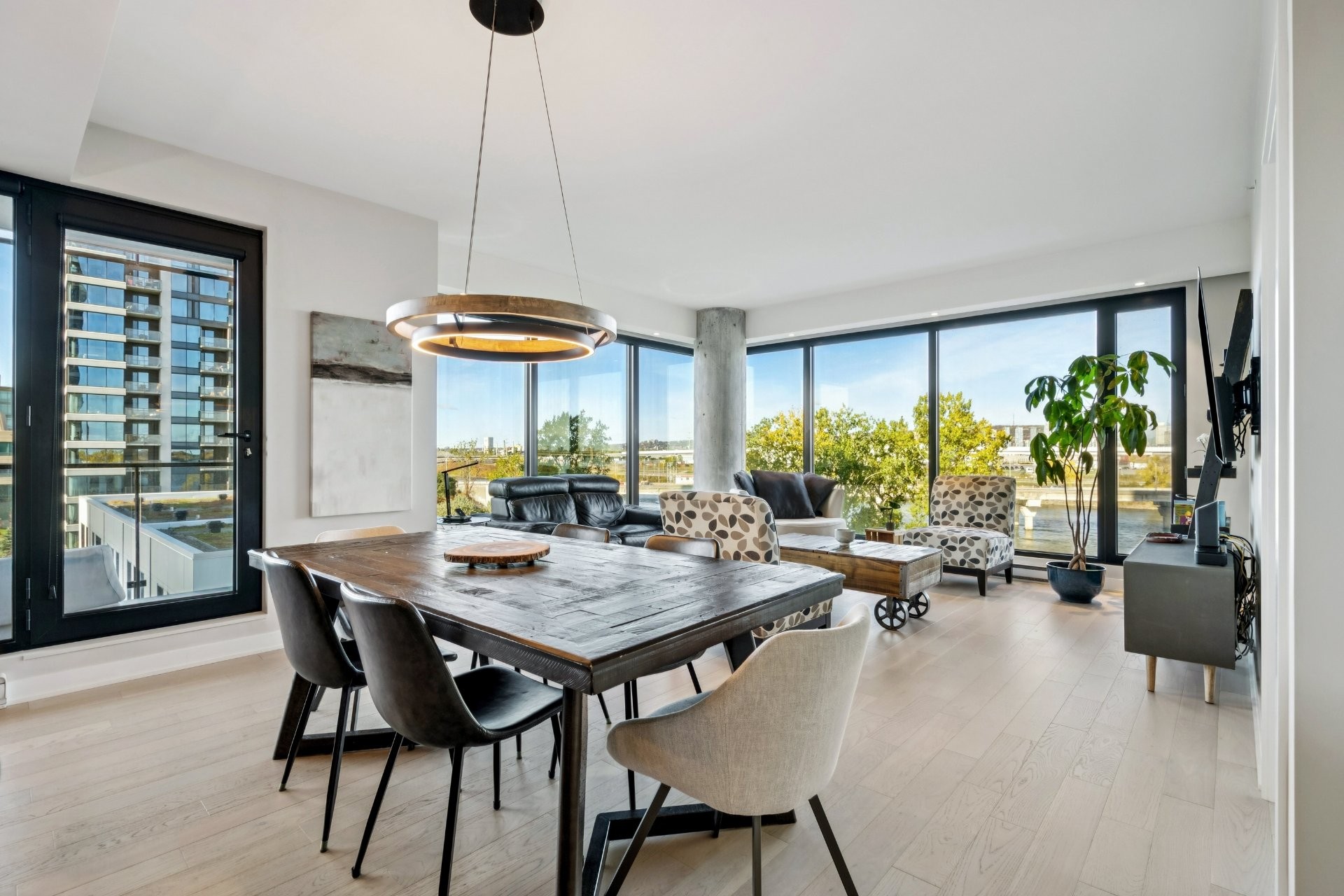 Dès l'entrée, vous serez accueilli par un vaste hall avec salle de lavage indépendante -- un atout rare en condo. L'aire de vie décloisonnée comprend une cuisine moderne avec îlot, une salle à manger conviviale et un salon baigné de lumière grâce à de grandes fenêtres pleine hauteur. Les habillages de fenêtres sur mesure, dont des toiles solaires motorisées Somfy dans le salon, ajoutent une touche de confort et d'élégance.