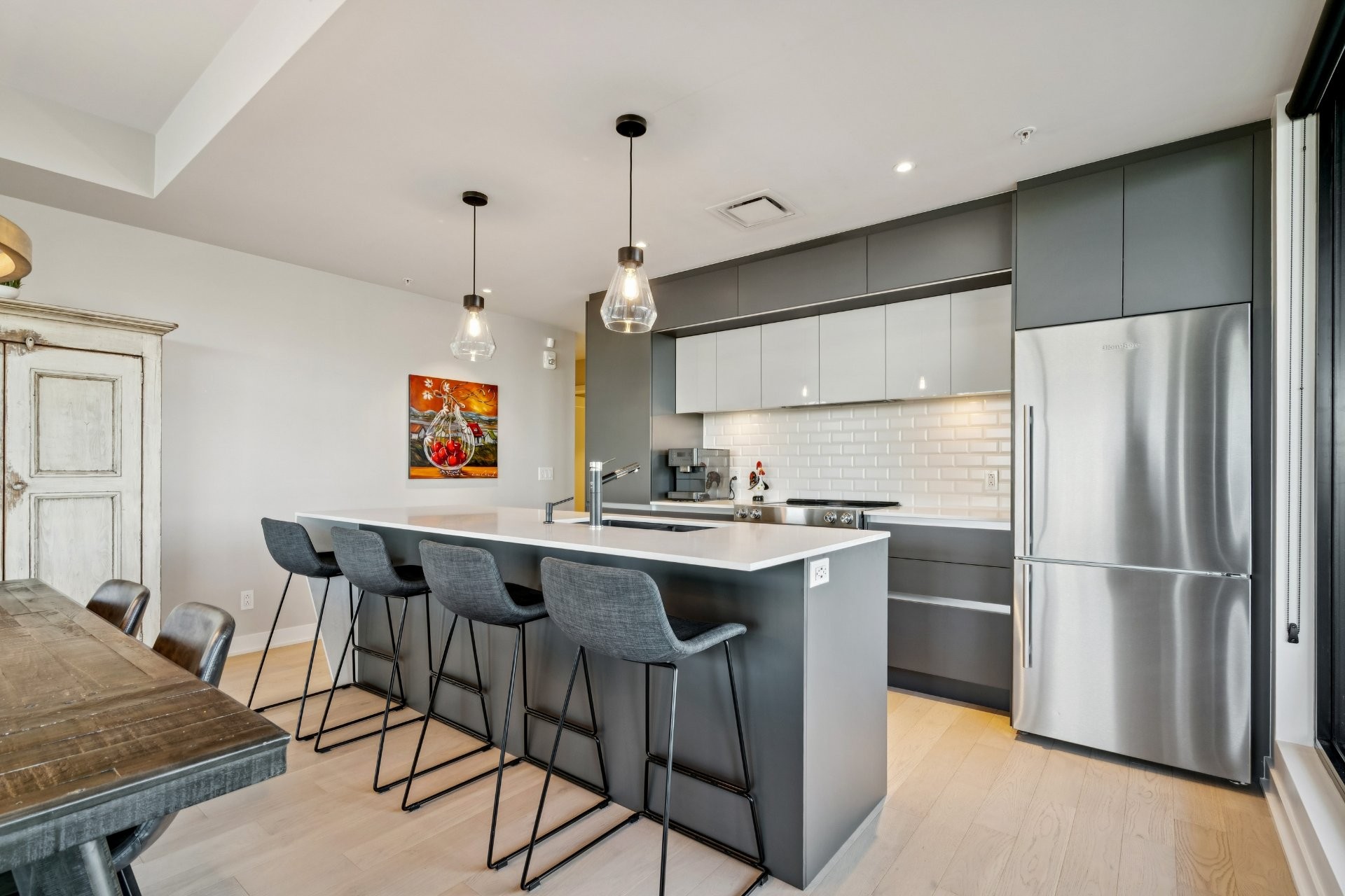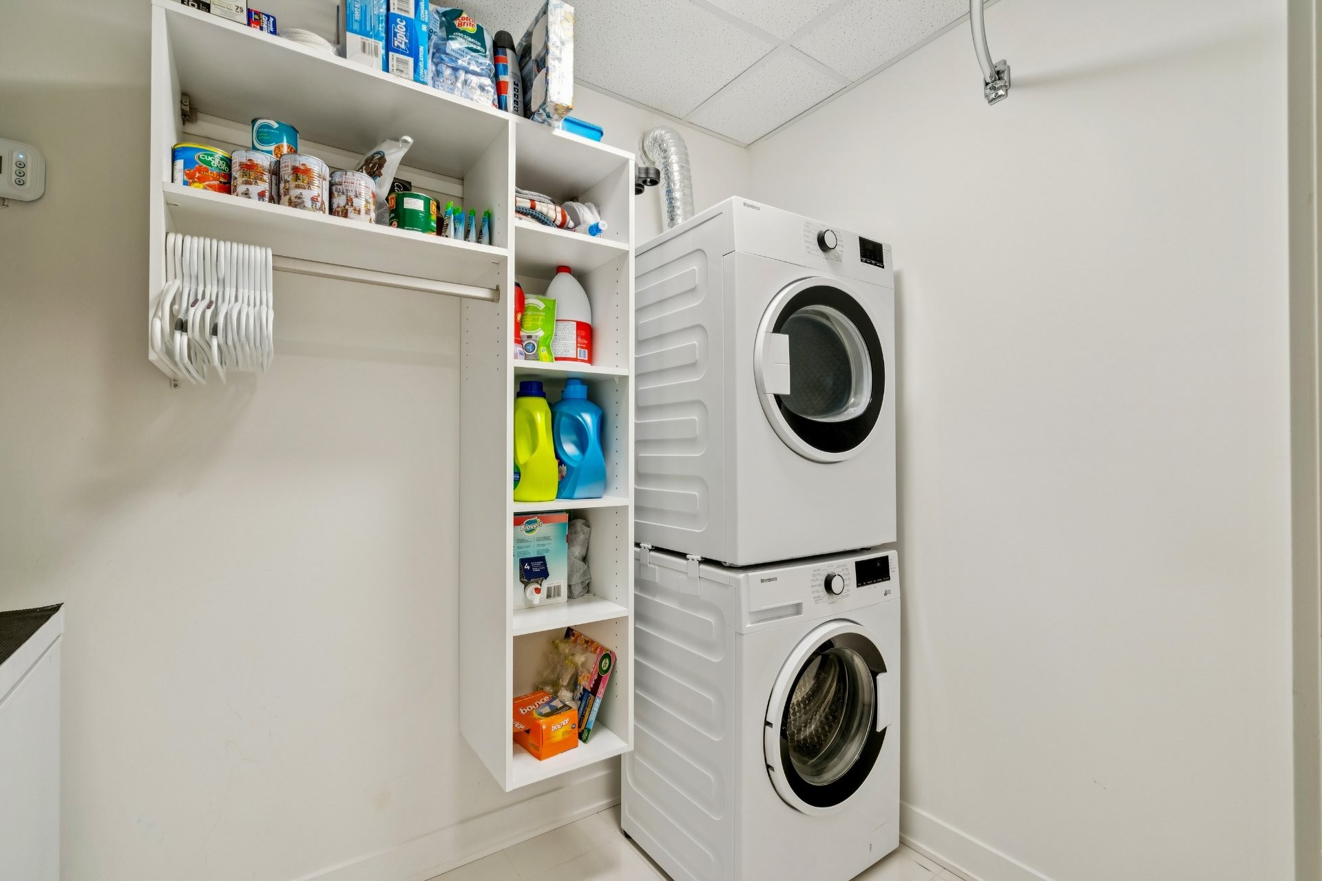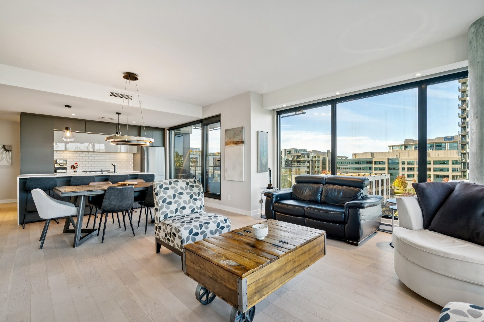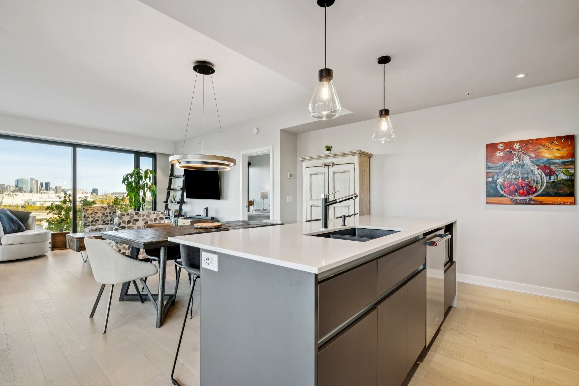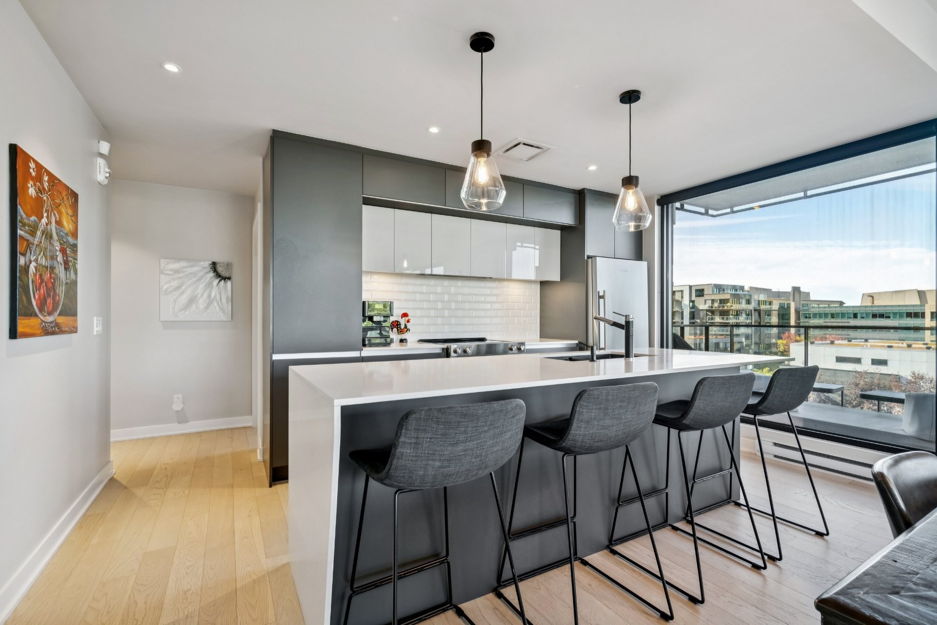 Dès l'entrée, vous serez accueilli par un vaste hall avec salle de lavage indépendante -- un atout rare en condo. L'aire de vie décloisonnée comprend une cuisine moderne avec îlot, une salle à manger conviviale et un salon baigné de lumière grâce à de grandes fenêtres pleine hauteur. Les habillages de fenêtres sur mesure, dont des toiles solaires motorisées Somfy dans le salon, ajoutent une touche de confort et d'élégance.