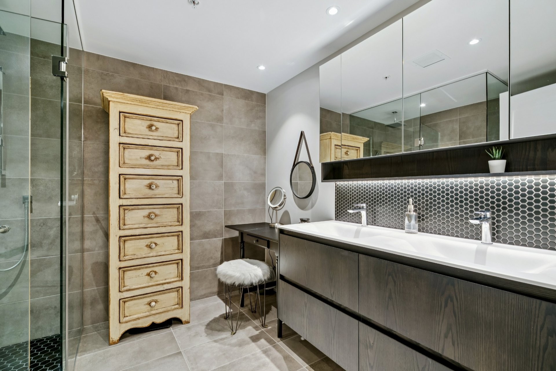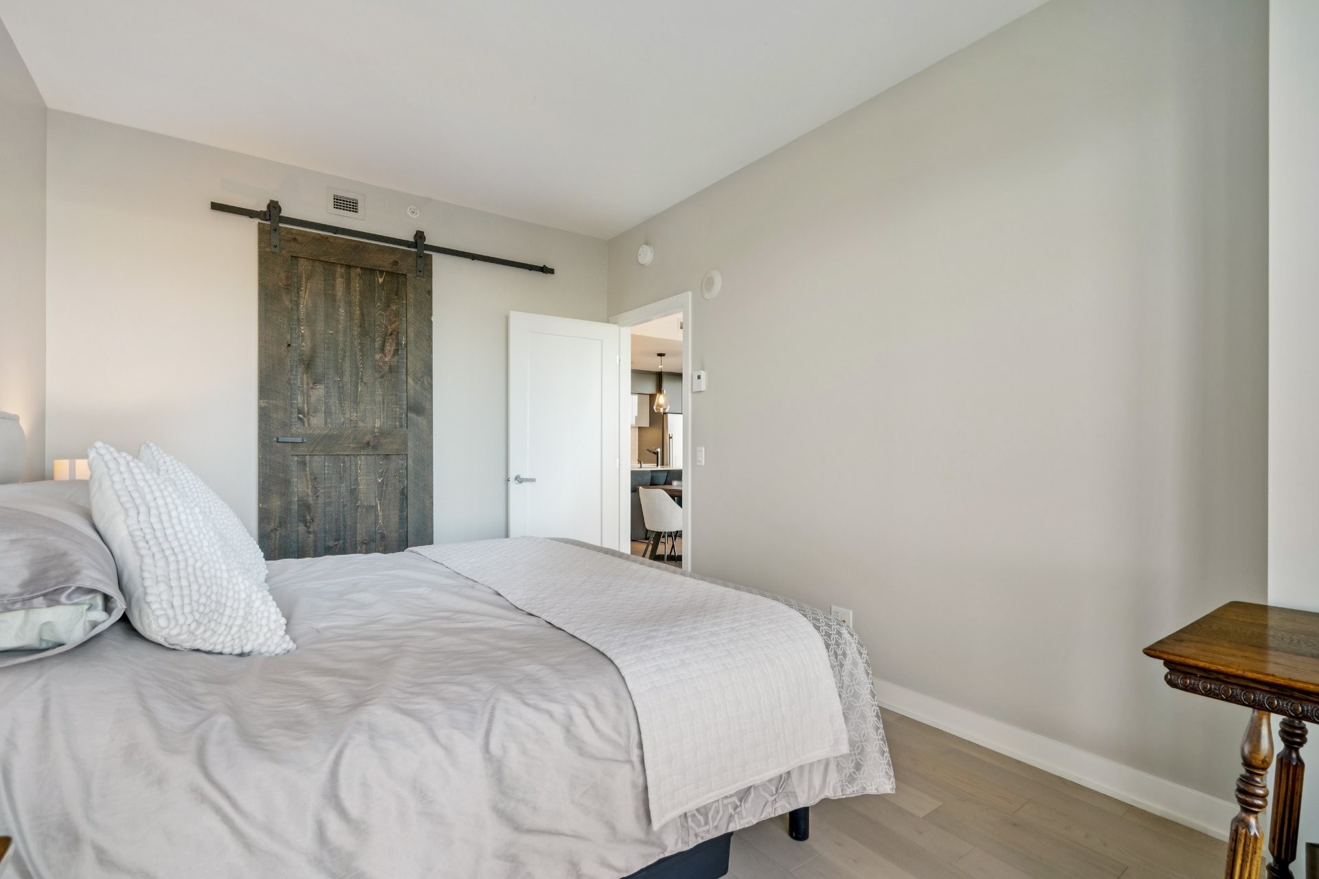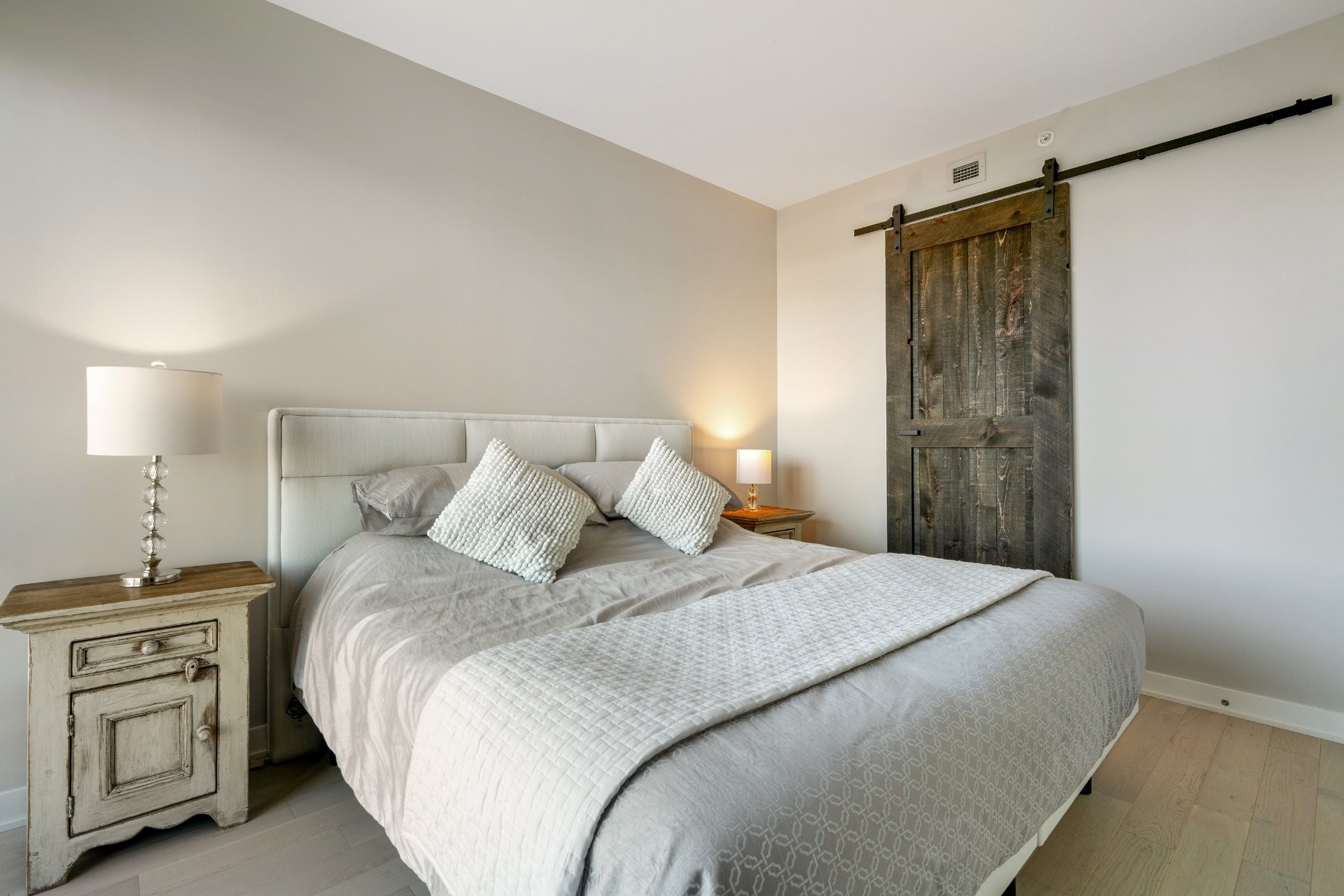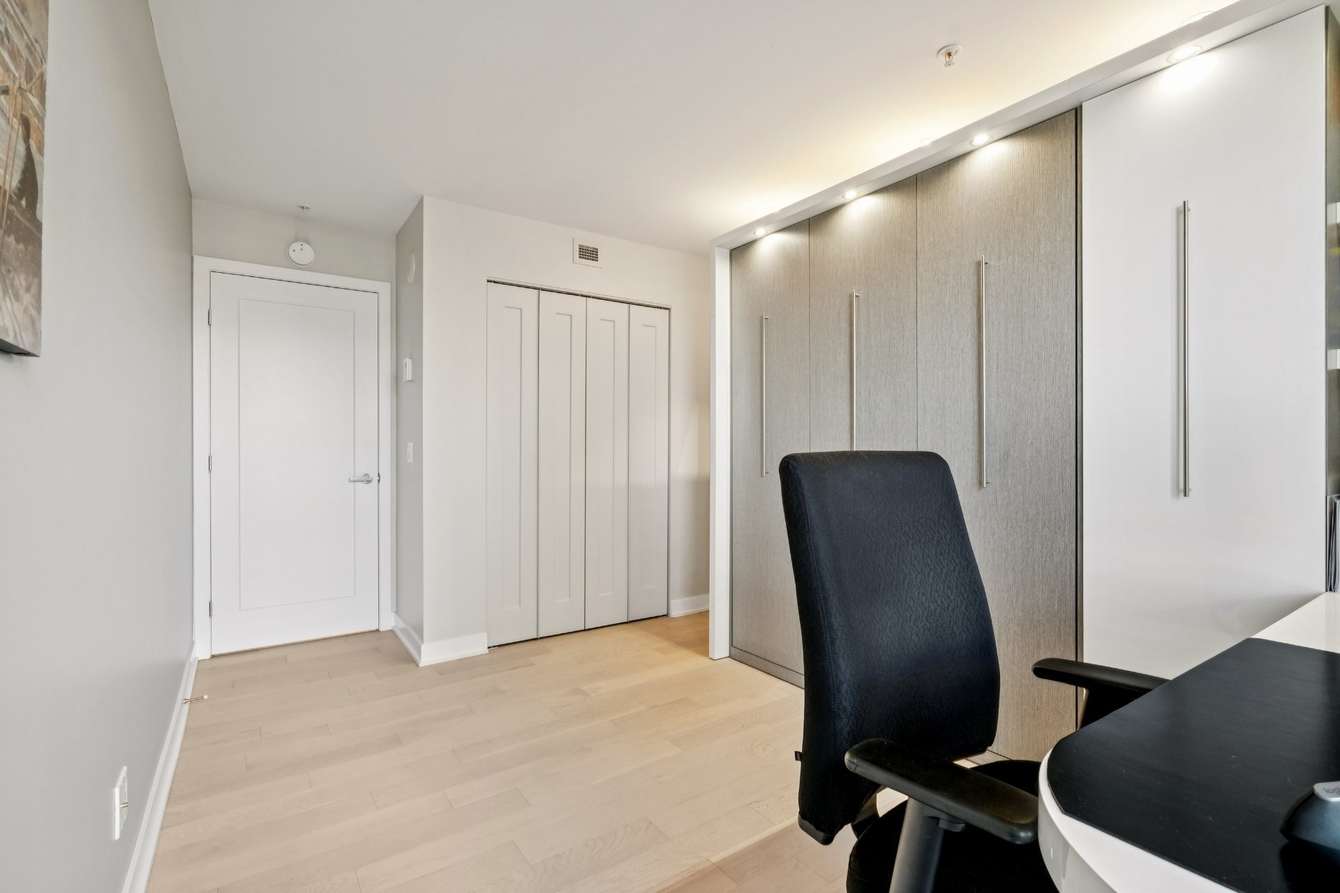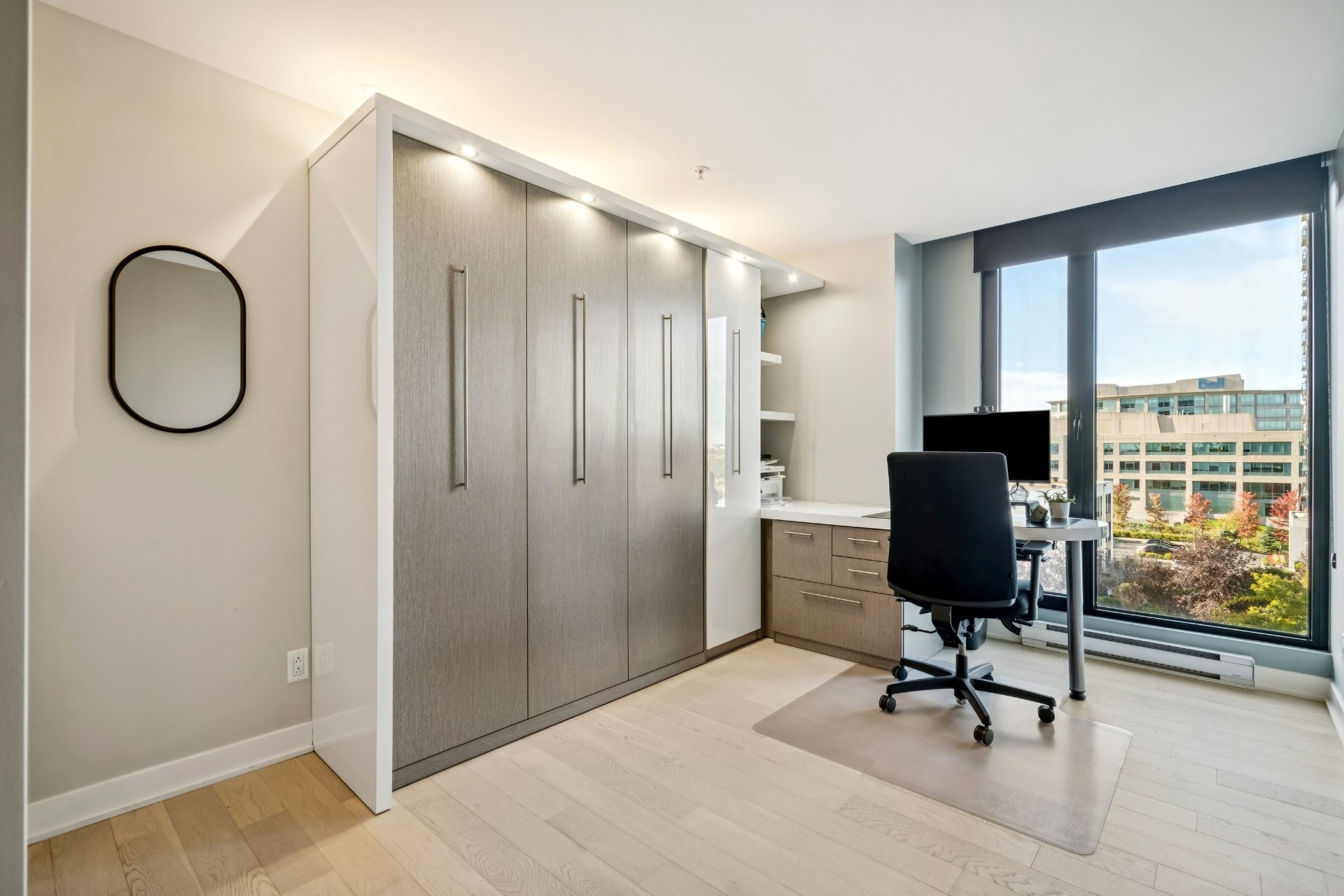 La chambre principale propose un espace intime avec garde-robe walk-in et salle de bain attenante. La deuxième chambre, polyvalente, est aménagée en bureau avec un lit escamotable queen sur mesure et un bureau intégré -- une solution idéale pour concilier télétravail et hébergement d'invités.