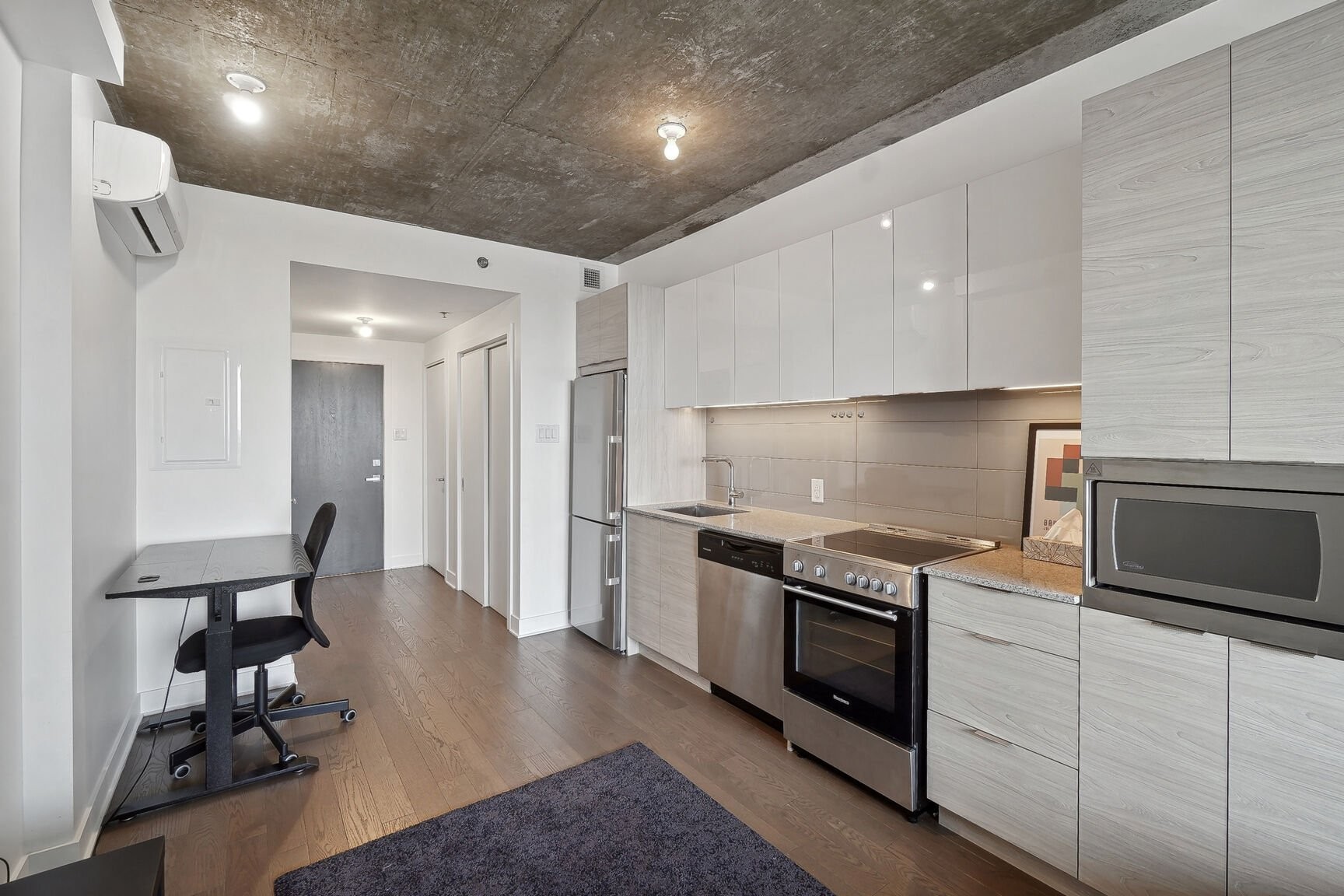 Unité de coin partiellement meublé moderne au YUL avec 2 chambres, 1 salle de bain et espace lumineux à aire ouverte. Fenêtres pleine hauteu...