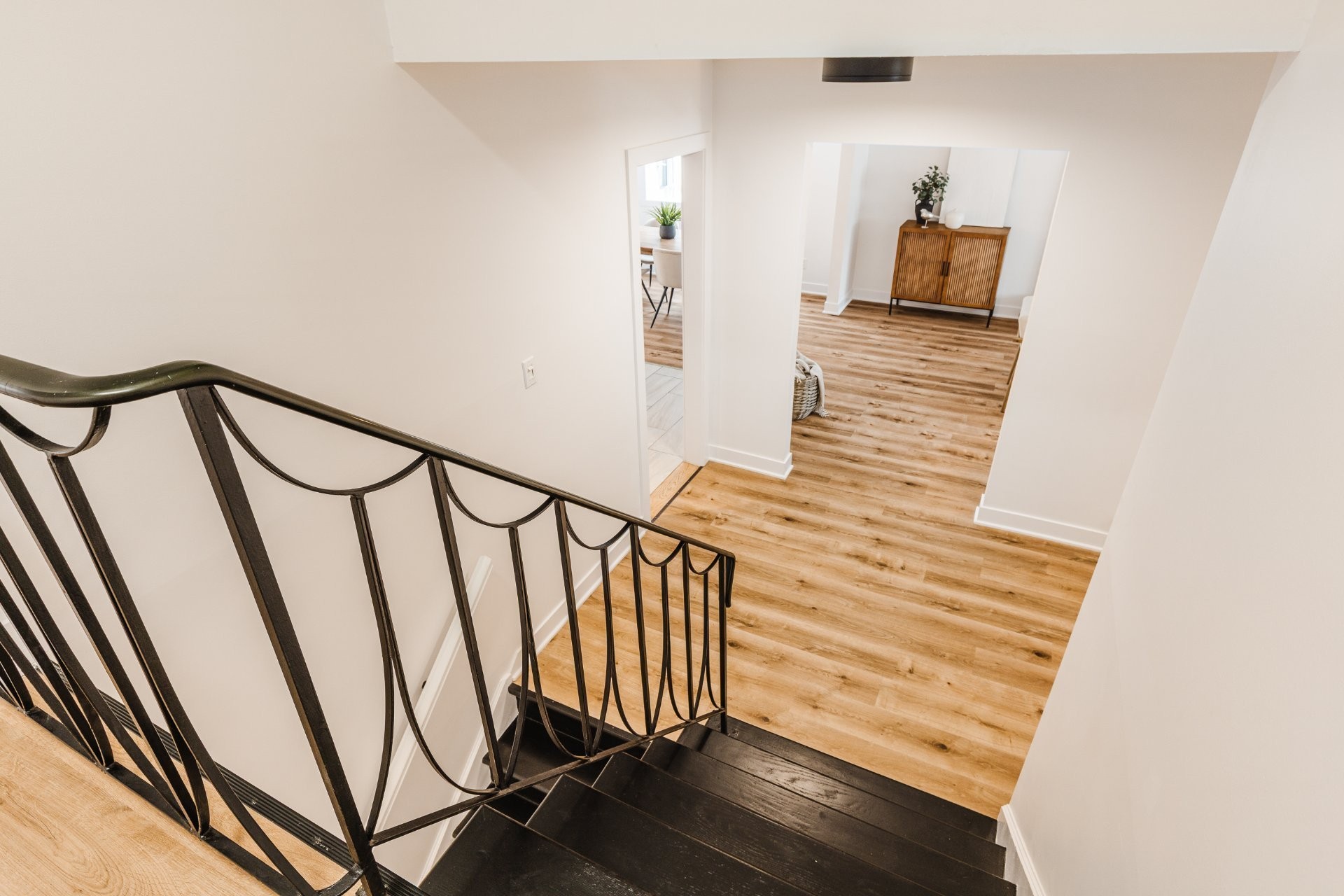 Quelques marches plus haut, on retrouve quatre chambres de bonnes dimensions, dont une suite principale avec salle de bain attenante, une salle de bain familiale spacieuse et un immense walk-in dans le couloir, idéal pour les familles actives ou en croissance.