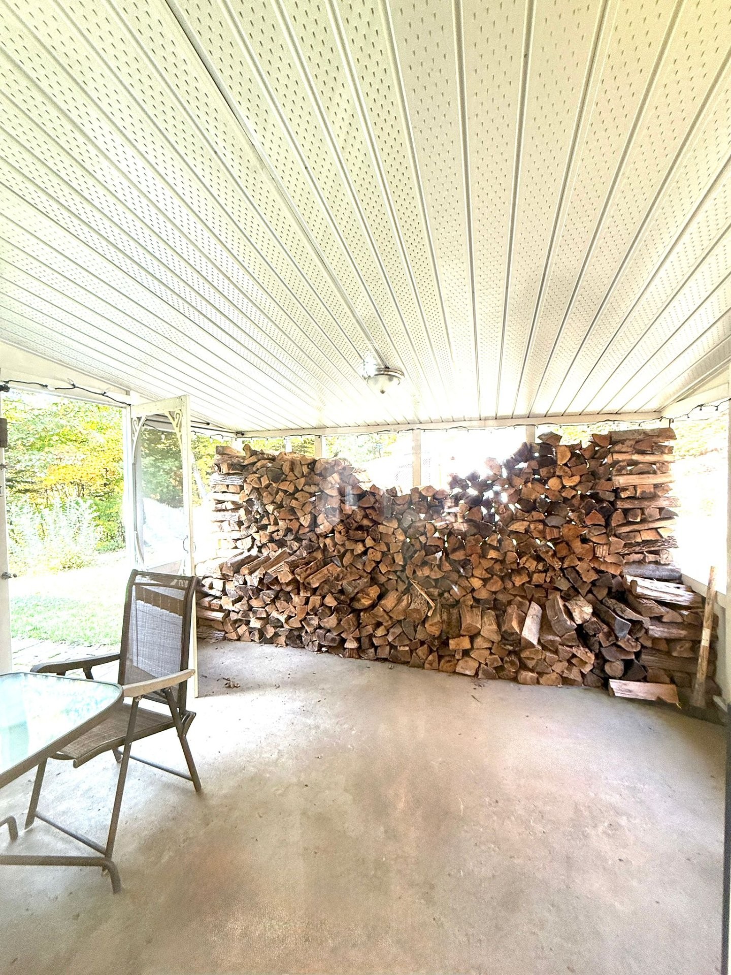 Lit escamotable, bureau, congélateur, bois pour le foyer, balançoire extérieure