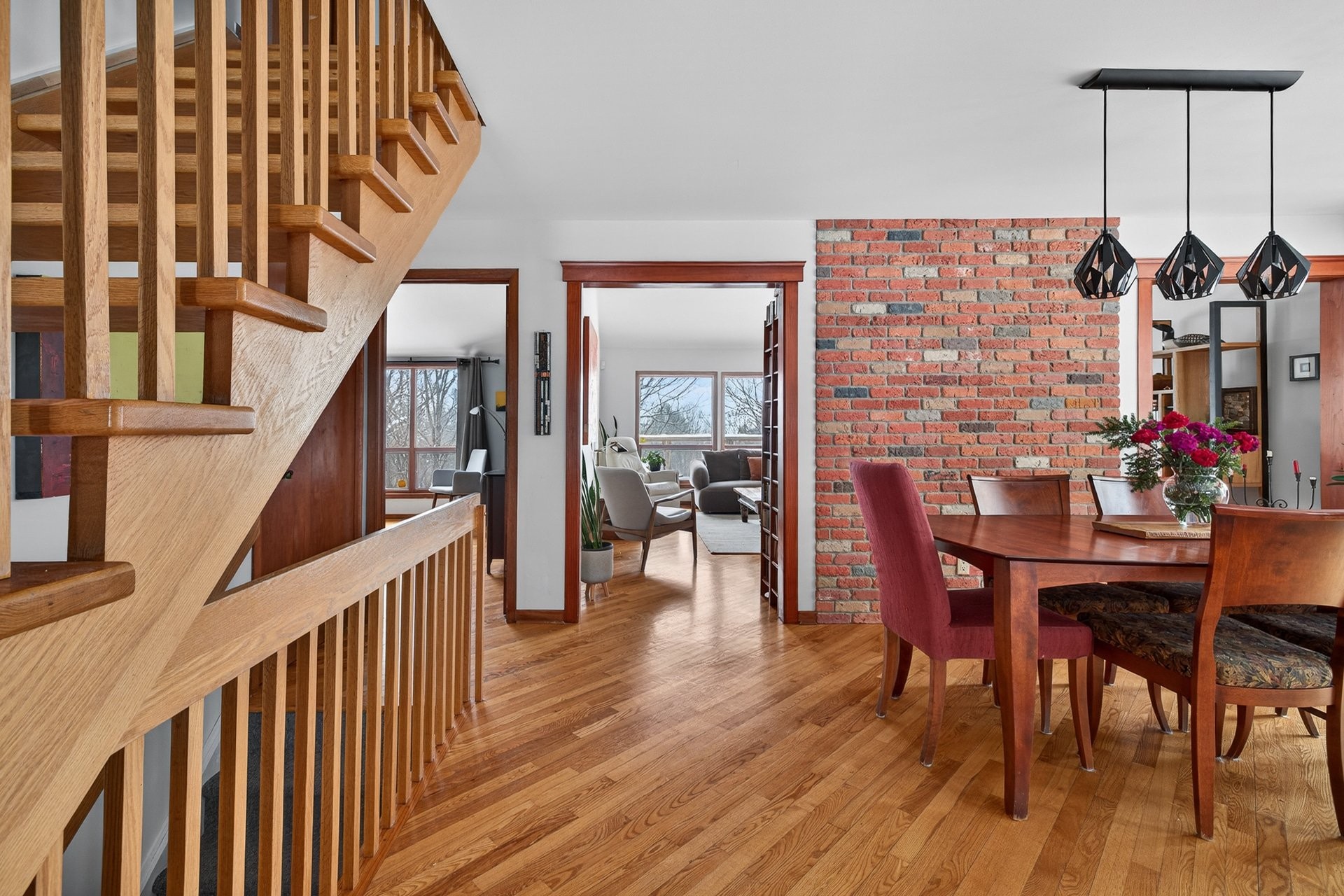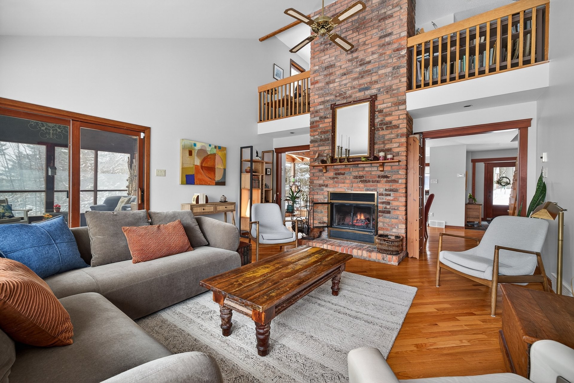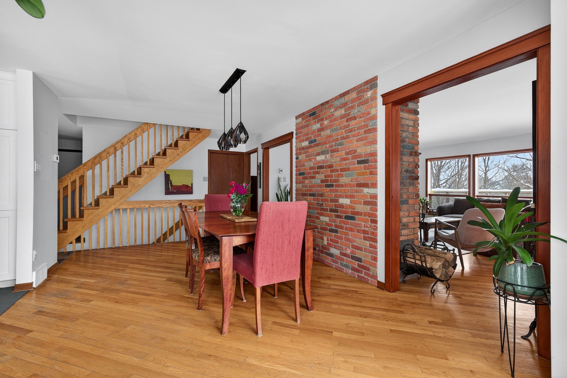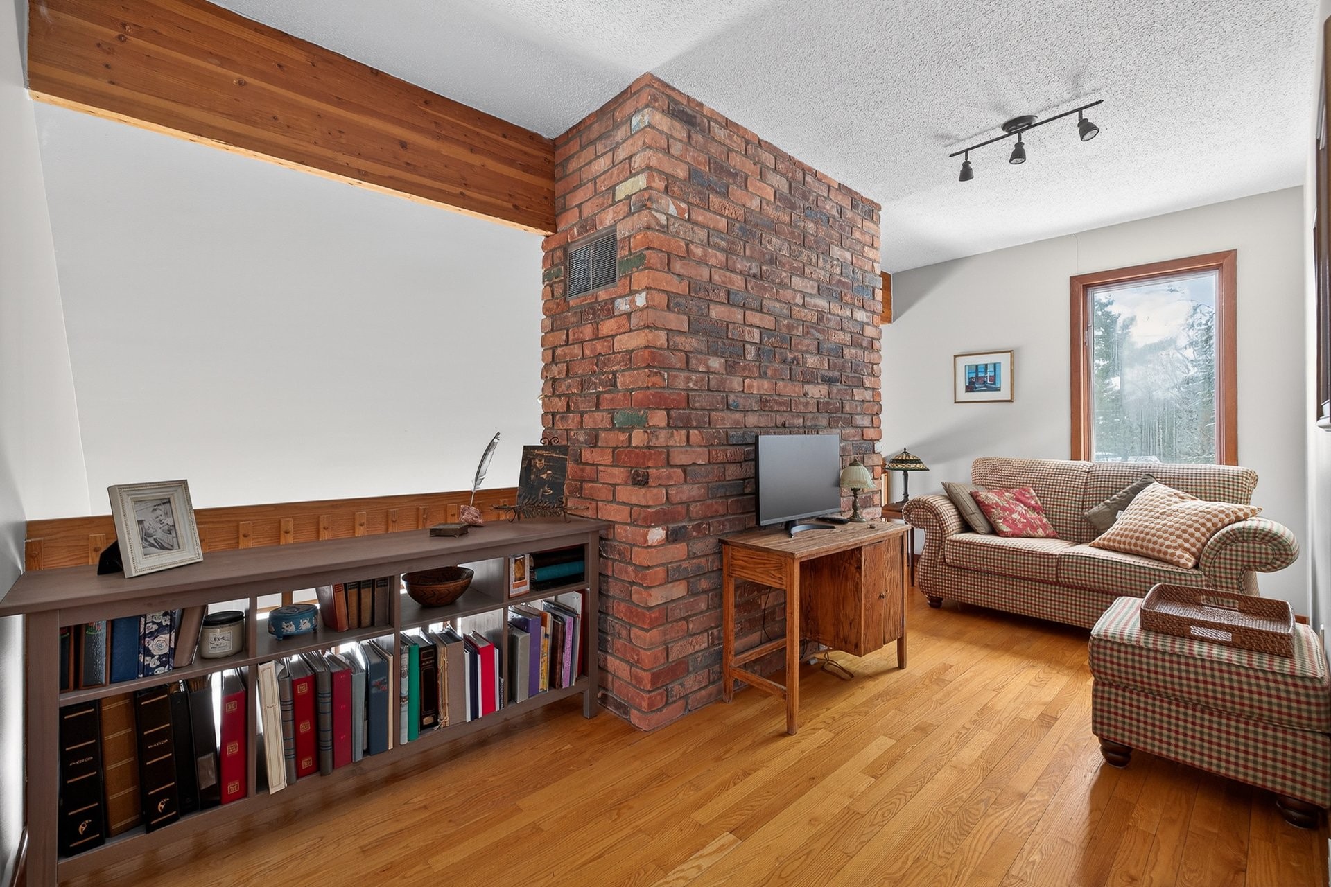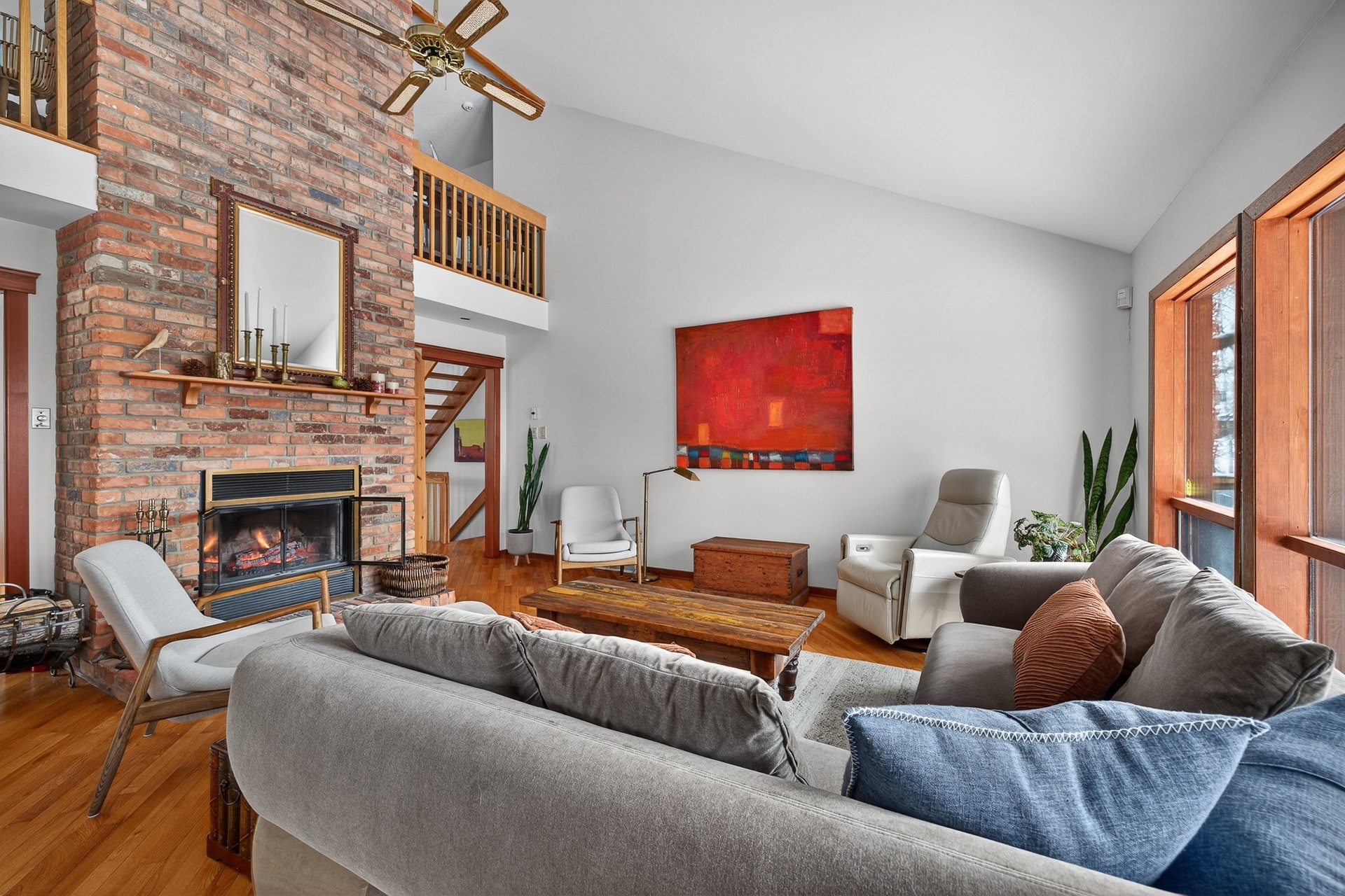 Dès l'entrée, on ressent immédiatement l'atmosphère chaleureuse qui caractérise cette demeure. Le salon, spectaculaire avec son plafond cathédral, offre un volume impressionnant tout en conservant une ambiance enveloppante grâce au magnifique foyer au bois, dont le manteau de briques s'élève jusqu'au plafond. Cette pièce centrale, vaste et lumineuse, devient un véritable lieu de rassemblement.