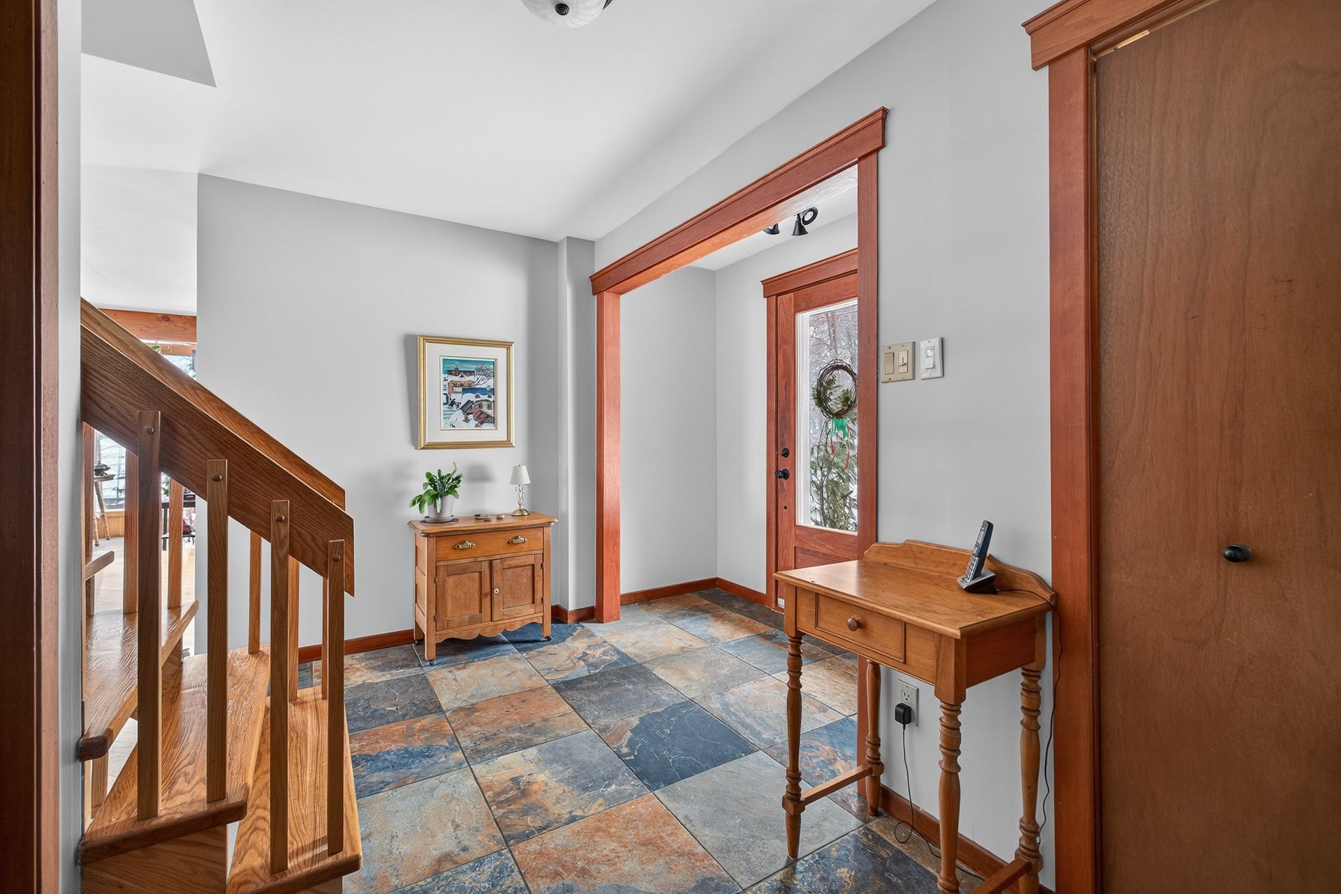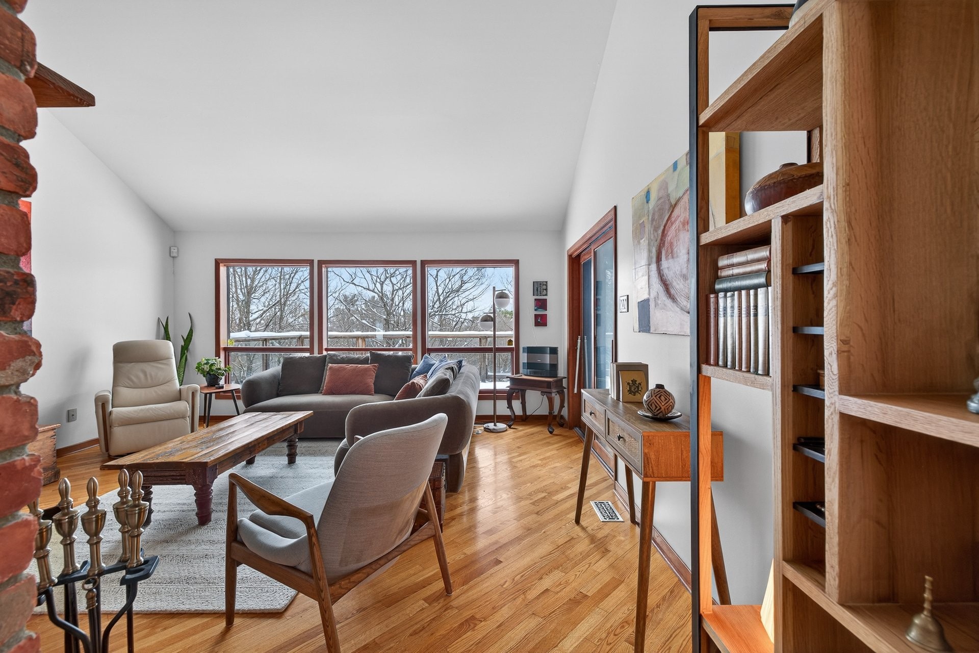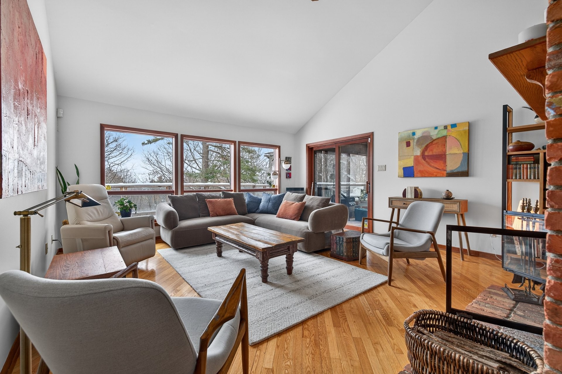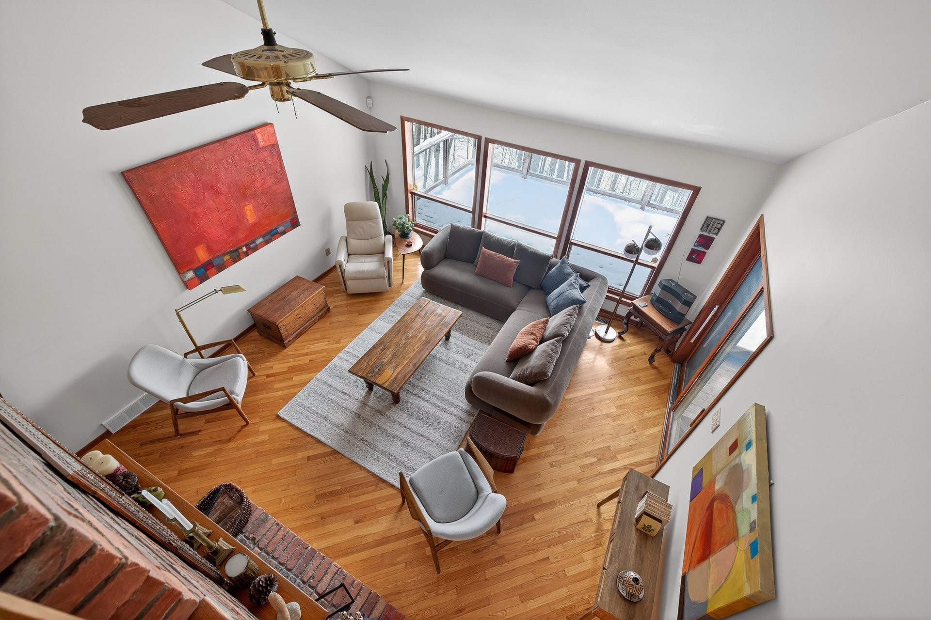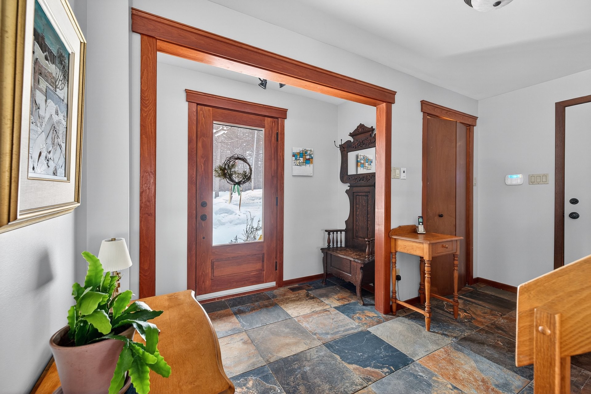 Dès l'entrée, on ressent immédiatement l'atmosphère chaleureuse qui caractérise cette demeure. Le salon, spectaculaire avec son plafond cathédral, offre un volume impressionnant tout en conservant une ambiance enveloppante grâce au magnifique foyer au bois, dont le manteau de briques s'élève jusqu'au plafond. Cette pièce centrale, vaste et lumineuse, devient un véritable lieu de rassemblement.