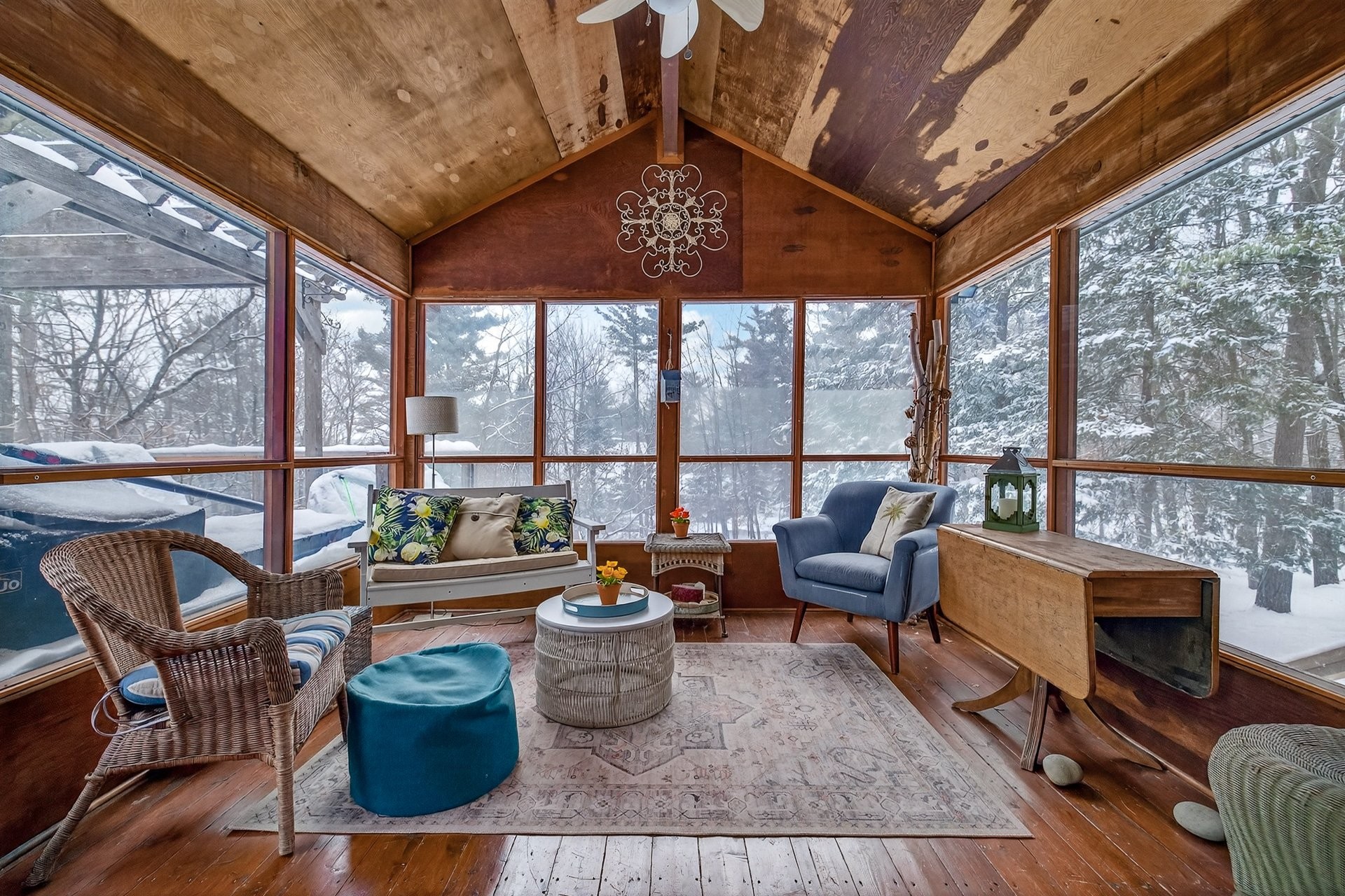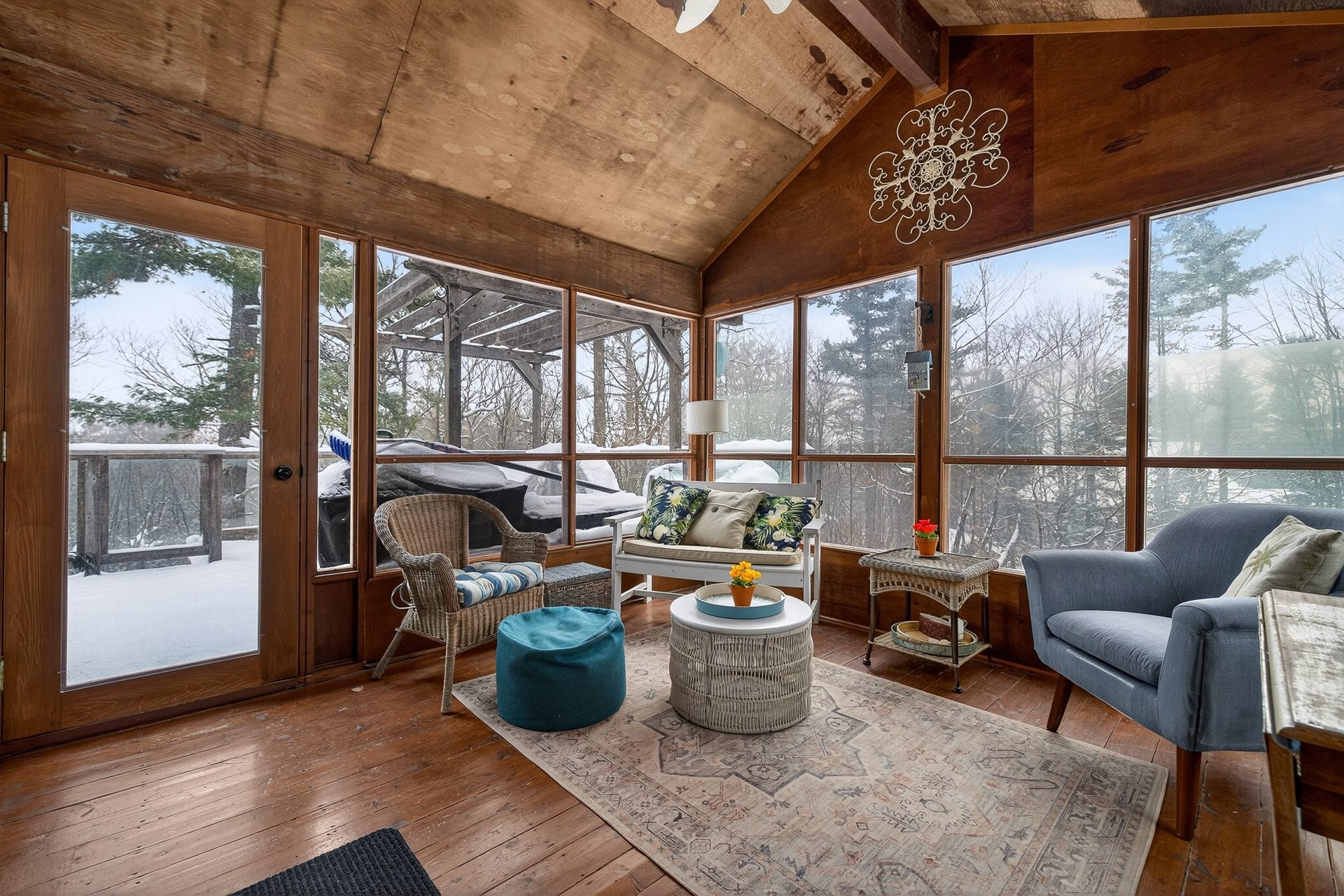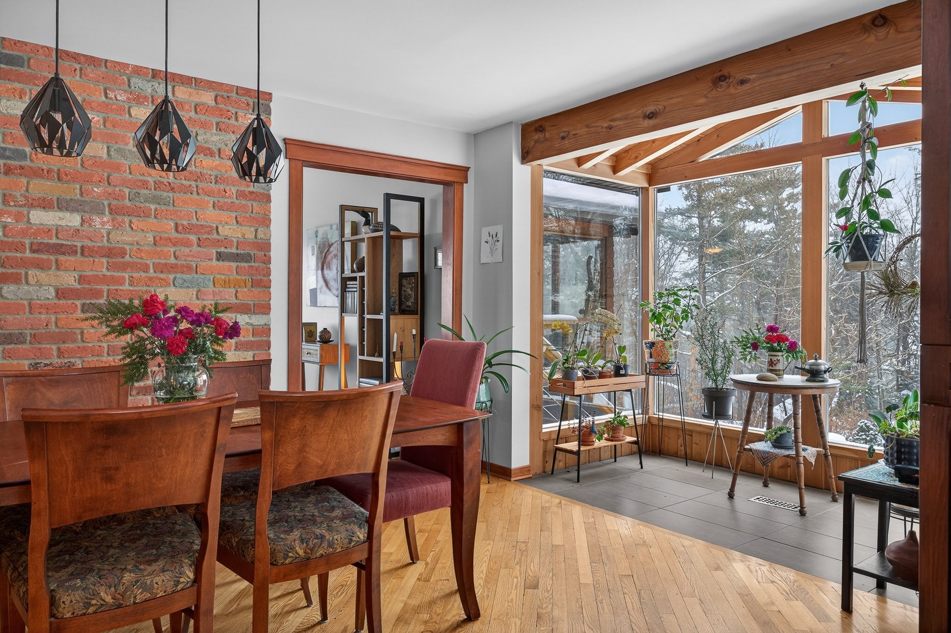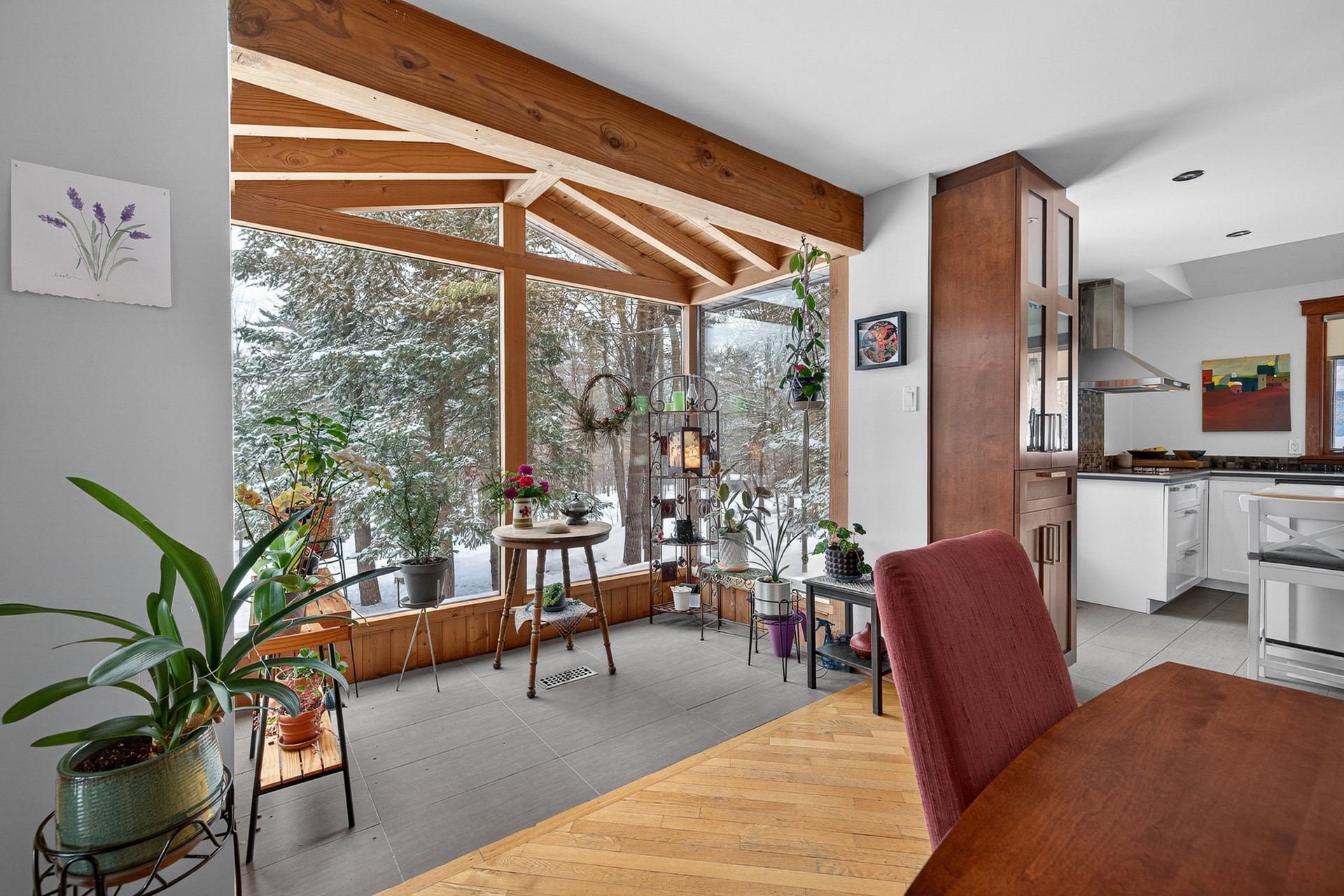 Adjacente au salon, la véranda entourée de fenêtres invite à la détente en toute saison. Baignée de lumière naturelle et ouverte sur la nature environnante, elle constitue un espace polyvalent idéal pour un coin lecture, un bureau inspirant ou une pièce détente.