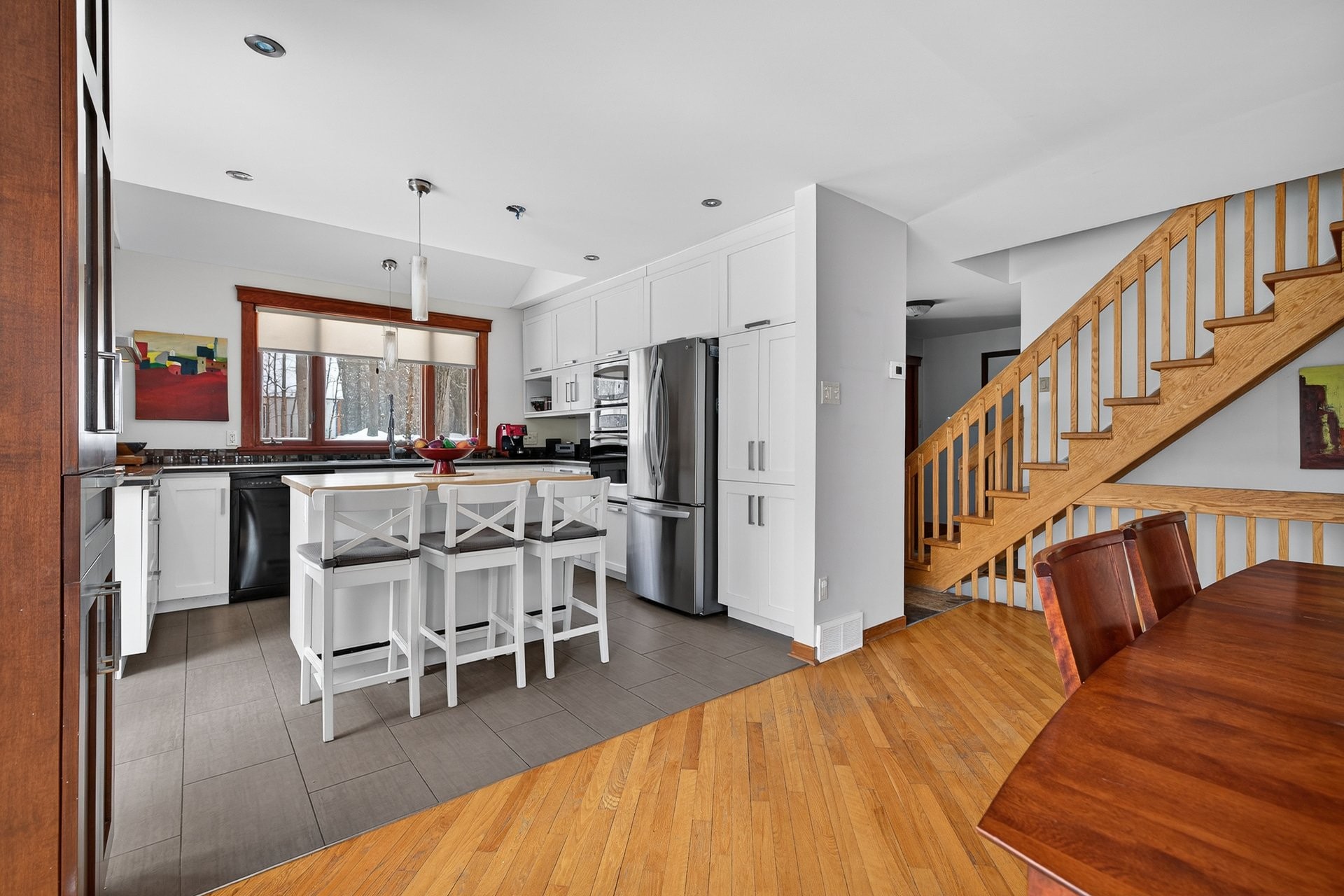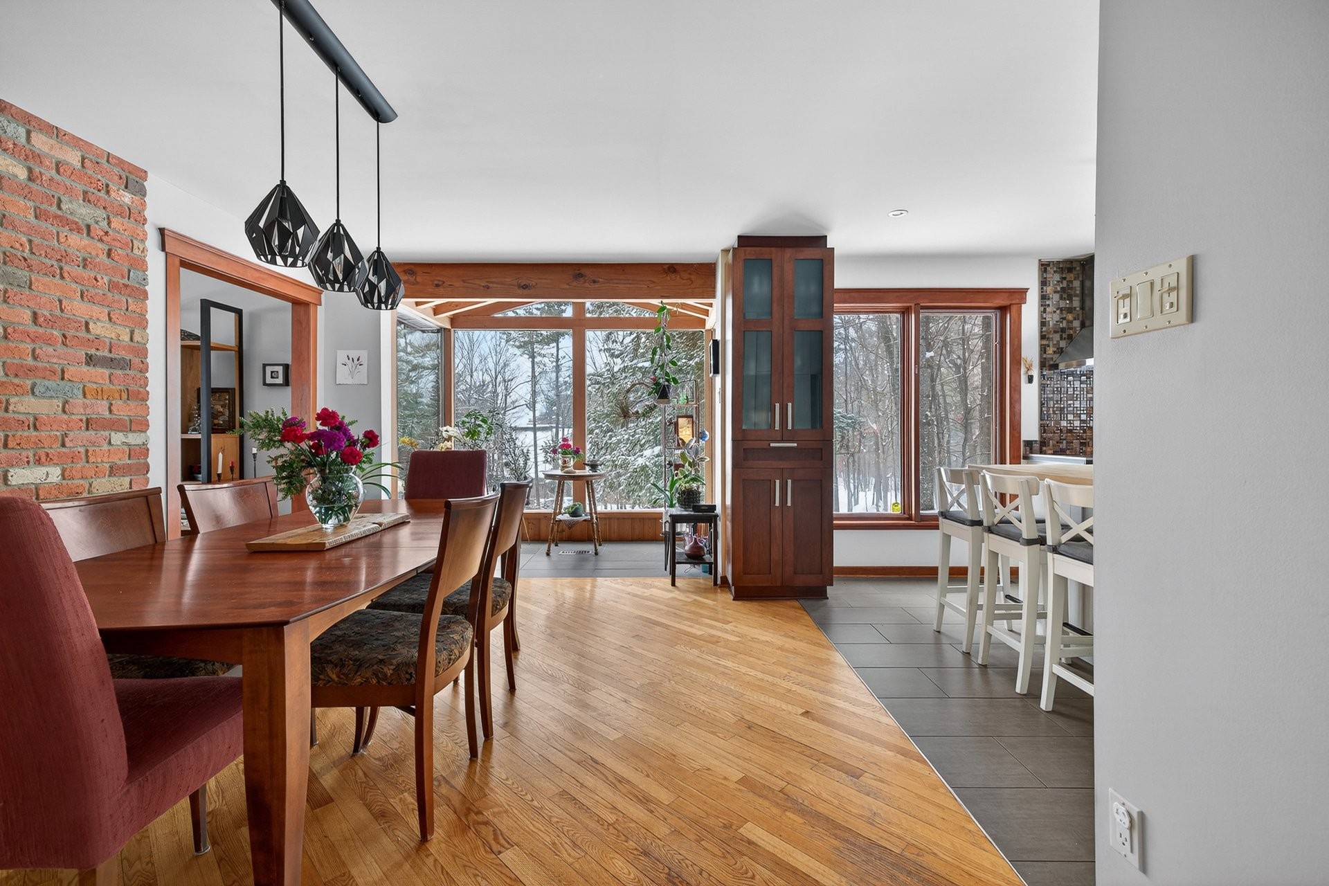 La salle à manger, spacieuse et conviviale, propose un charmant espace vitré parfait pour un coin café ou pour mettre vos plantes en valeur. Elle s'ouvre harmonieusement sur la grande cuisine aux teintes blanches intemporelles. Fonctionnelle et généreuse, celle-ci offre un vaste îlot central pouvant accueillir trois personnes assises ainsi que de nombreuses armoires pleine hauteur, répondant parfaitement aux besoins du quotidien comme aux réceptions.