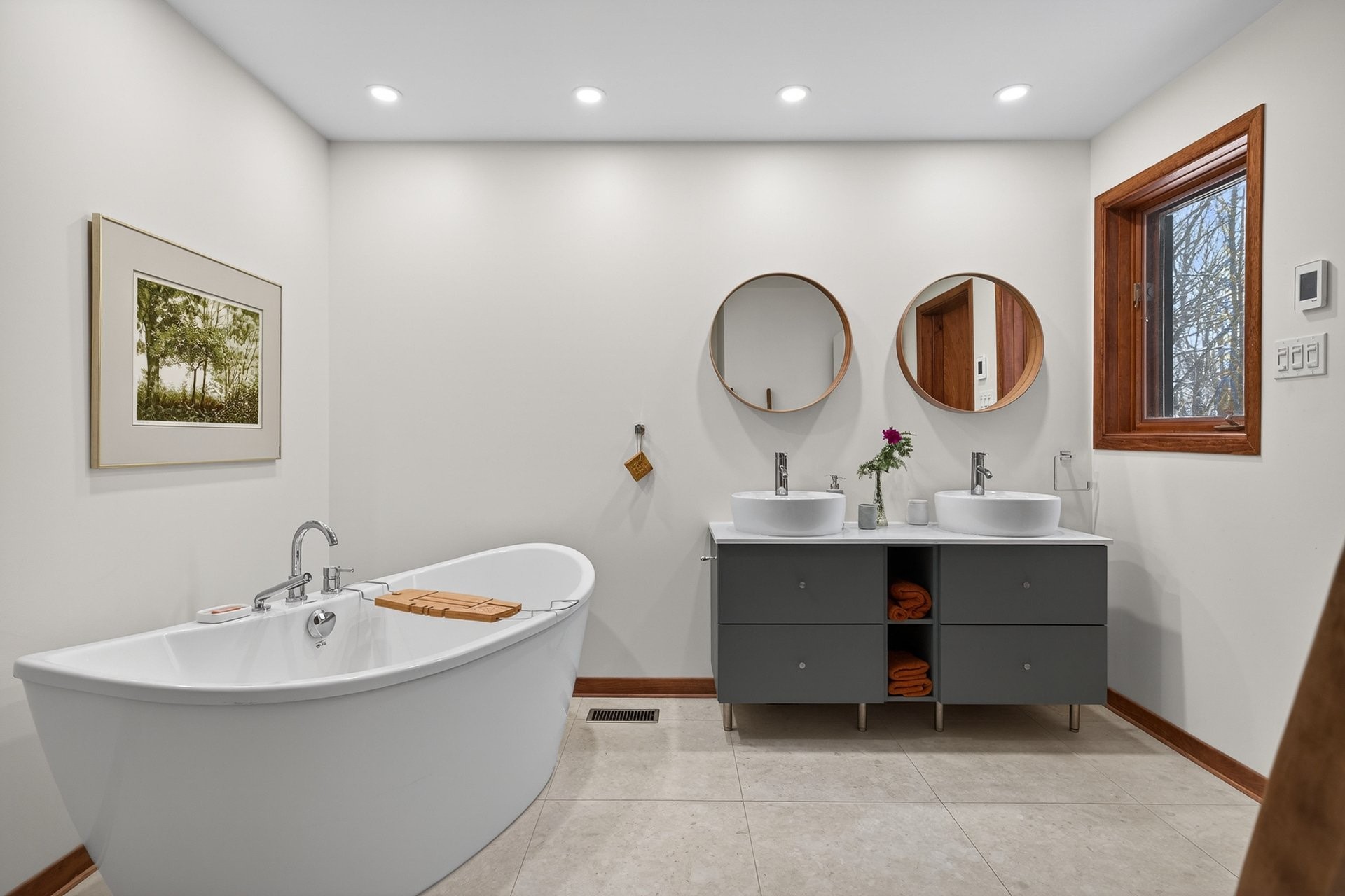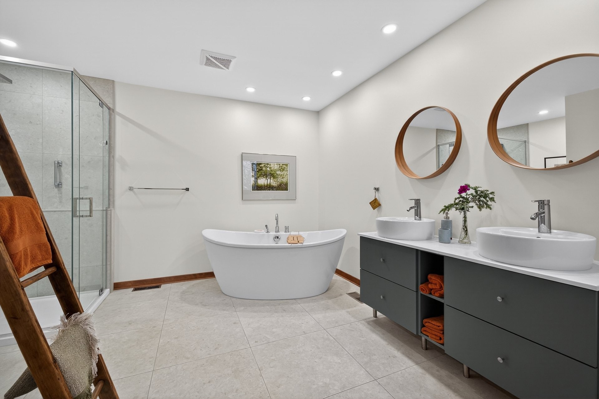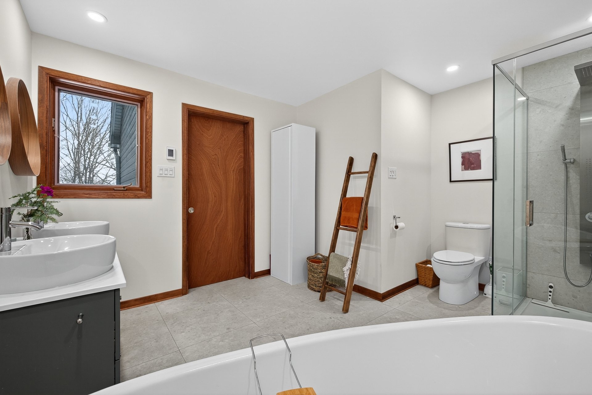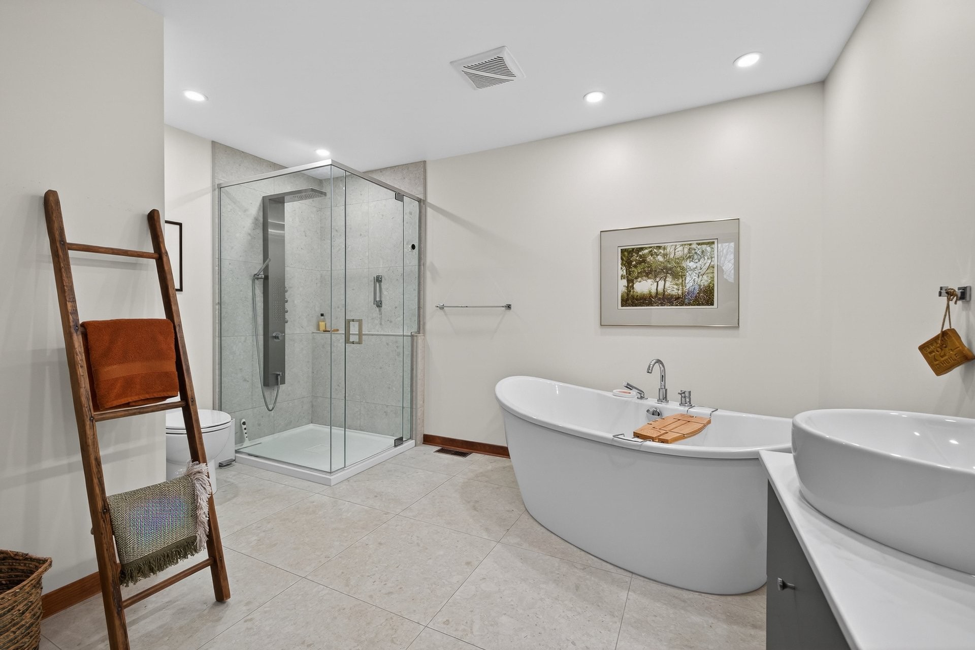 Le rez-de-chaussée se distingue également par son immense chambre principale au plafond cathédral, créant une atmosphère apaisante et aérée. Sa salle de bain attenante privée est un véritable espace détente avec bain autoportant, douche vitrée et meuble double lavabo avec rangement abondant. Une salle d'eau complète ce niveau avec praticité.