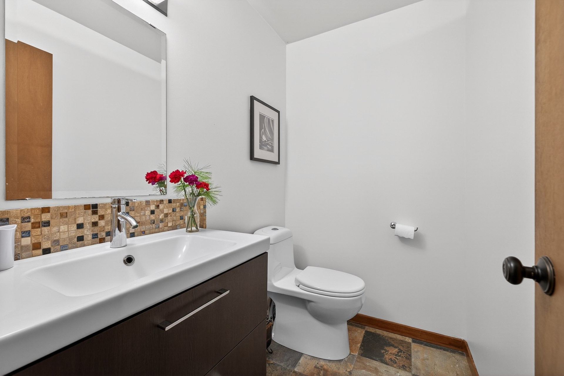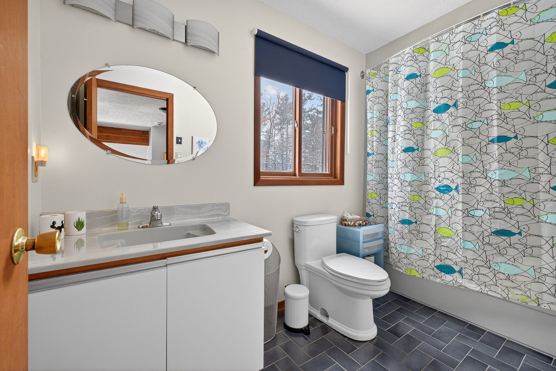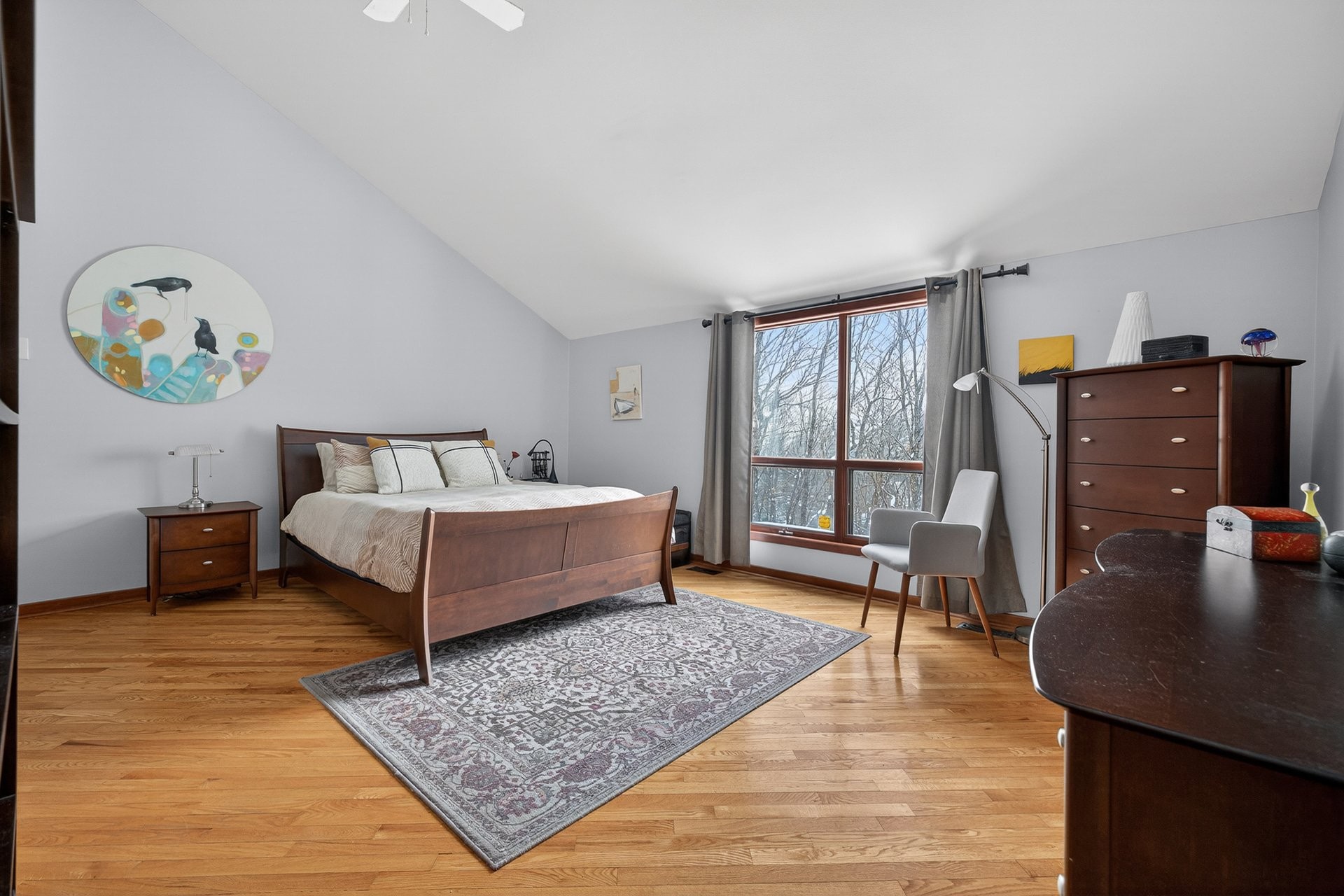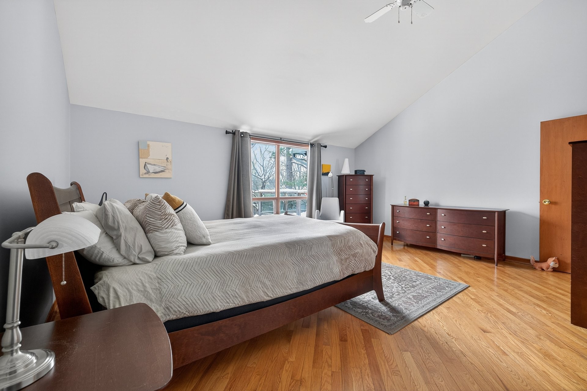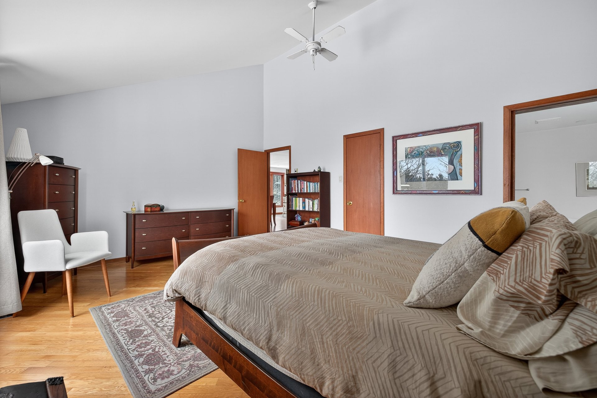 Le rez-de-chaussée se distingue également par son immense chambre principale au plafond cathédral, créant une atmosphère apaisante et aérée. Sa salle de bain attenante privée est un véritable espace détente avec bain autoportant, douche vitrée et meuble double lavabo avec rangement abondant. Une salle d'eau complète ce niveau avec praticité.
