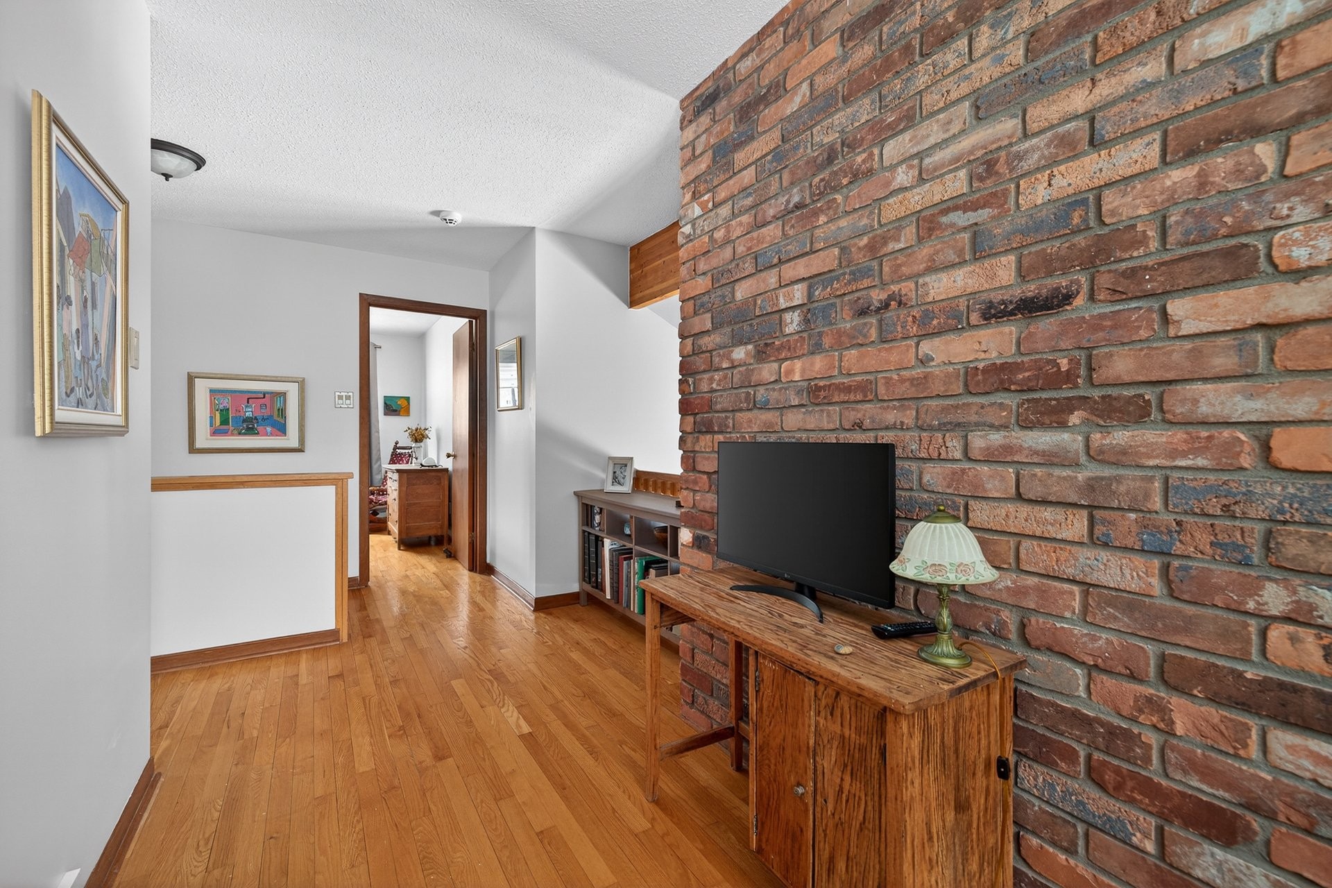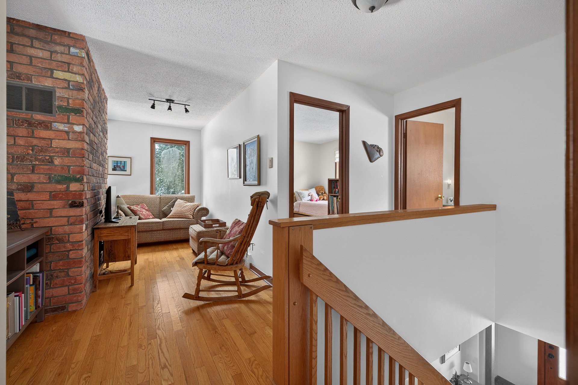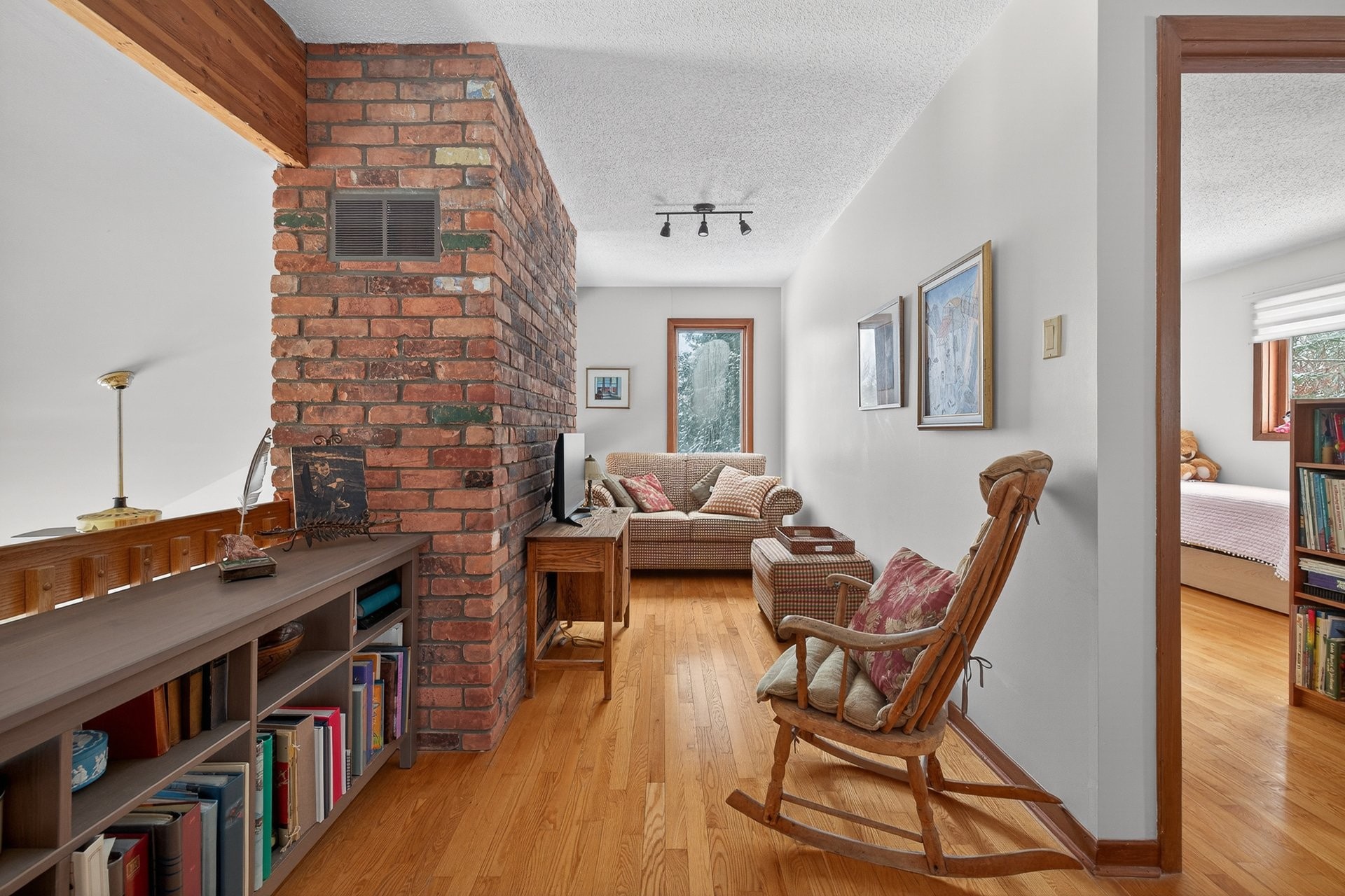 À l'étage, la mezzanine surplombant l'aire de vie propose un charmant espace boudoir agrémenté d'un mur de briques, ajoutant caractère et chaleur. Deux chambres de bonnes dimensions ainsi qu'une salle de bain viennent compléter ce niveau lumineux et bien pensé.
