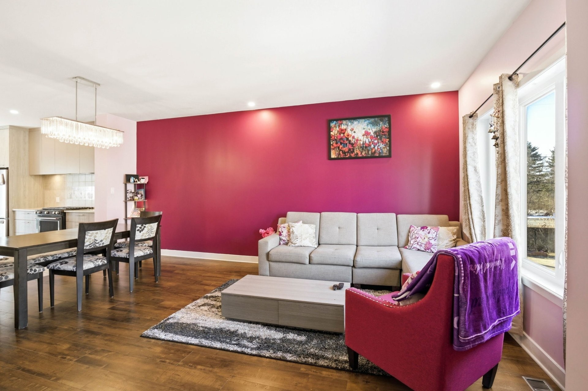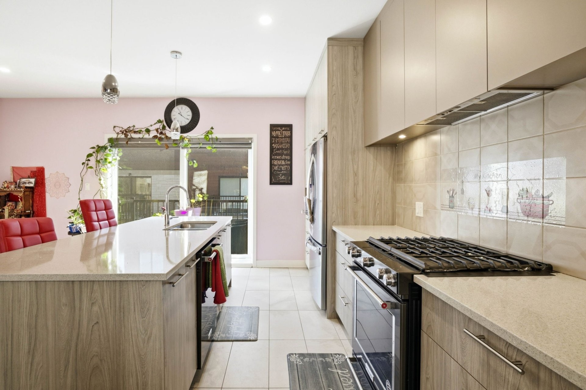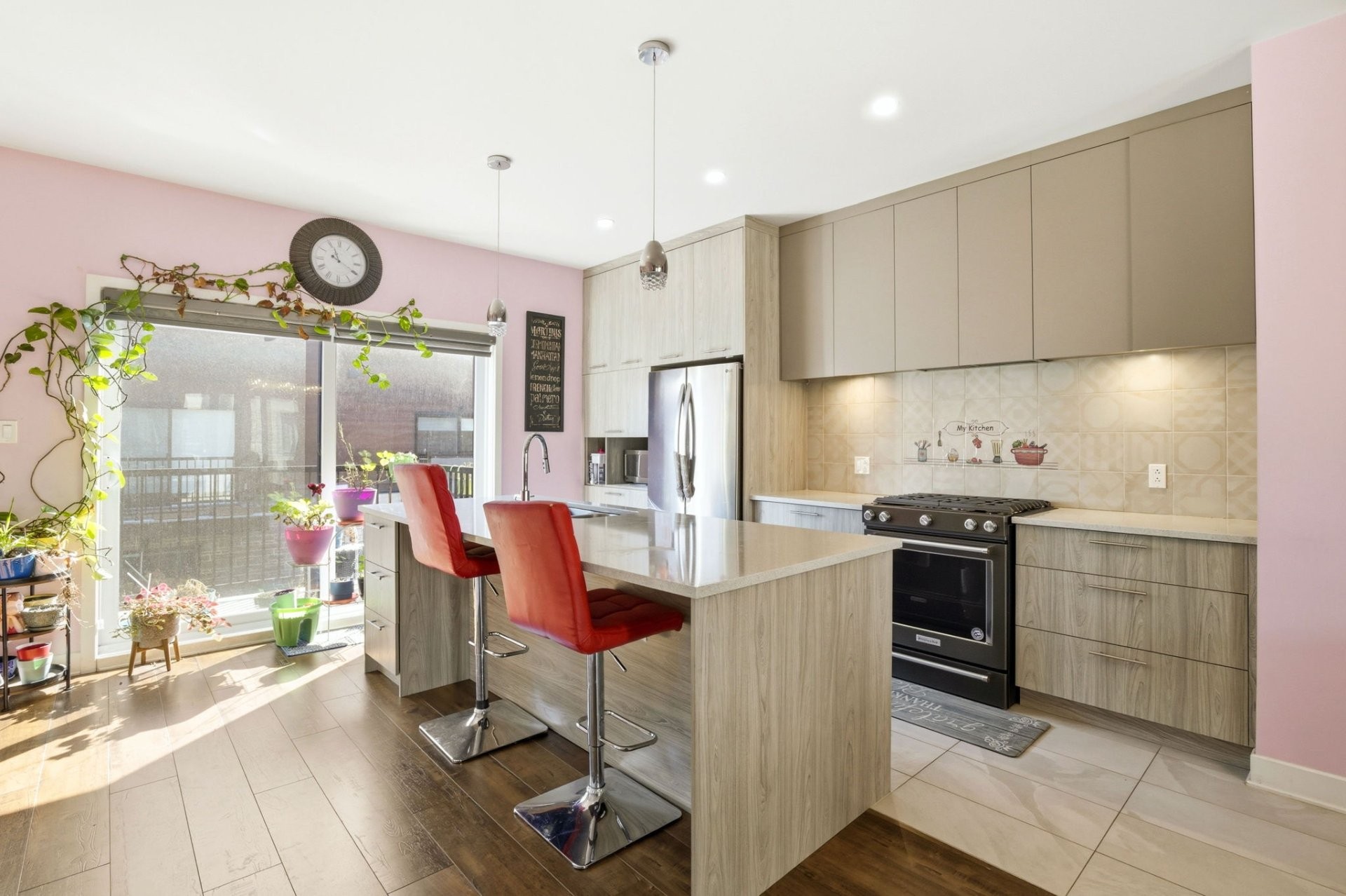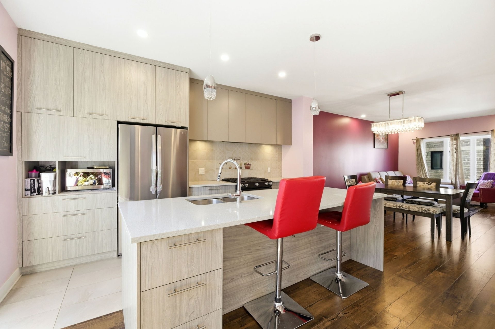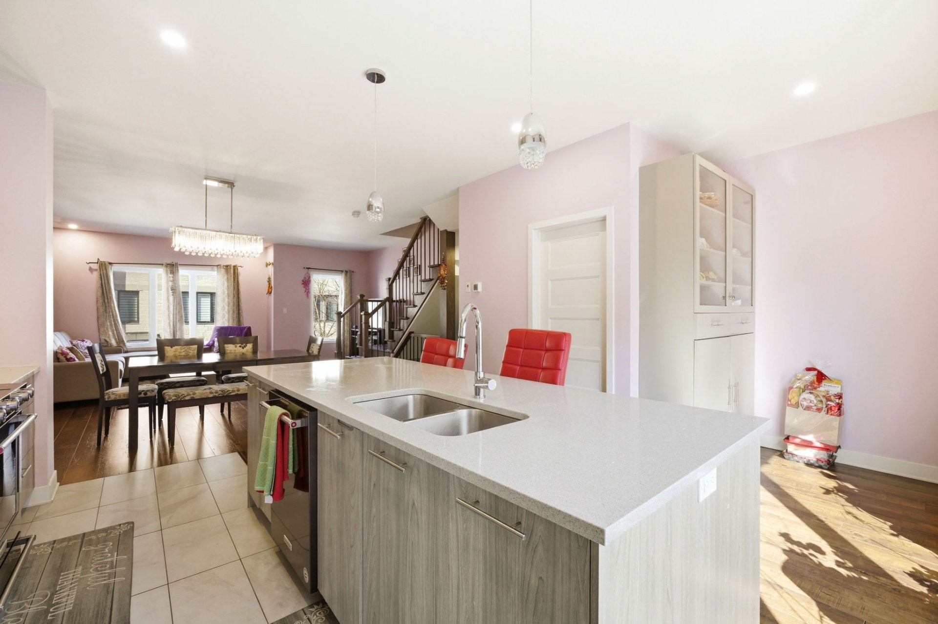 La pièce à vivre principale est lumineuse et ouverte, reliant harmonieusement le salon, la salle à manger et la cuisine, ce qui est idéal pour recevoir ou pour la vie quotidienne. La cuisine est magnifiquement conçue avec des finitions modernes, un grand îlot central et beaucoup de lumière naturelle. Elle comprend également un charmant coin repas qui offre un espace de rangement supplémentaire et de la place pour une petite table.
