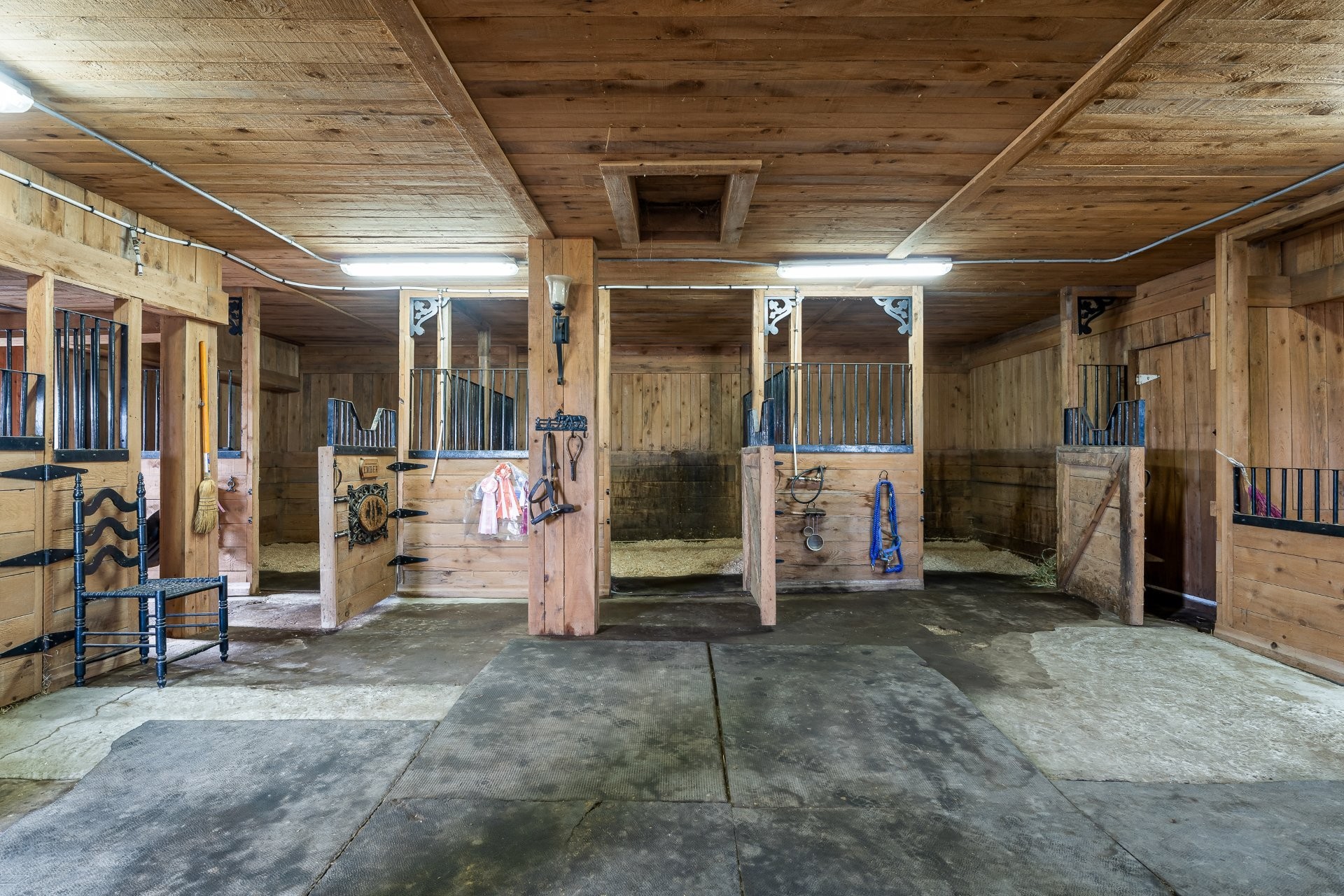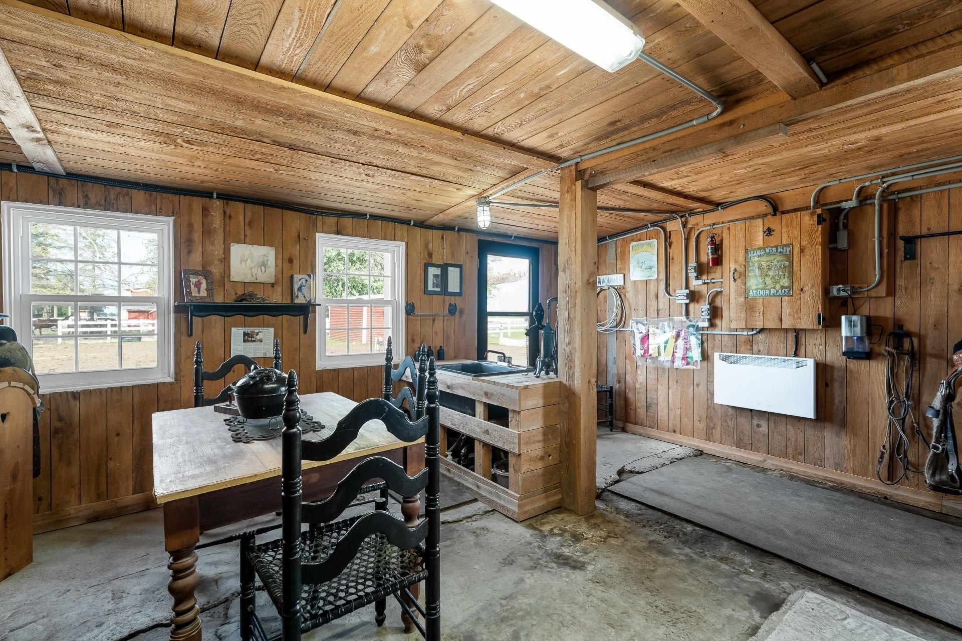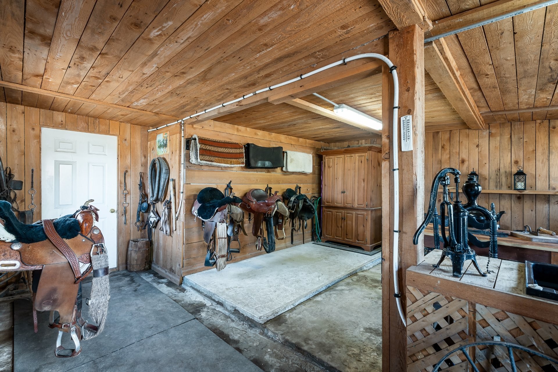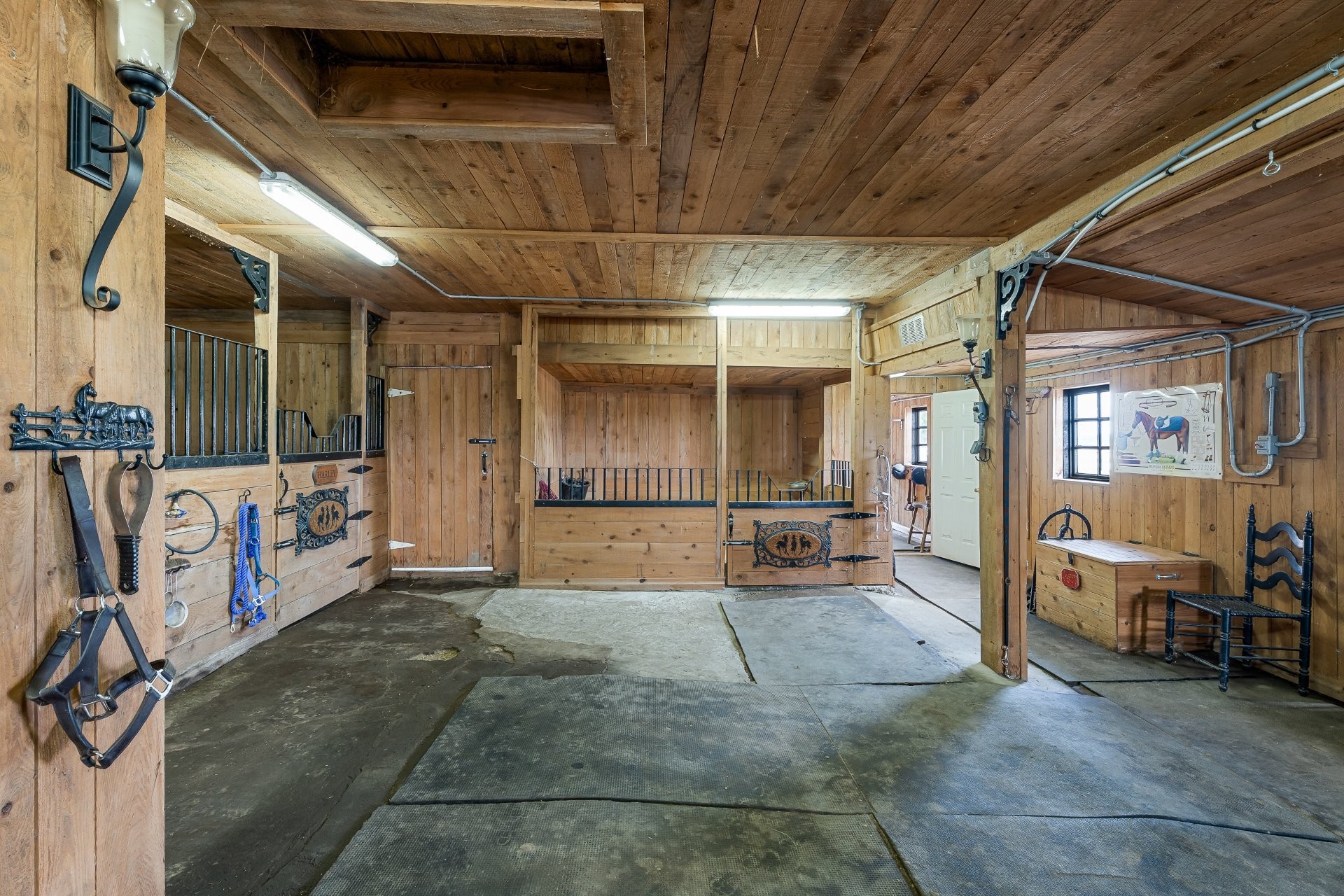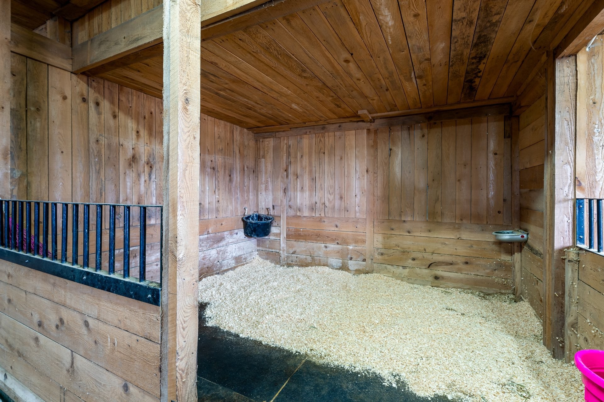 Les installations équestres sont soigneusement conçues pour une utilisation à l'année. La magnifique écurie comprend cinq stalles, dont quatre avec abreuvoirs automatiques, une cinquième stalle plus grande avec des murets bas, ainsi qu'un sixième espace pouvant être reconverti en stalle pour poney ou utilisé comme rangement. L'écurie est chauffée, ventilée, et alimentée en électricité et en eau courante toute l'année. Le grenier à foin à l'étage peut accueillir jusqu'à 250 balles carrées, avec un accès direct de l'extérieur pour le remplissage. Un espace de rangement extérieur est également prévu pour les balles rondes, et une grande sellerie vient compléter les installations.