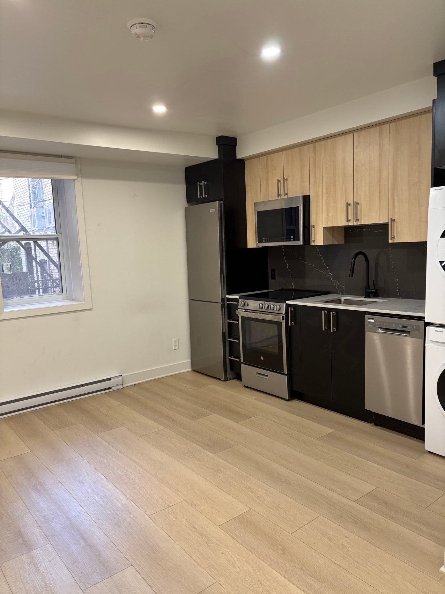 Superbe studio en plein centre-ville! Spacieux et entièrement rénové, cet appartement allie confort et vie urbaine. Aire ouverte lumineuse avec plafonds élevés, planchers de bois et finitions contemporaines. La cuisine élégante offre des électroménagers en acier inoxydable et beaucoup de rangement. À quelques pas des écoles, de la rue Sainte-Catherine animée, des stations de métro, des cafés et de toutes les commodités. Idéal pour les professionnels ou étudiants cherchant un espace stylé et pratique au coeur de la ville.