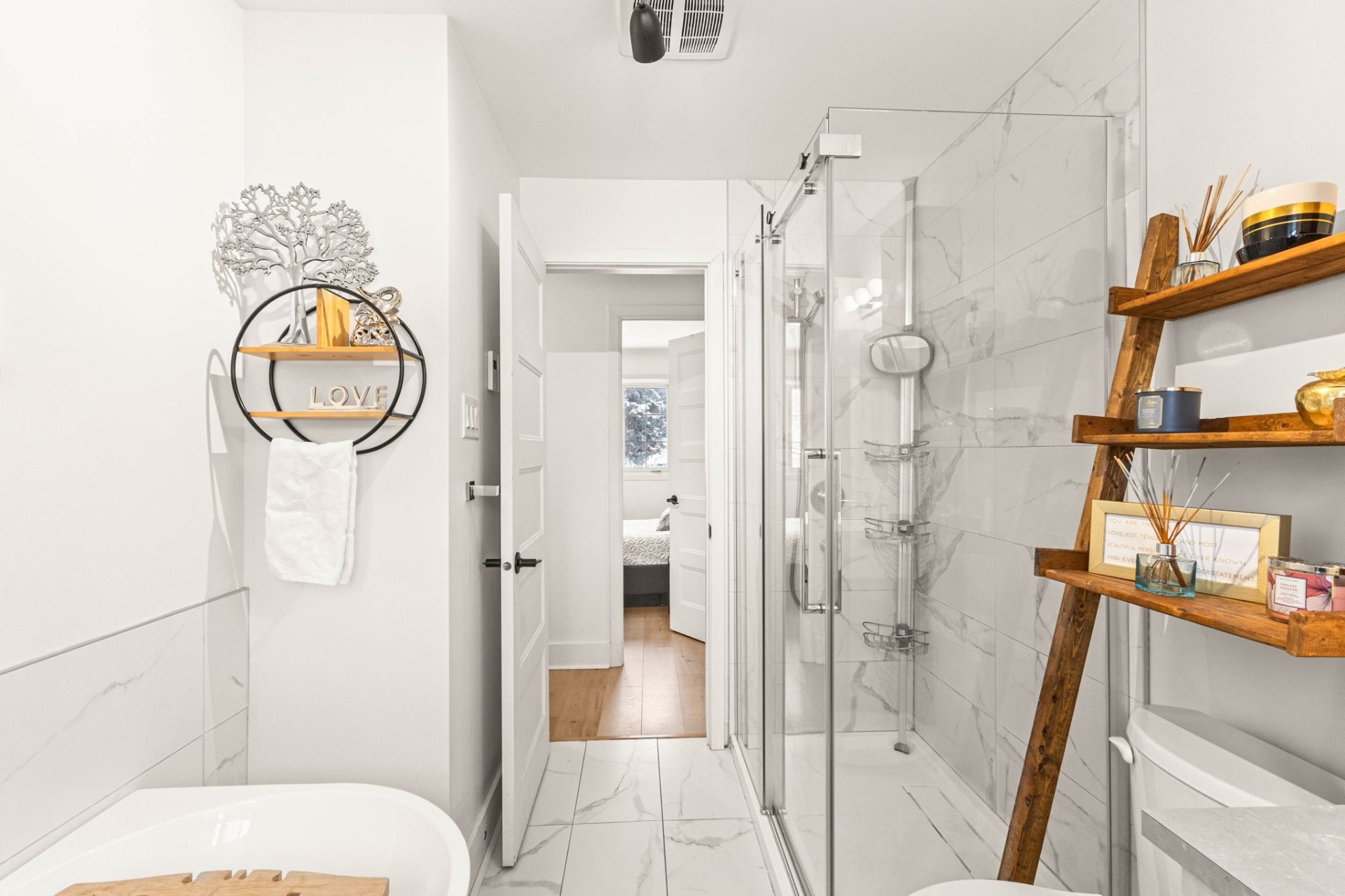 Le bachelor bénéficie de sa propre entrée indépendante et communique également avec l'unité principale, offrant une flexibilité d'aménagement selon vos besoins tout en préservant l'intimité de chacun.