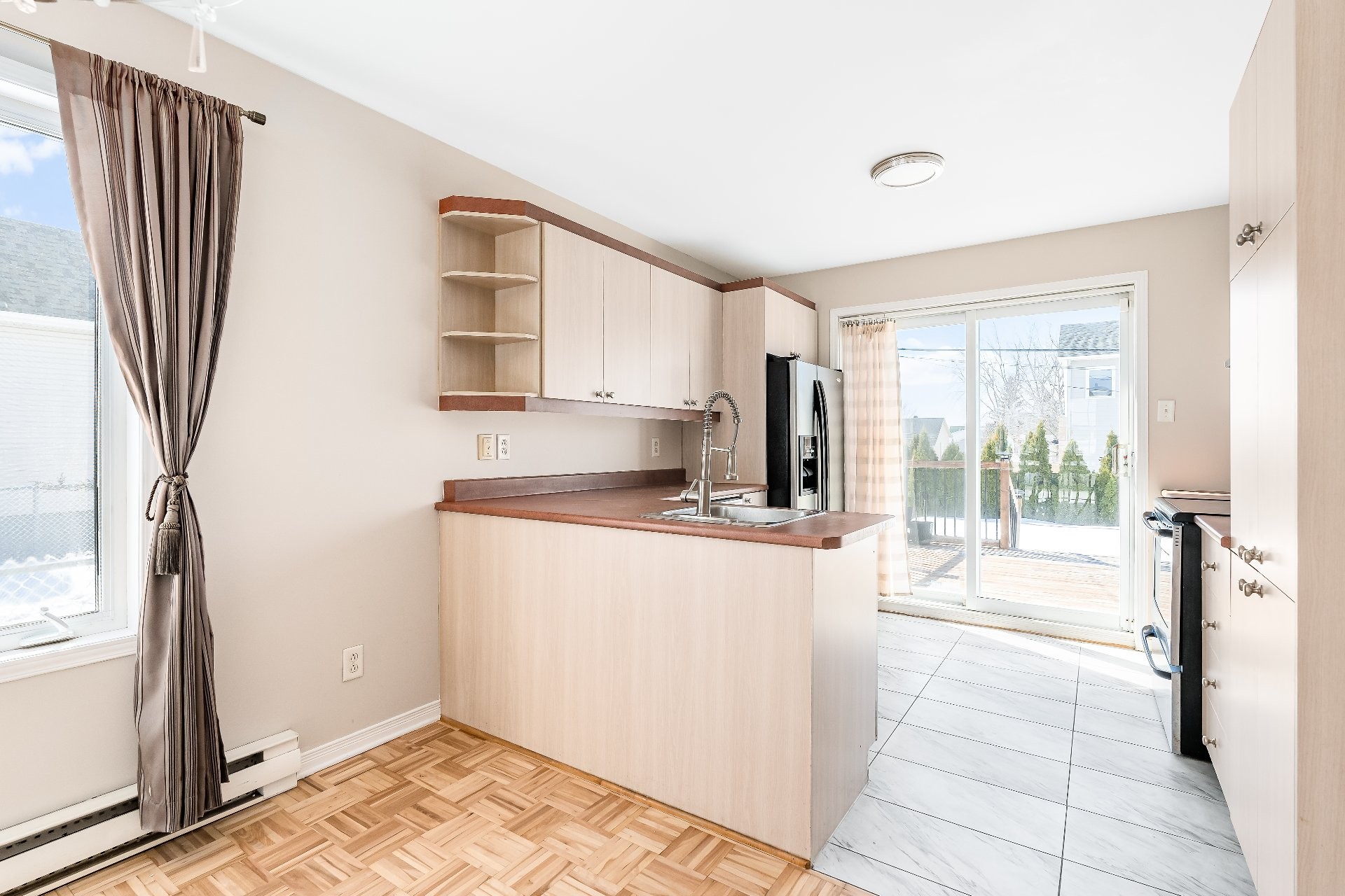 Réfrigérateur, cuisinière, lave-vaisselle, rideaux bleus dans la cuisine et le salon.
