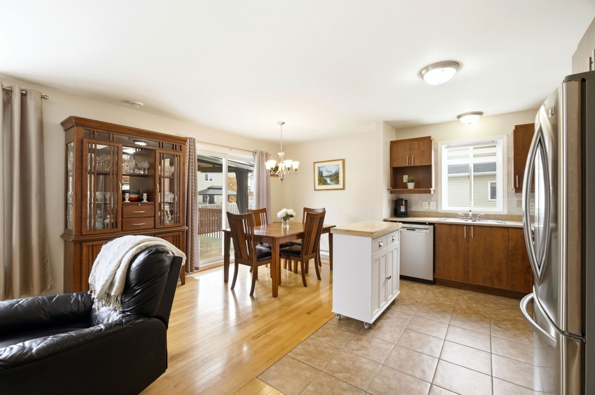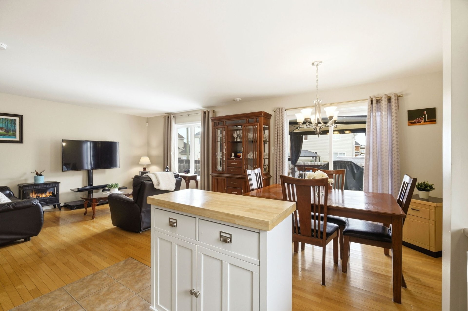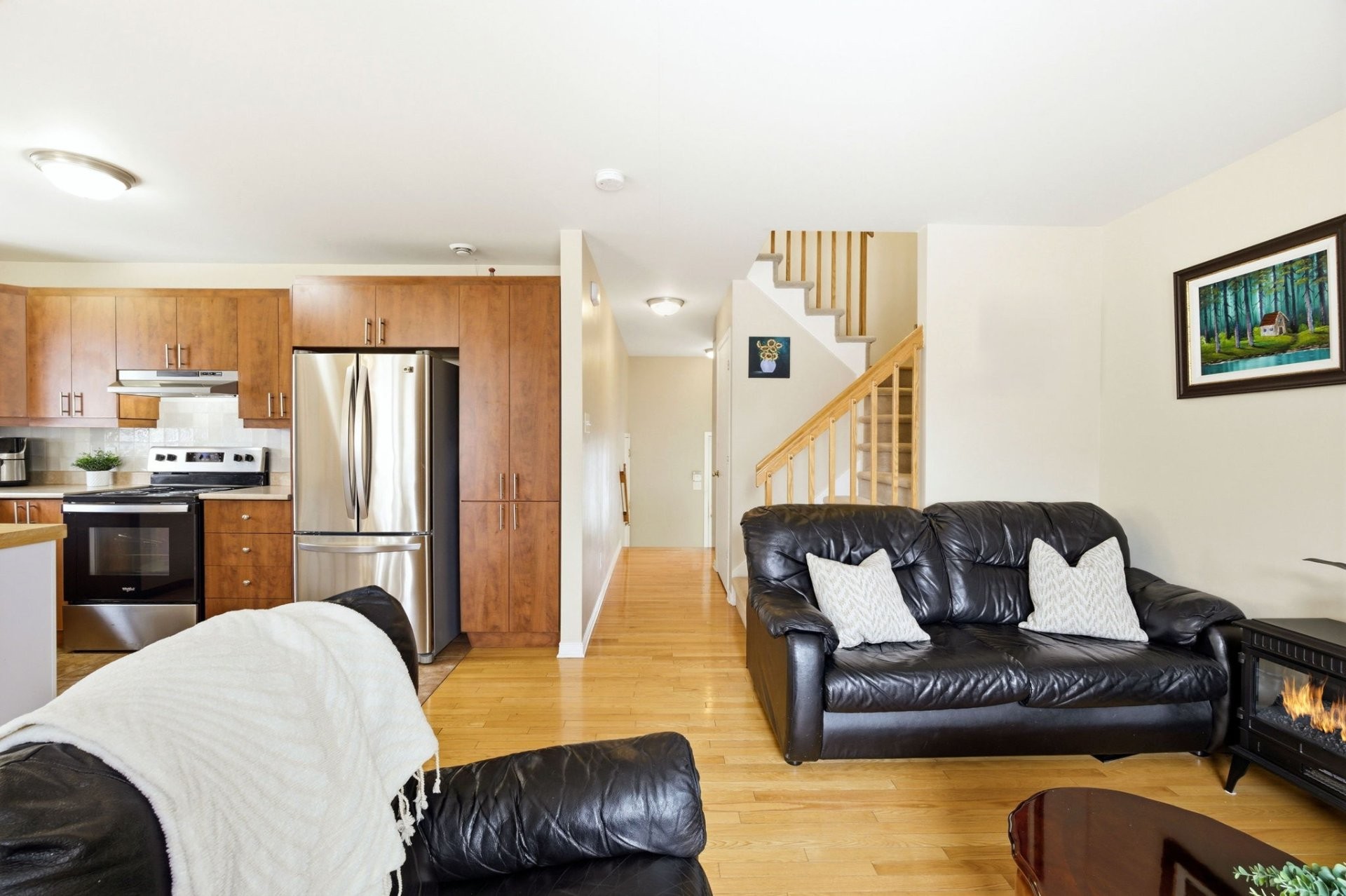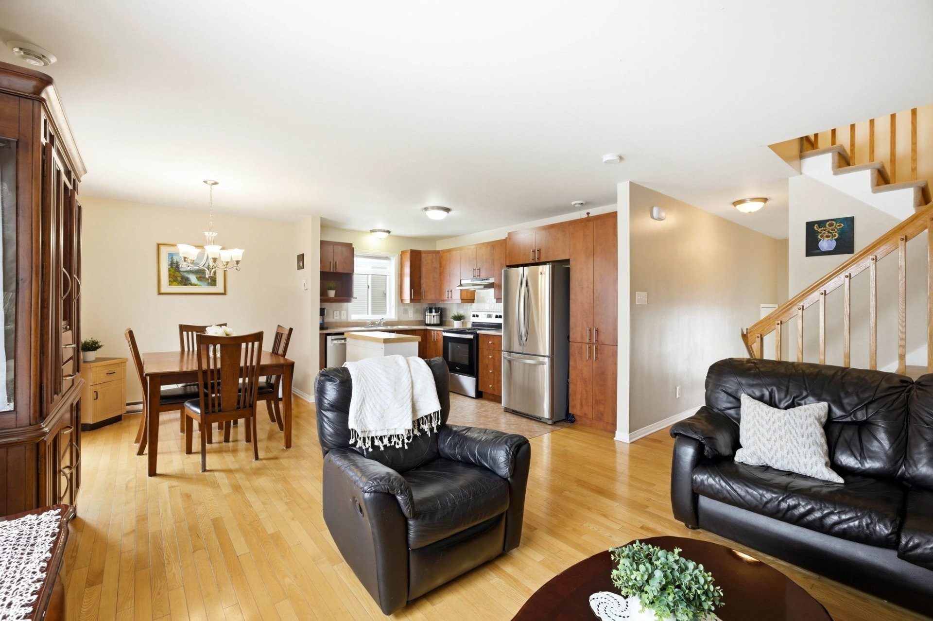 Le rez-de-chaussée propose une aire de vie lumineuse à concept ouvert reliant harmonieusement la cuisine, la salle à manger et le salon. Les planchers de bois franc s'étendent dans tout l'espace, créant une ambiance chaleureuse et invitante, parfaite pour la vie de famille comme pour recevoir. Une salle d'eau pratique complète cet étage.