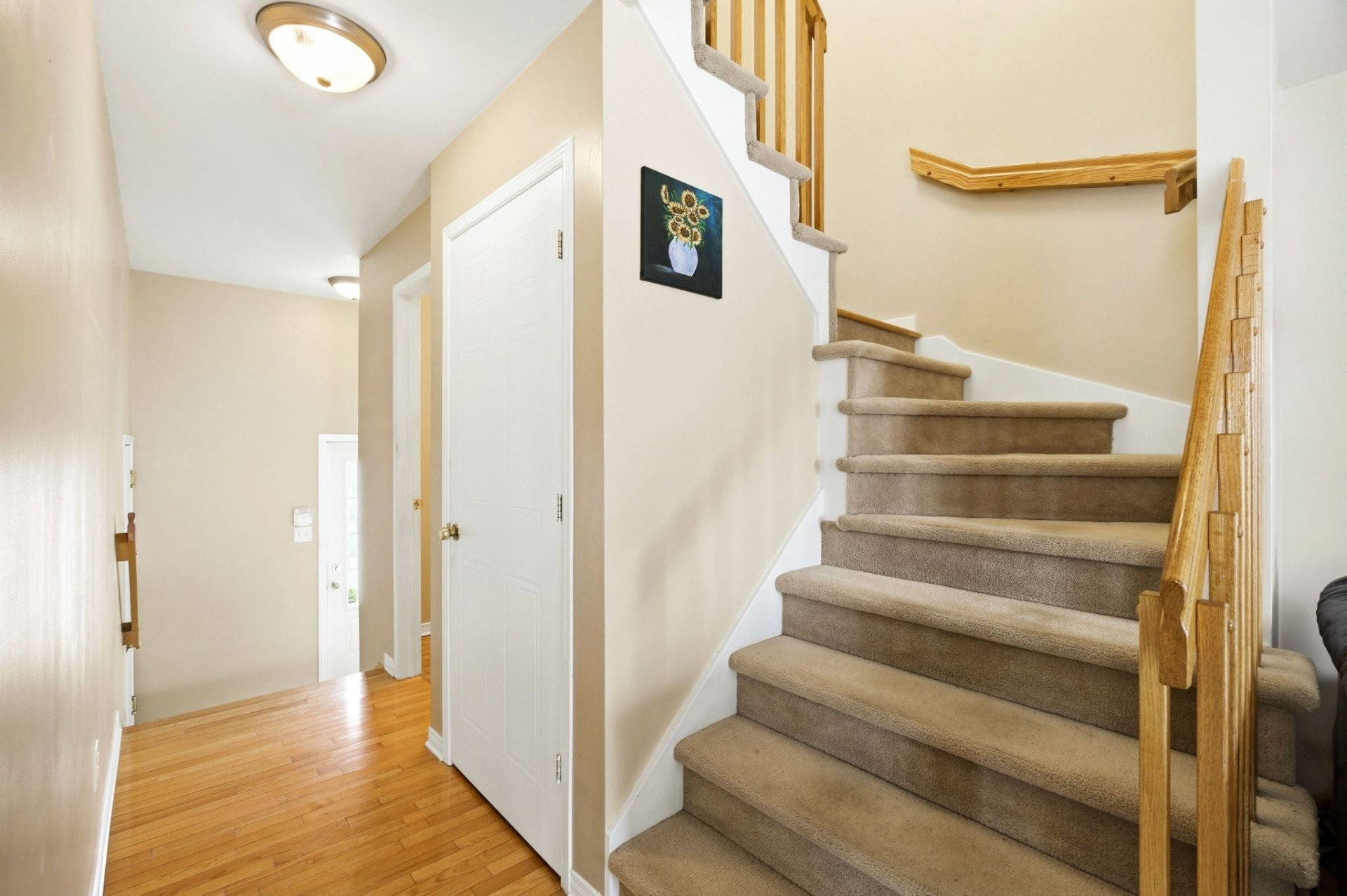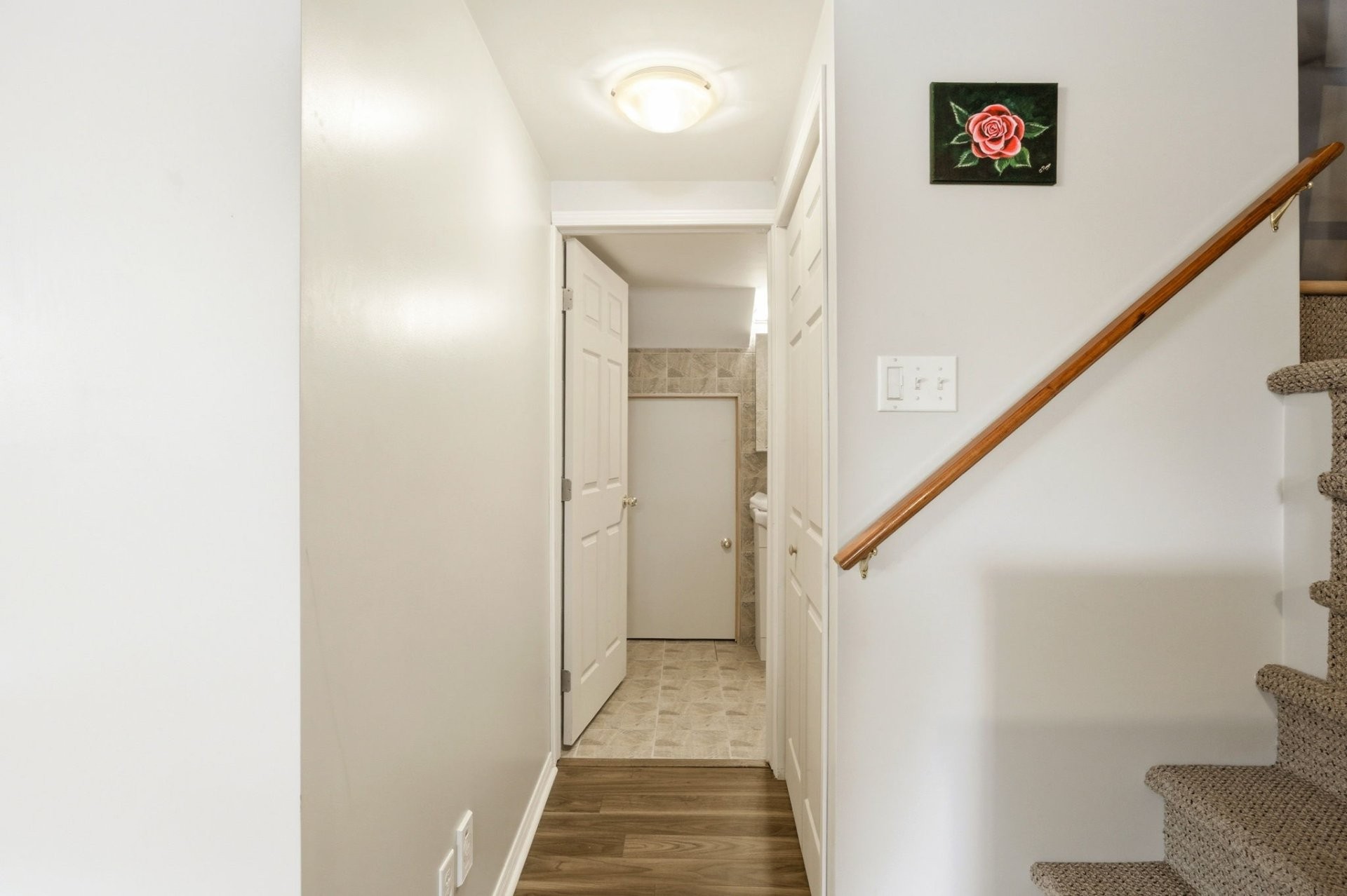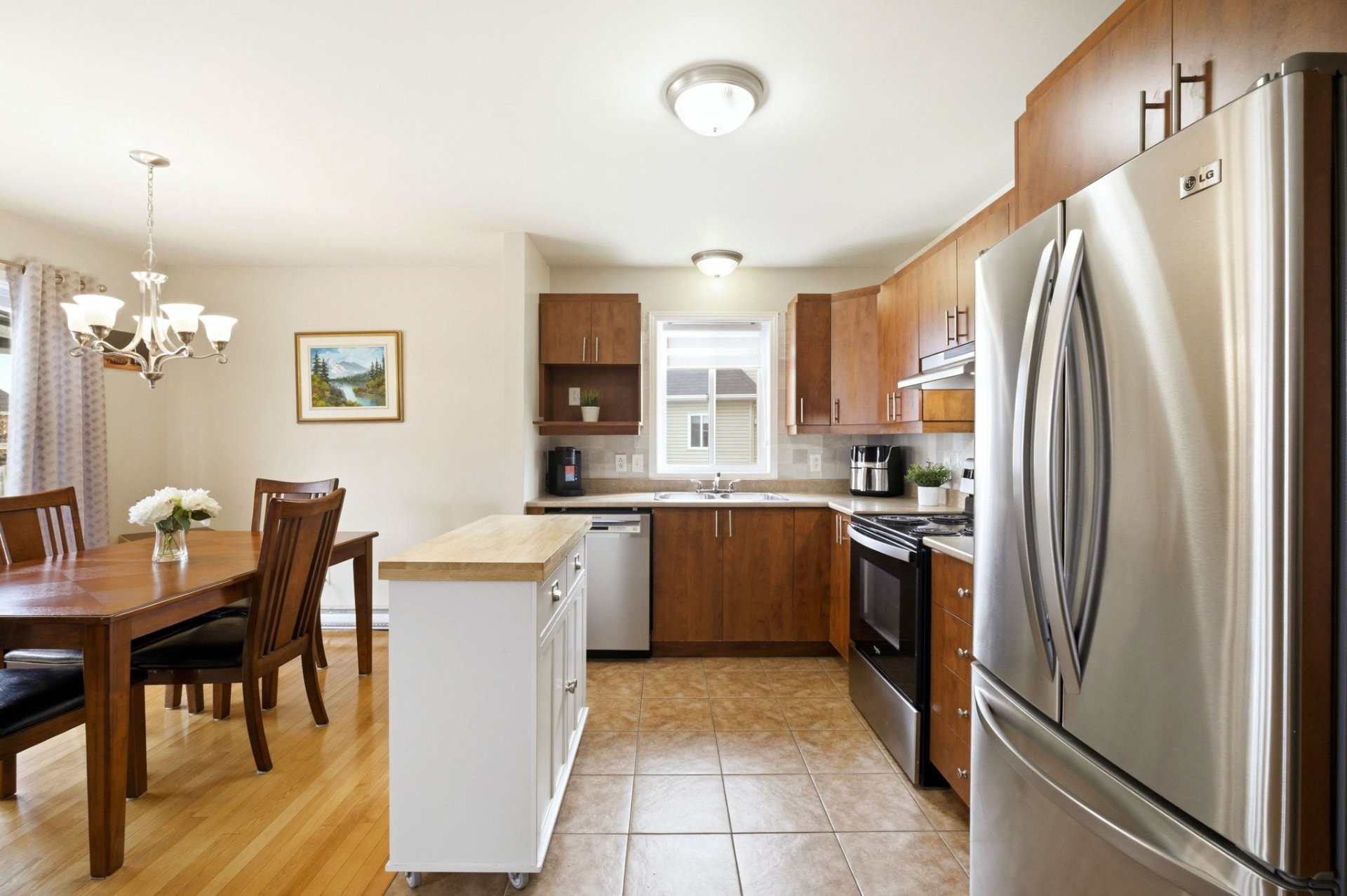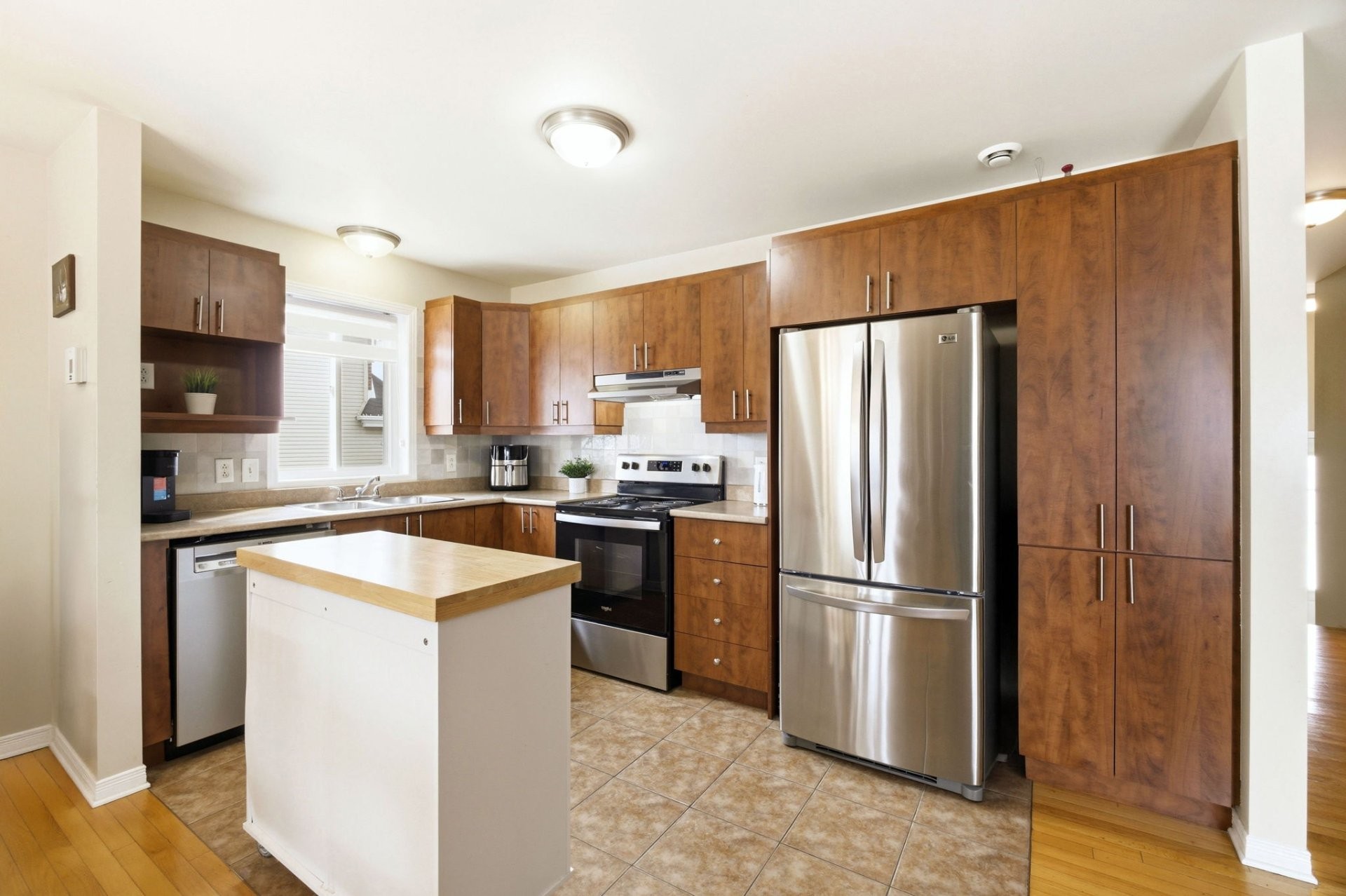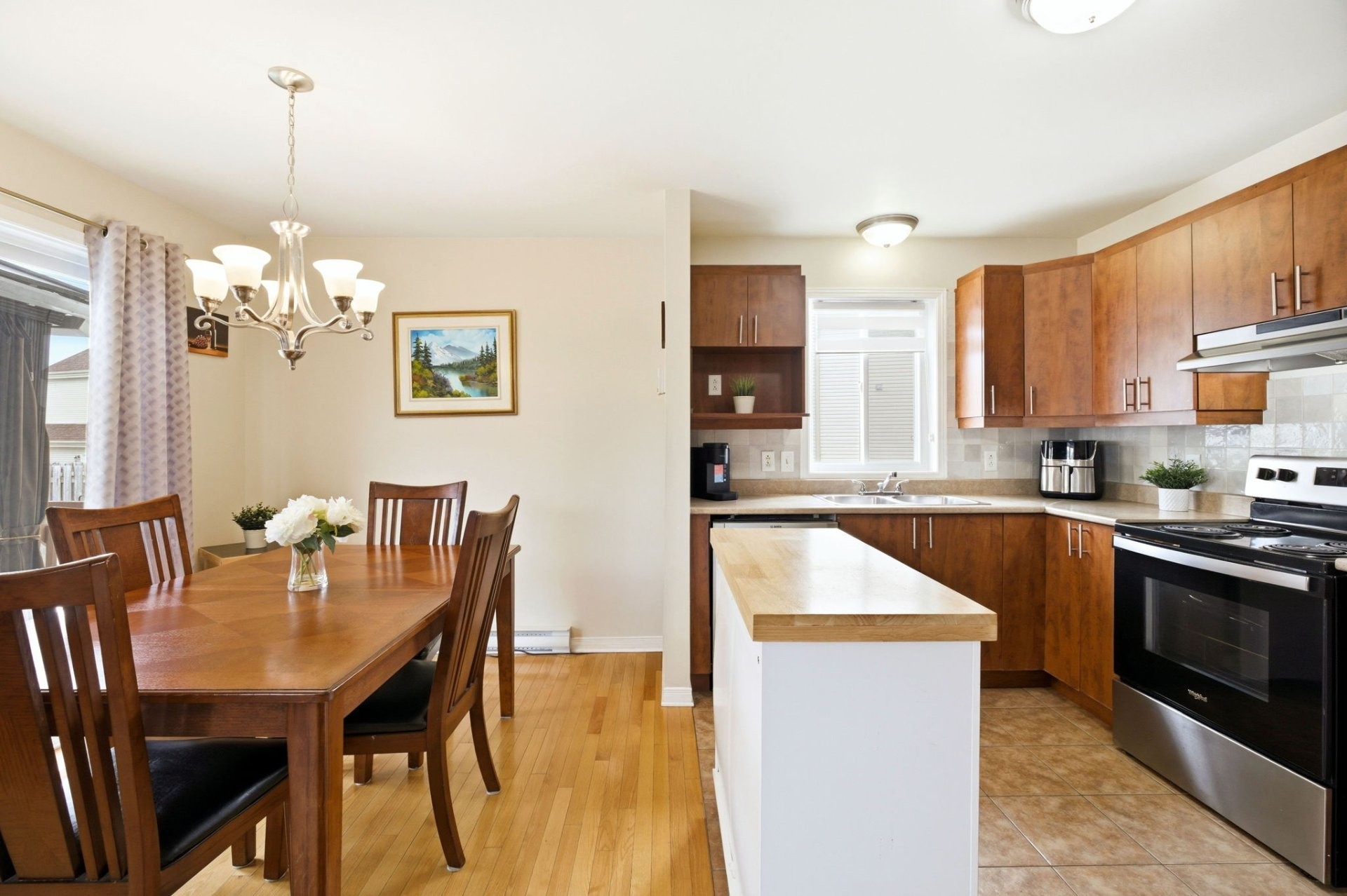 Le rez-de-chaussée propose une aire de vie lumineuse à concept ouvert reliant harmonieusement la cuisine, la salle à manger et le salon. Les planchers de bois franc s'étendent dans tout l'espace, créant une ambiance chaleureuse et invitante, parfaite pour la vie de famille comme pour recevoir. Une salle d'eau pratique complète cet étage.
