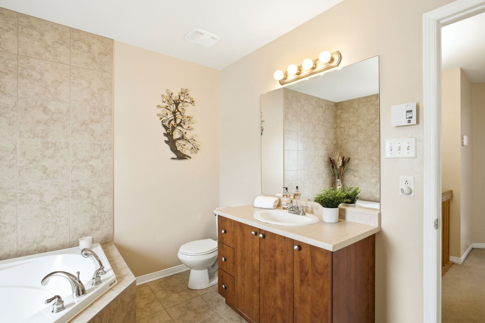 À l'étage, vous trouverez trois chambres bien aménagées, dont une spacieuse chambre principale avec walk-in. Ce niveau comprend également une salle de bain complète avec bain et douche séparés, ainsi qu'un espace buanderie pratique.