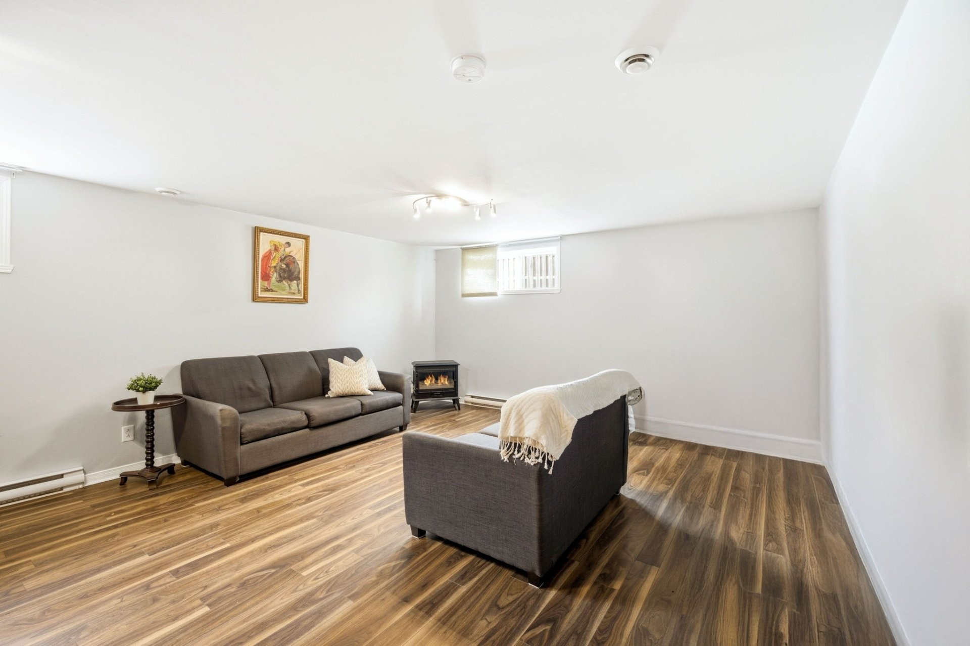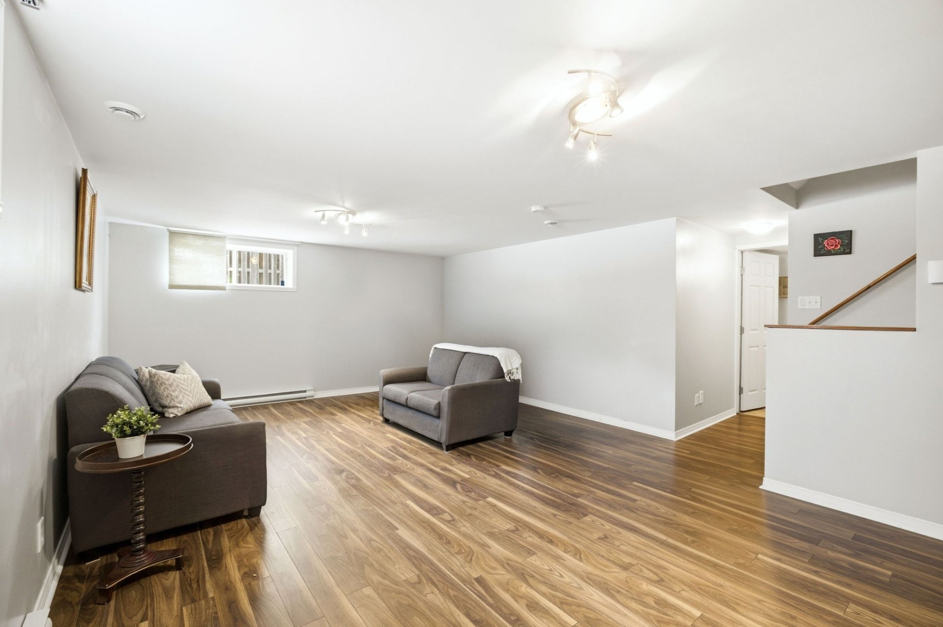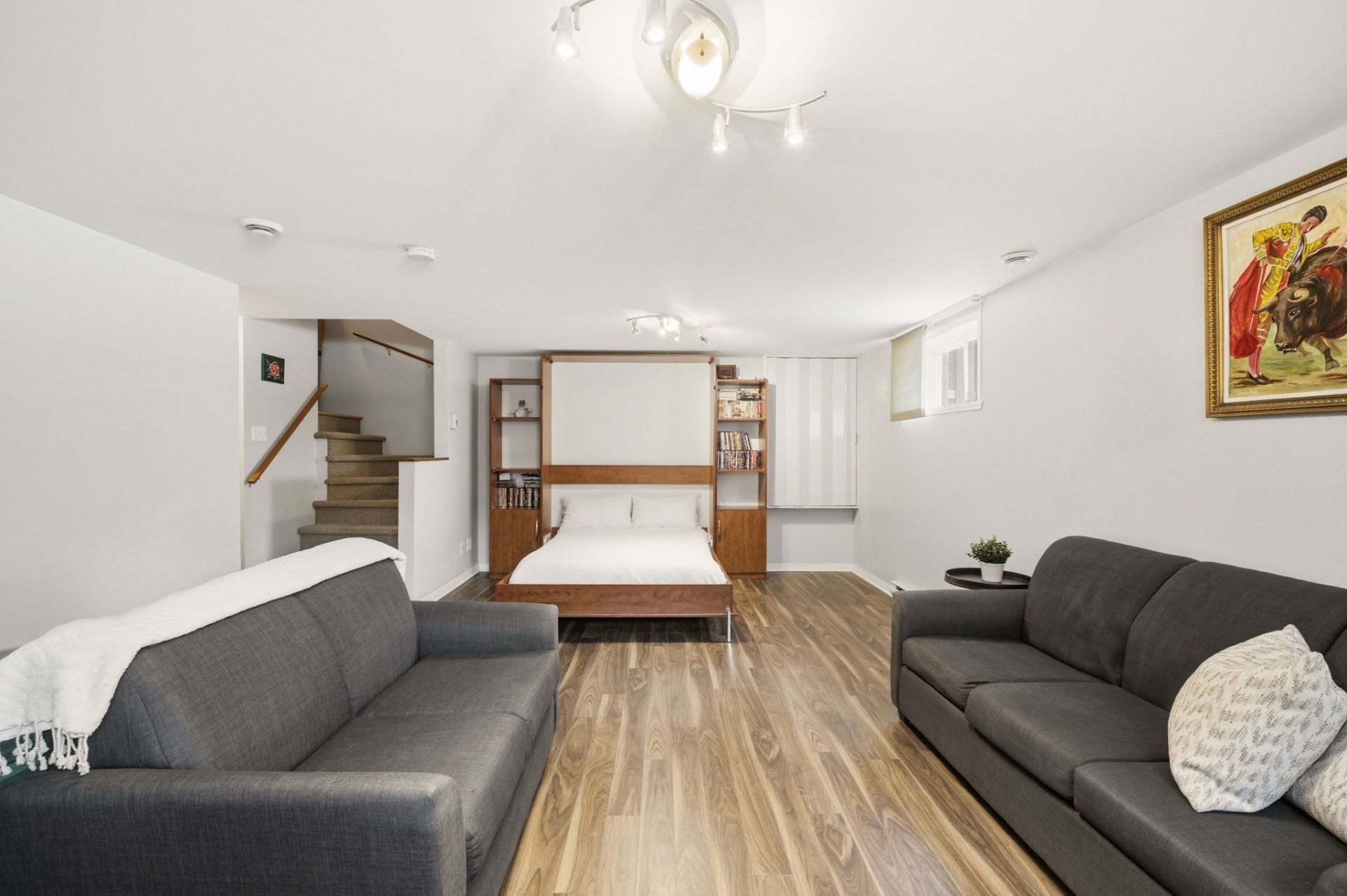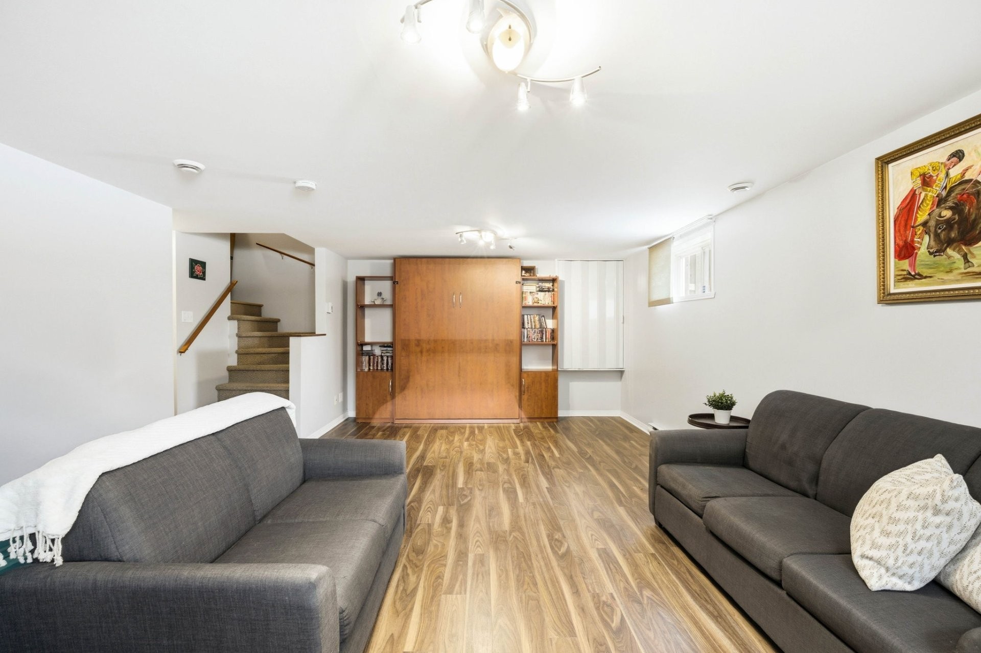 Le sous-sol entièrement aménagé offre un espace de vie supplémentaire polyvalent, idéal comme salle familiale, salle de jeux ou bureau à domicile. On y retrouve également du rangement additionnel, un lit escamotable (Murphy) pour les invités ainsi qu'une salle de bain complète.