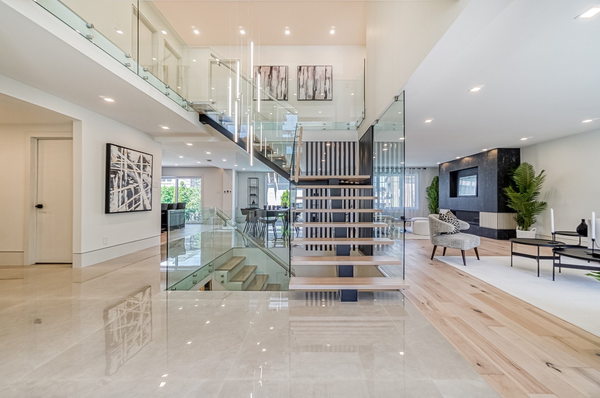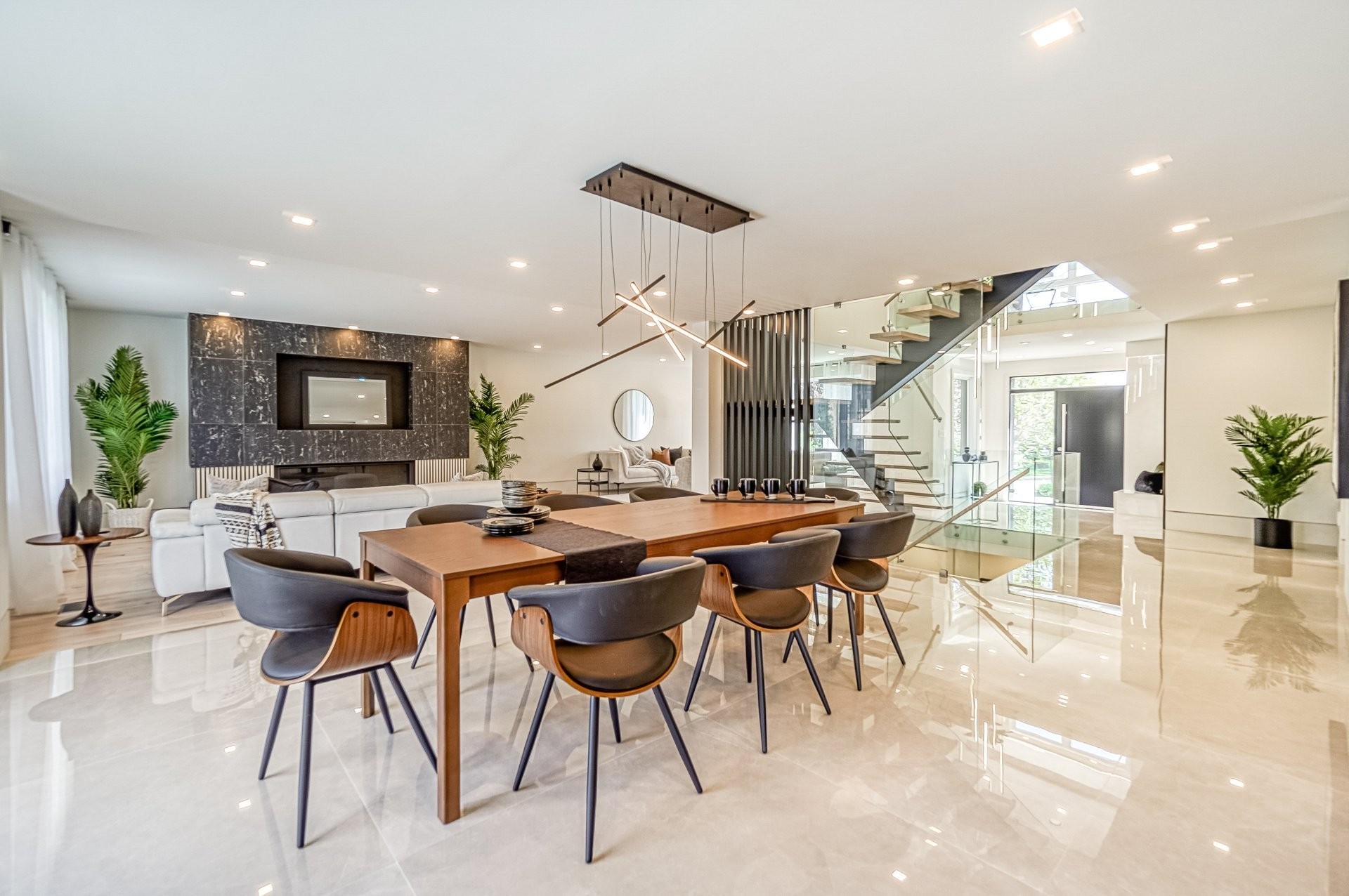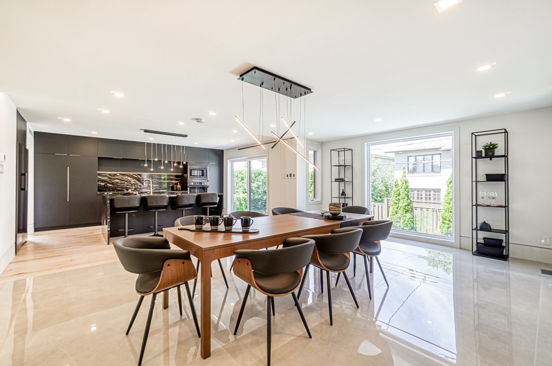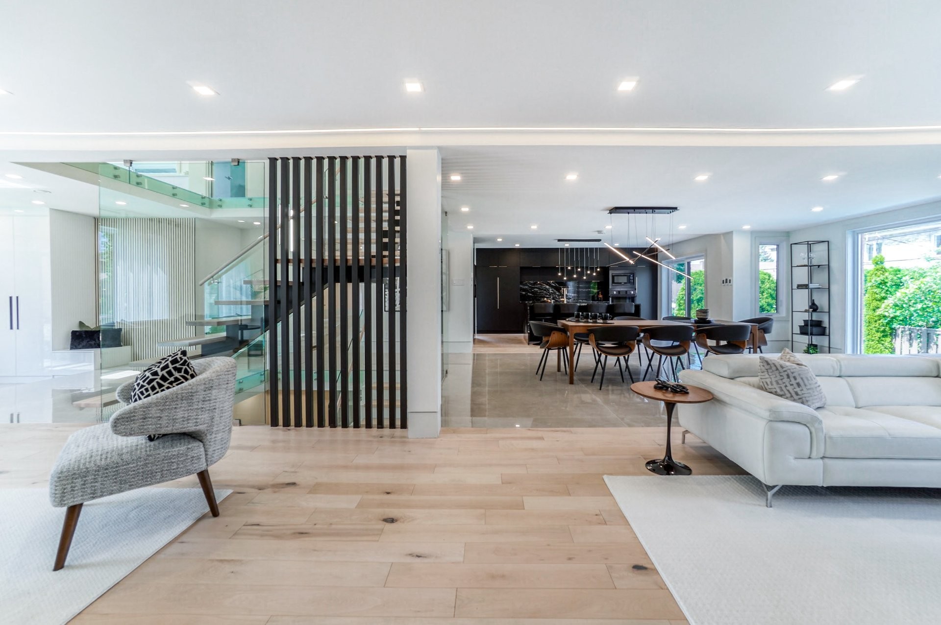 Un escalier en bois positionné au centre de cette maison est une caractéristique essentielle qui vous permet d'admirer le mélange de structure noir mat mélangé à des panneaux de verre pour donner à cette maison une touche moderne. Continuez le long du rez-de-chaussée, on remarquera un plancher en bois francs, des murs d'accent en lattes allant de différentes tonalités de bois, un élégant foyer au gaz enfermé dans une unité de divertissement en porcelaine mate menant à la grande cuisine. Les accents dorés apportent de la chaleur aux armoires noires élégantes, aidant à styliser et à capturer une cuisine audacieuse et pour finaliser le tout une cuisine de service adjacent.