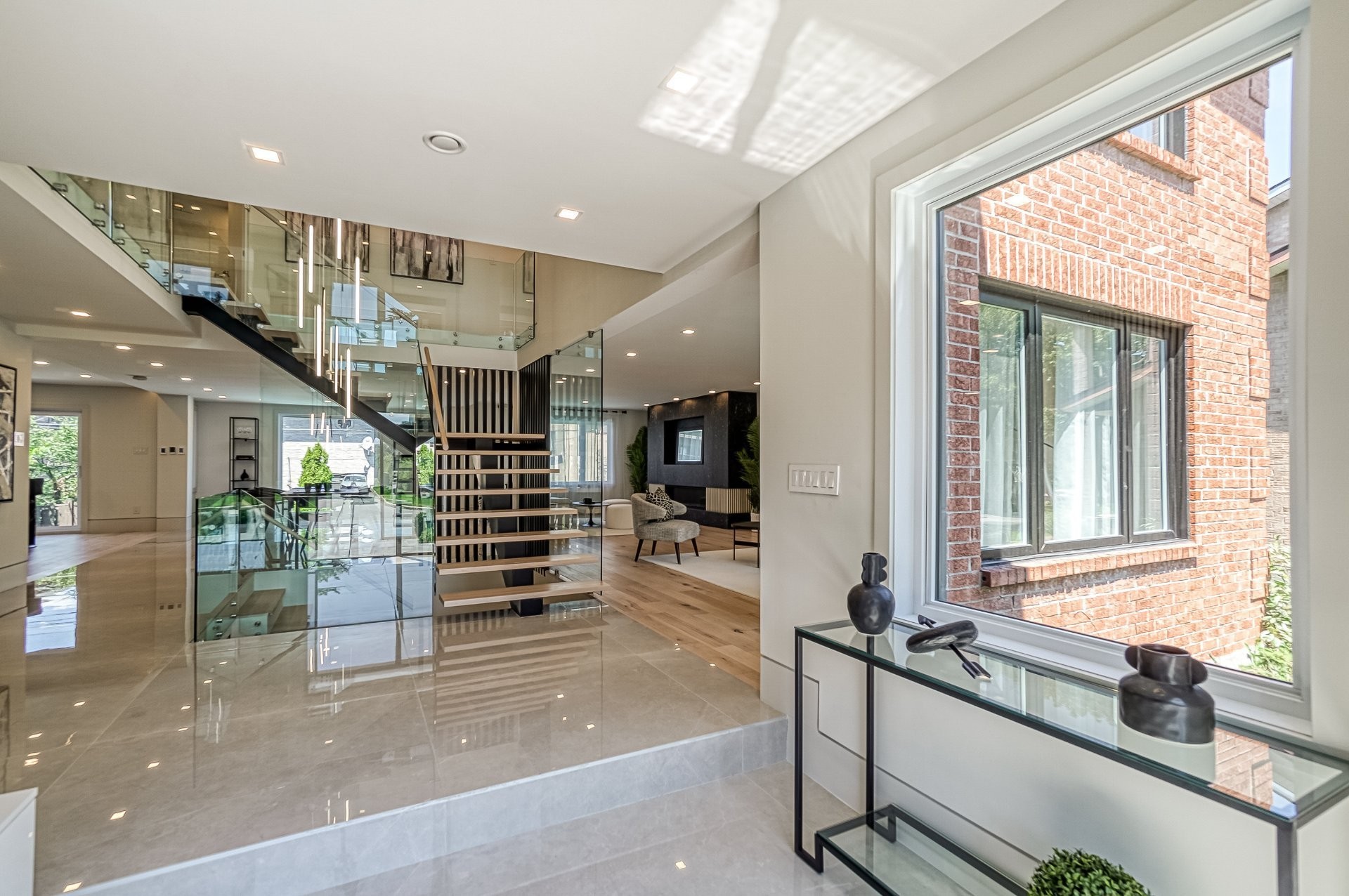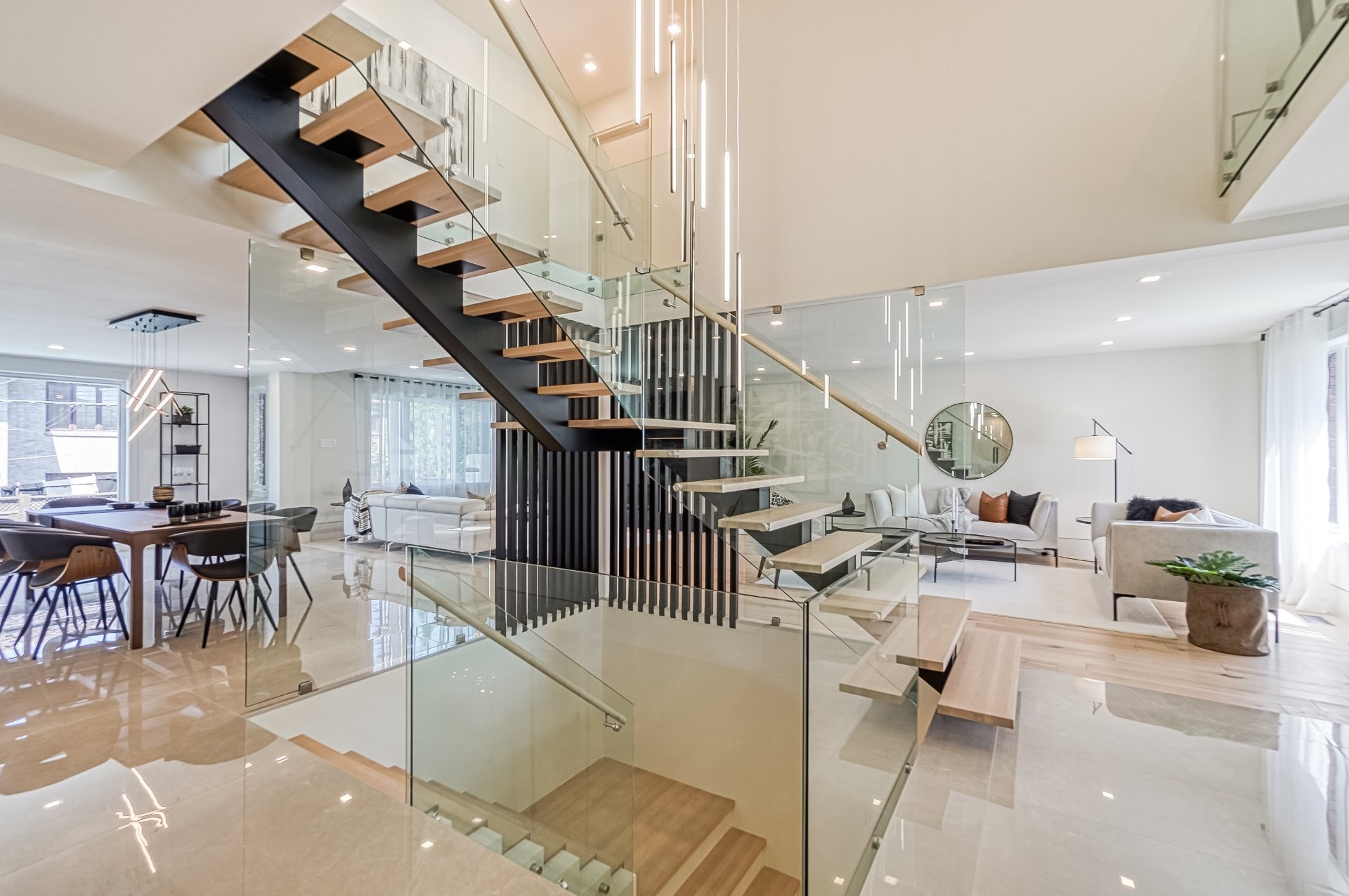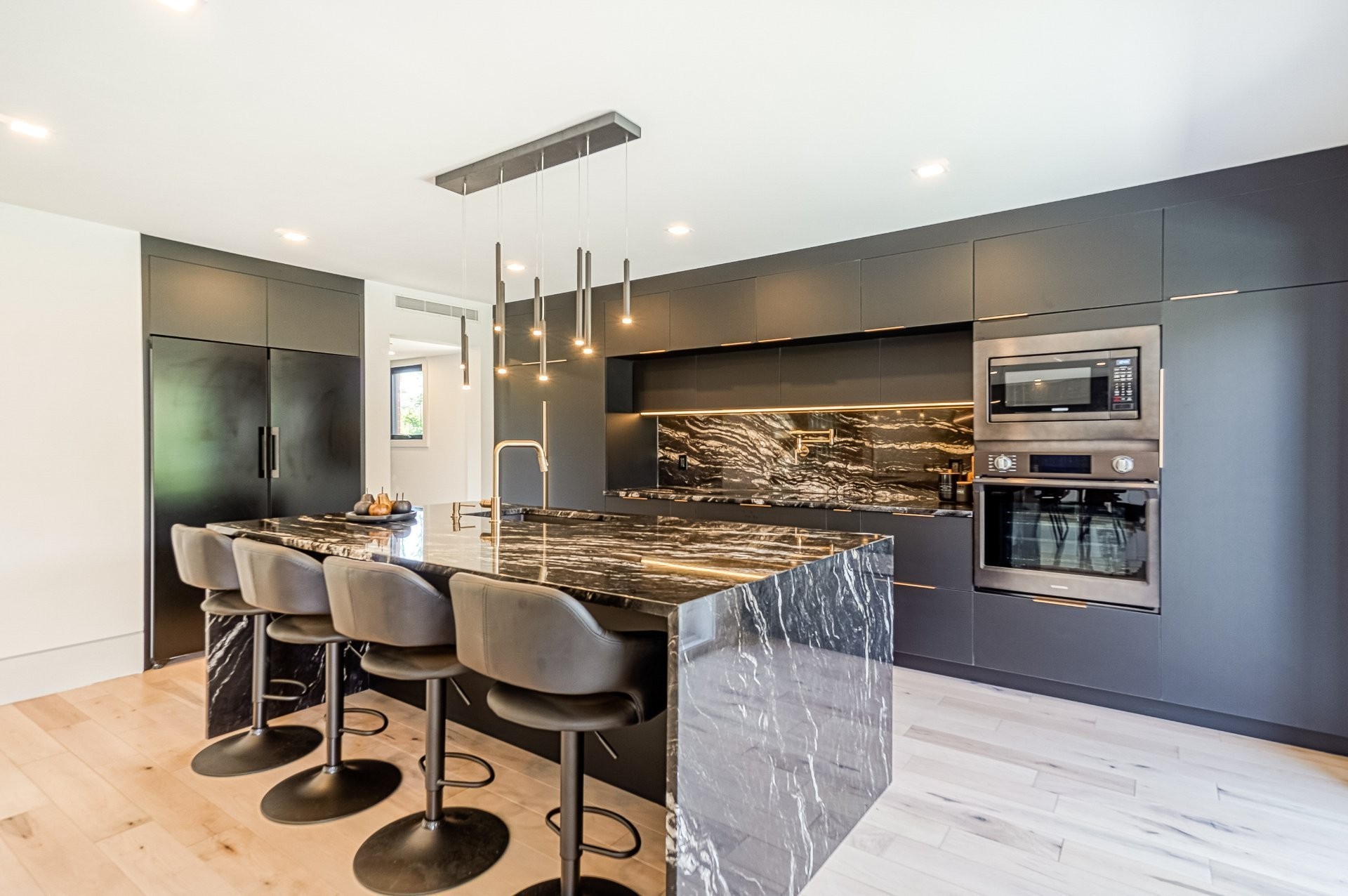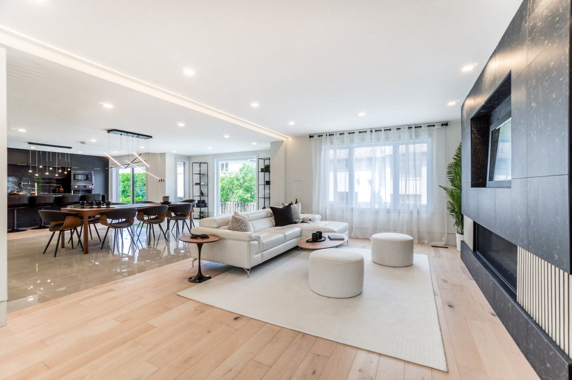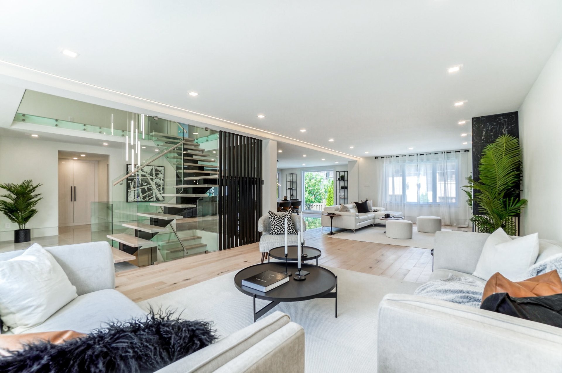 Un escalier en bois positionné au centre de cette maison est une caractéristique essentielle qui vous permet d'admirer le mélange de structure noir mat mélangé à des panneaux de verre pour donner à cette maison une touche moderne. Continuez le long du rez-de-chaussée, on remarquera un plancher en bois francs, des murs d'accent en lattes allant de différentes tonalités de bois, un élégant foyer au gaz enfermé dans une unité de divertissement en porcelaine mate menant à la grande cuisine. Les accents dorés apportent de la chaleur aux armoires noires élégantes, aidant à styliser et à capturer une cuisine audacieuse et pour finaliser le tout une cuisine de service adjacent.