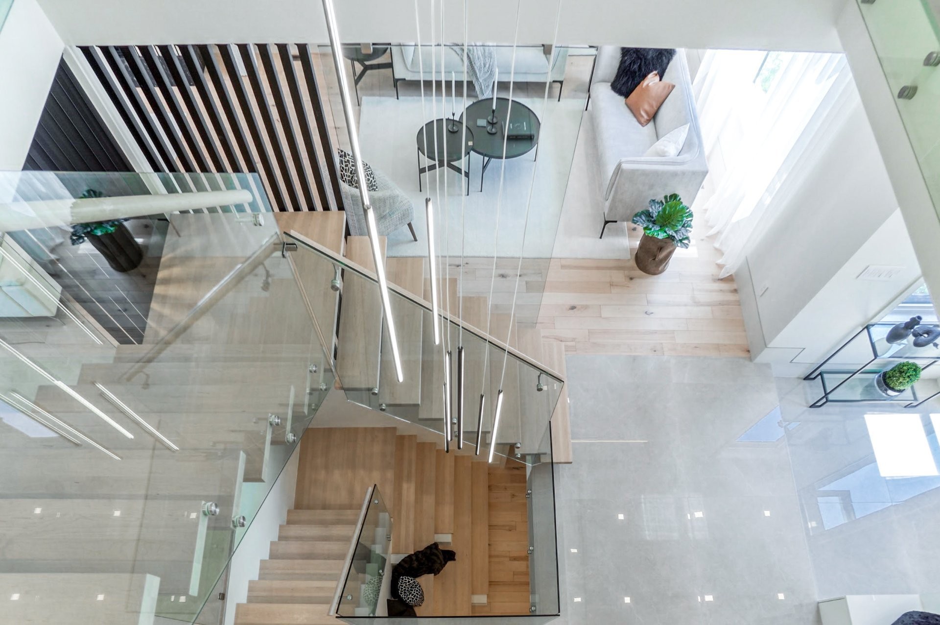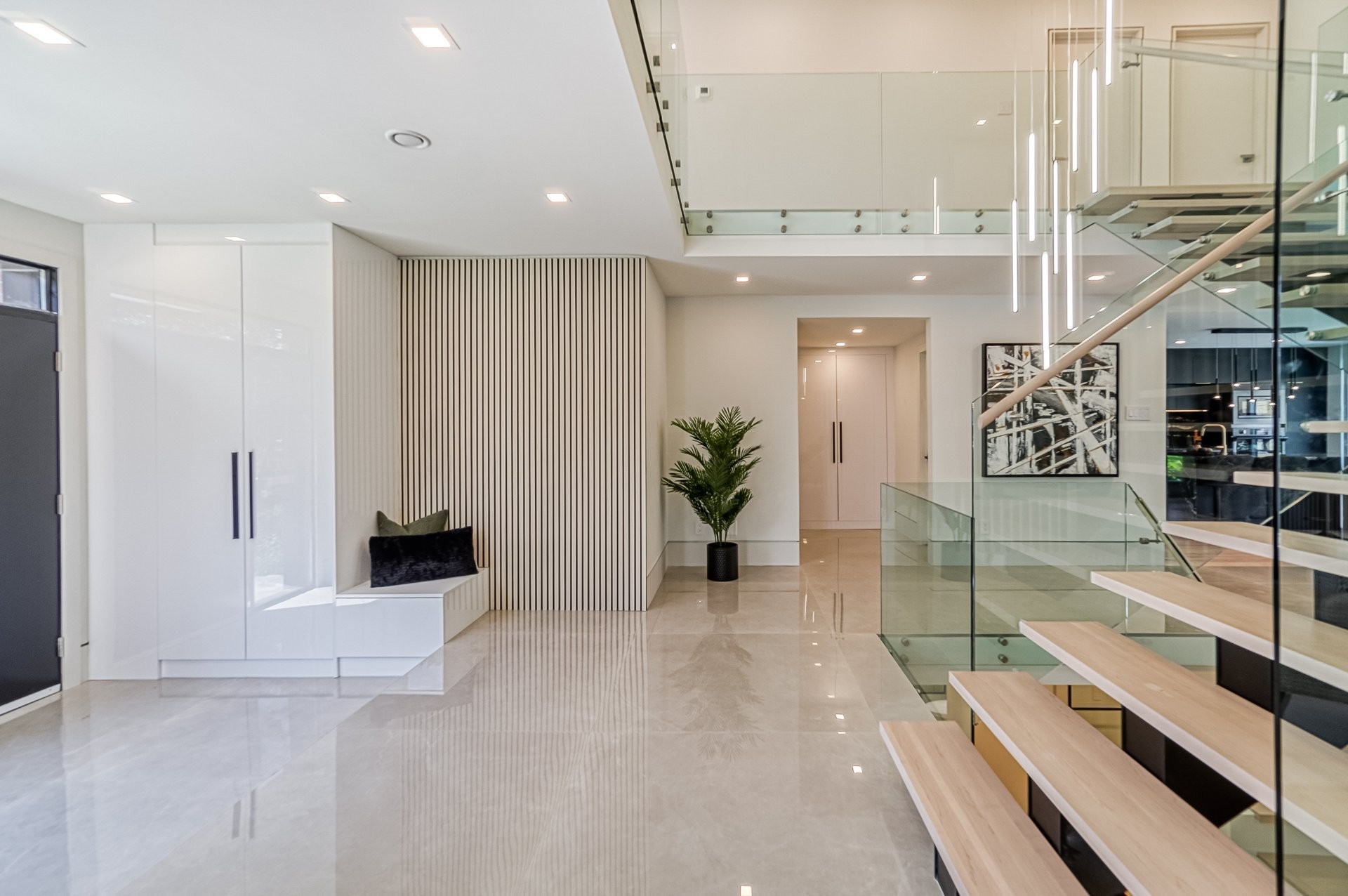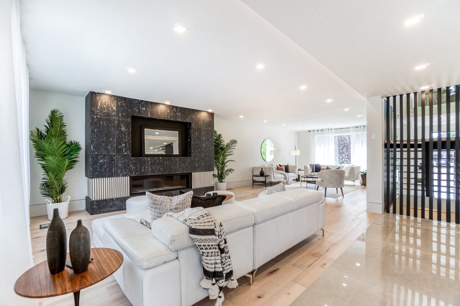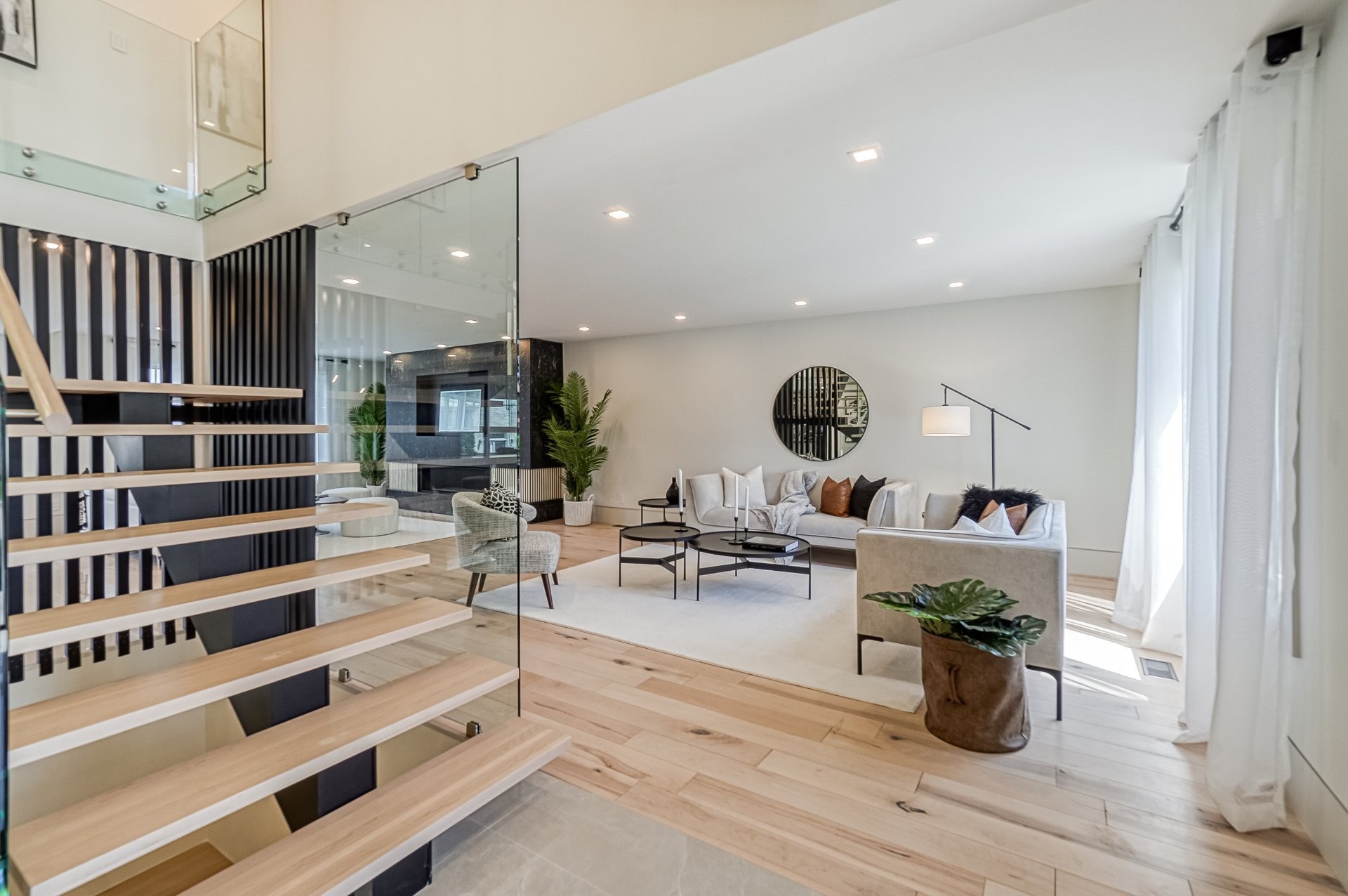 Un escalier en bois positionné au centre de cette maison est une caractéristique essentielle qui vous permet d'admirer le mélange de structure noir mat mélangé à des panneaux de verre pour donner à cette maison une touche moderne. Continuez le long du rez-de-chaussée, on remarquera un plancher en bois francs, des murs d'accent en lattes allant de différentes tonalités de bois, un élégant foyer au gaz enfermé dans une unité de divertissement en porcelaine mate menant à la grande cuisine. Les accents dorés apportent de la chaleur aux armoires noires élégantes, aidant à styliser et à capturer une cuisine audacieuse et pour finaliser le tout une cuisine de service adjacent.