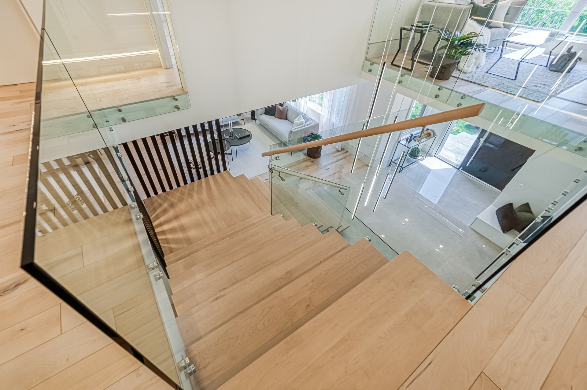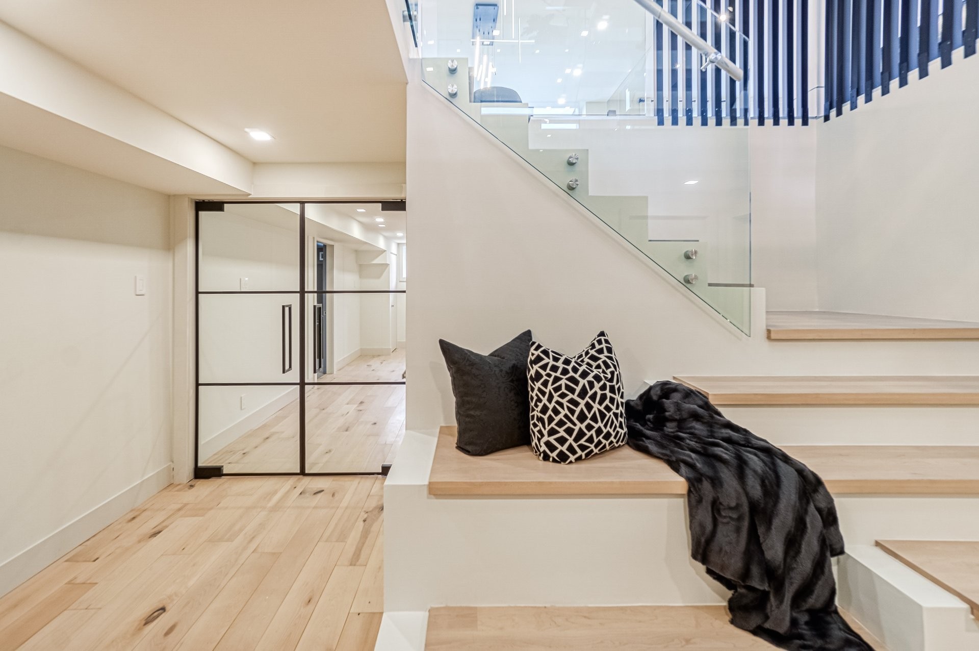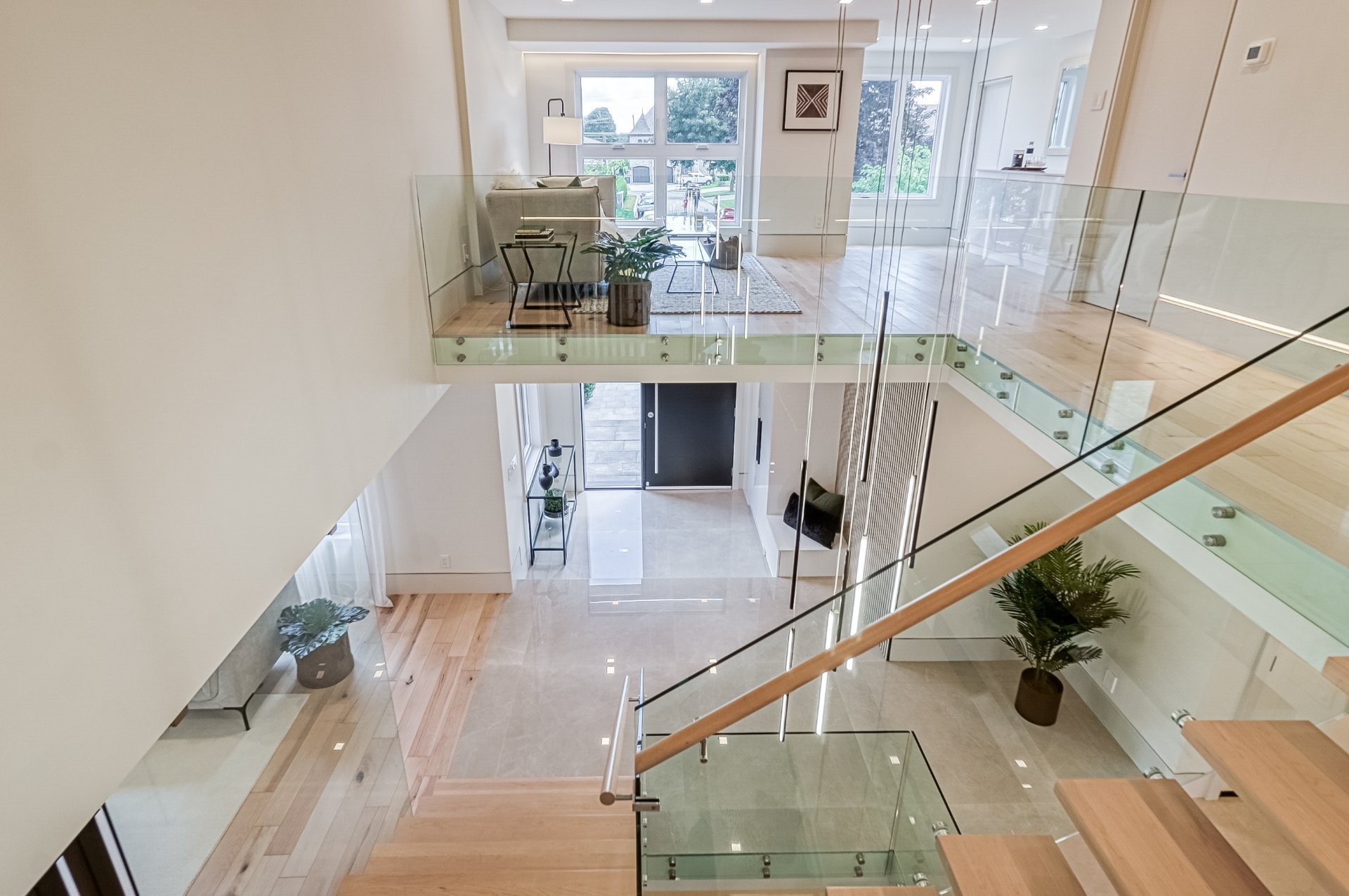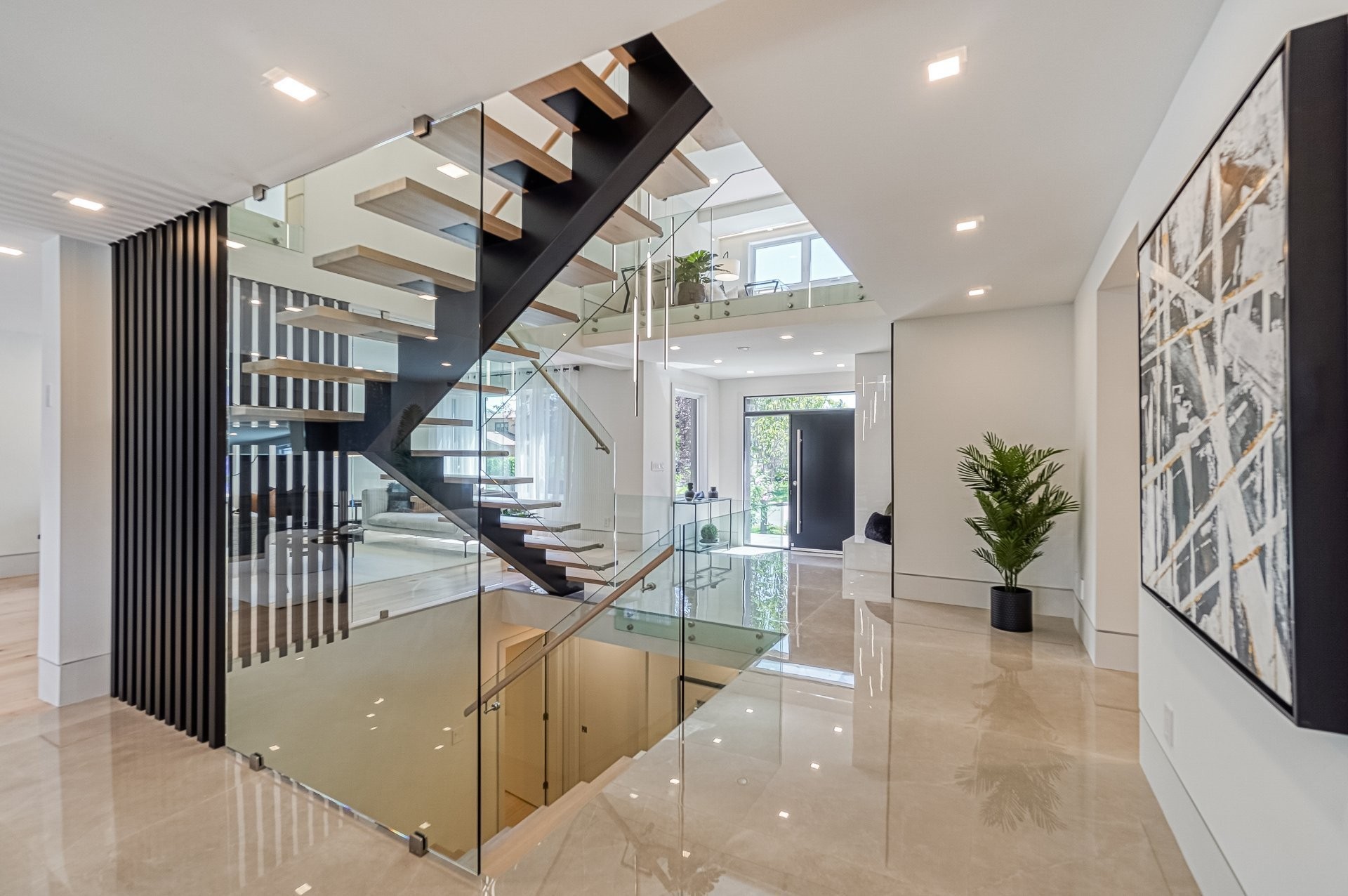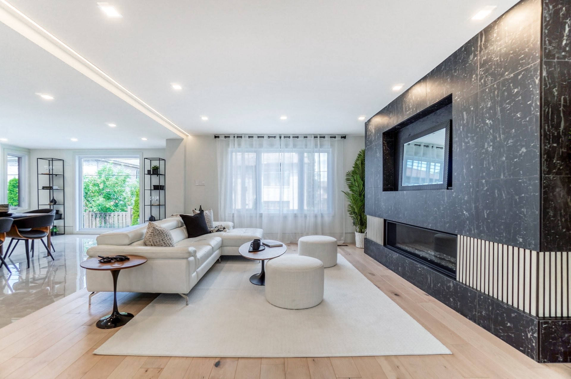 Un escalier en bois positionné au centre de cette maison est une caractéristique essentielle qui vous permet d'admirer le mélange de structure noir mat mélangé à des panneaux de verre pour donner à cette maison une touche moderne. Continuez le long du rez-de-chaussée, on remarquera un plancher en bois francs, des murs d'accent en lattes allant de différentes tonalités de bois, un élégant foyer au gaz enfermé dans une unité de divertissement en porcelaine mate menant à la grande cuisine. Les accents dorés apportent de la chaleur aux armoires noires élégantes, aidant à styliser et à capturer une cuisine audacieuse et pour finaliser le tout une cuisine de service adjacent.