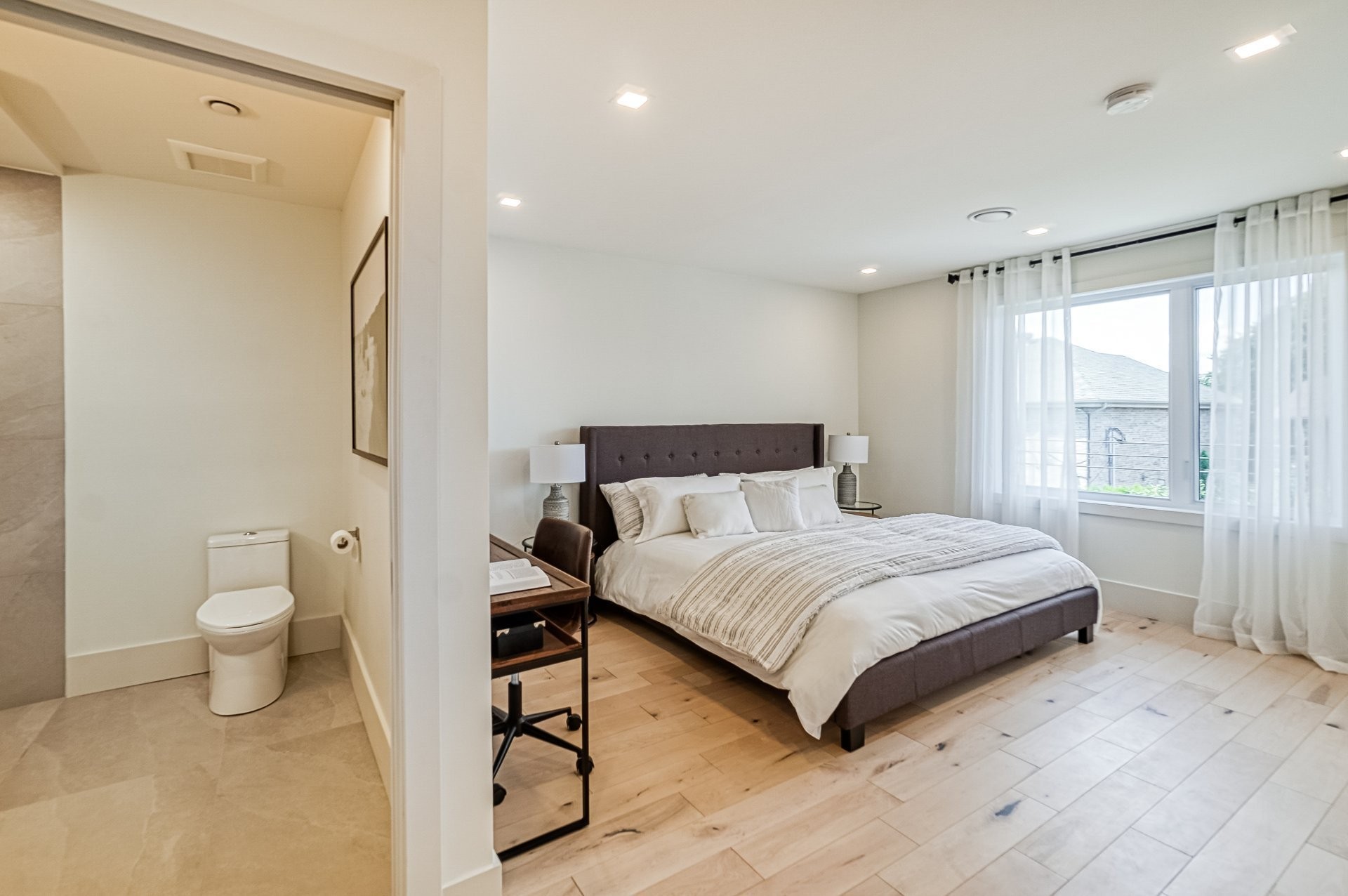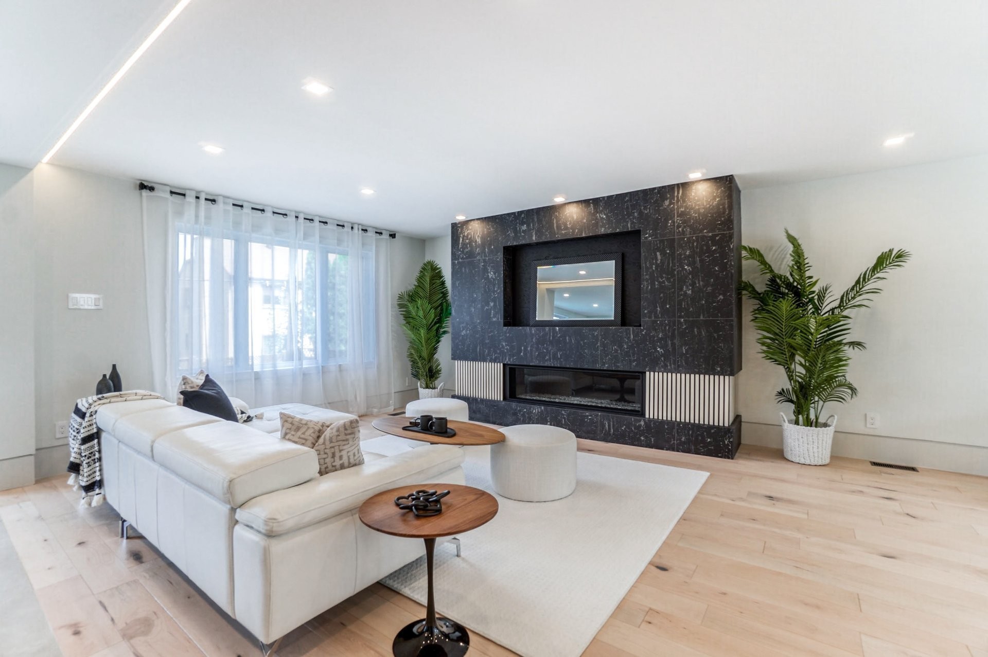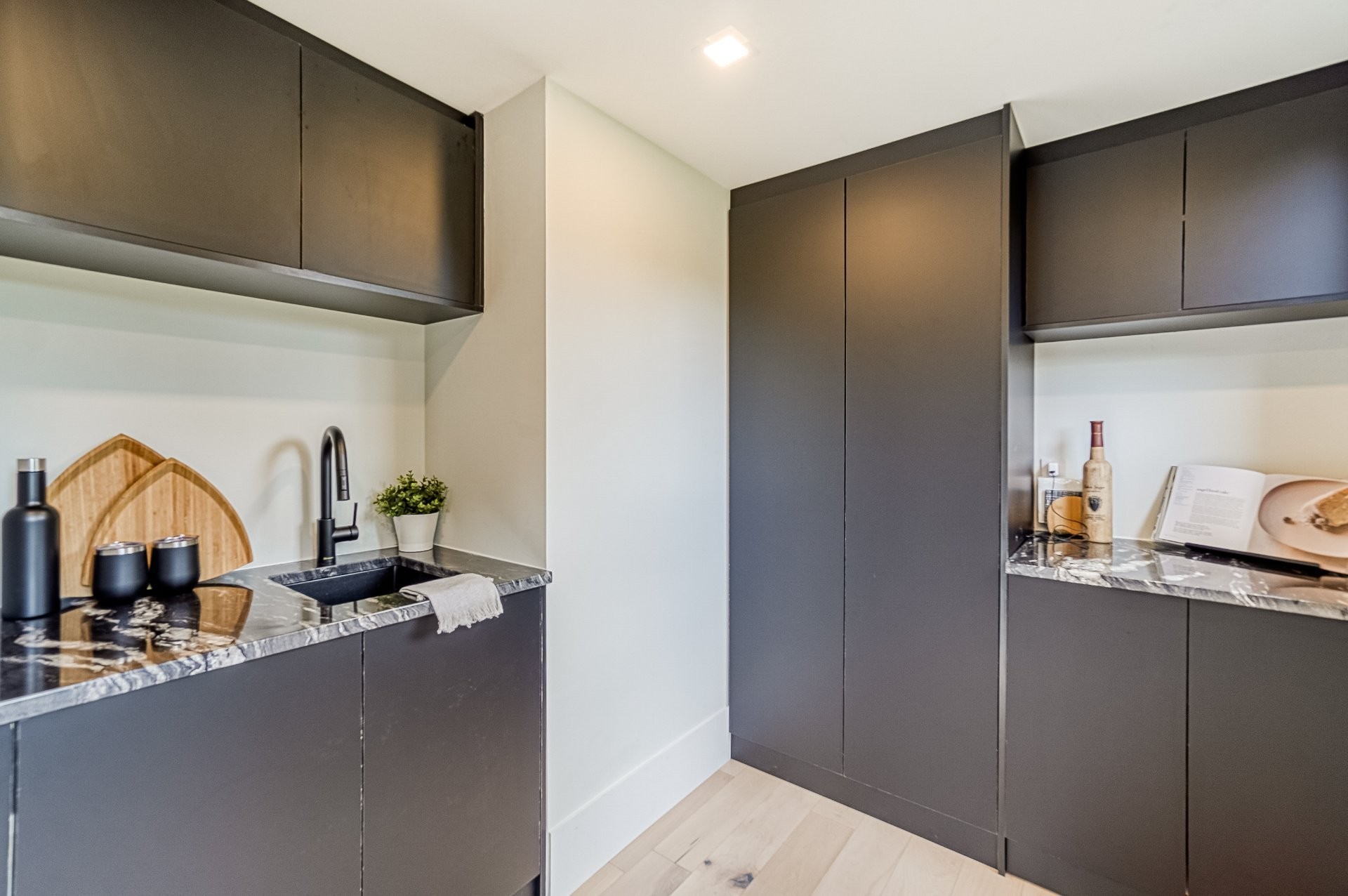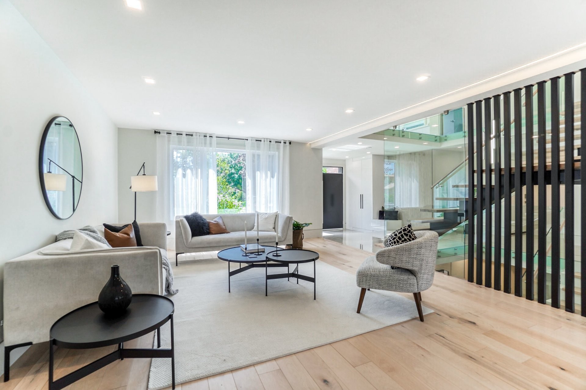 Un escalier en bois positionné au centre de cette maison est une caractéristique essentielle qui vous permet d'admirer le mélange de structure noir mat mélangé à des panneaux de verre pour donner à cette maison une touche moderne. Continuez le long du rez-de-chaussée, on remarquera un plancher en bois francs, des murs d'accent en lattes allant de différentes tonalités de bois, un élégant foyer au gaz enfermé dans une unité de divertissement en porcelaine mate menant à la grande cuisine. Les accents dorés apportent de la chaleur aux armoires noires élégantes, aidant à styliser et à capturer une cuisine audacieuse et pour finaliser le tout une cuisine de service adjacent.
