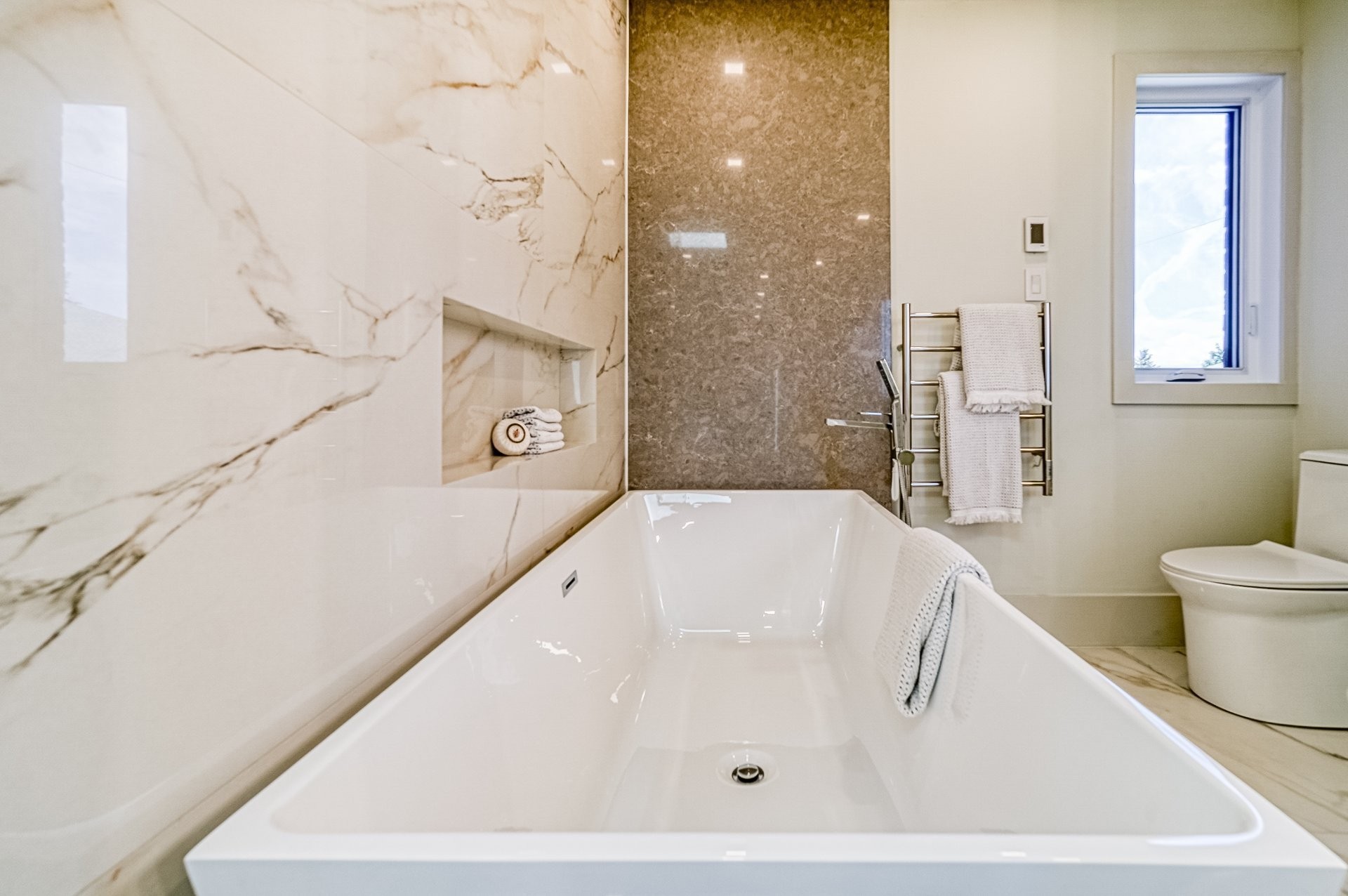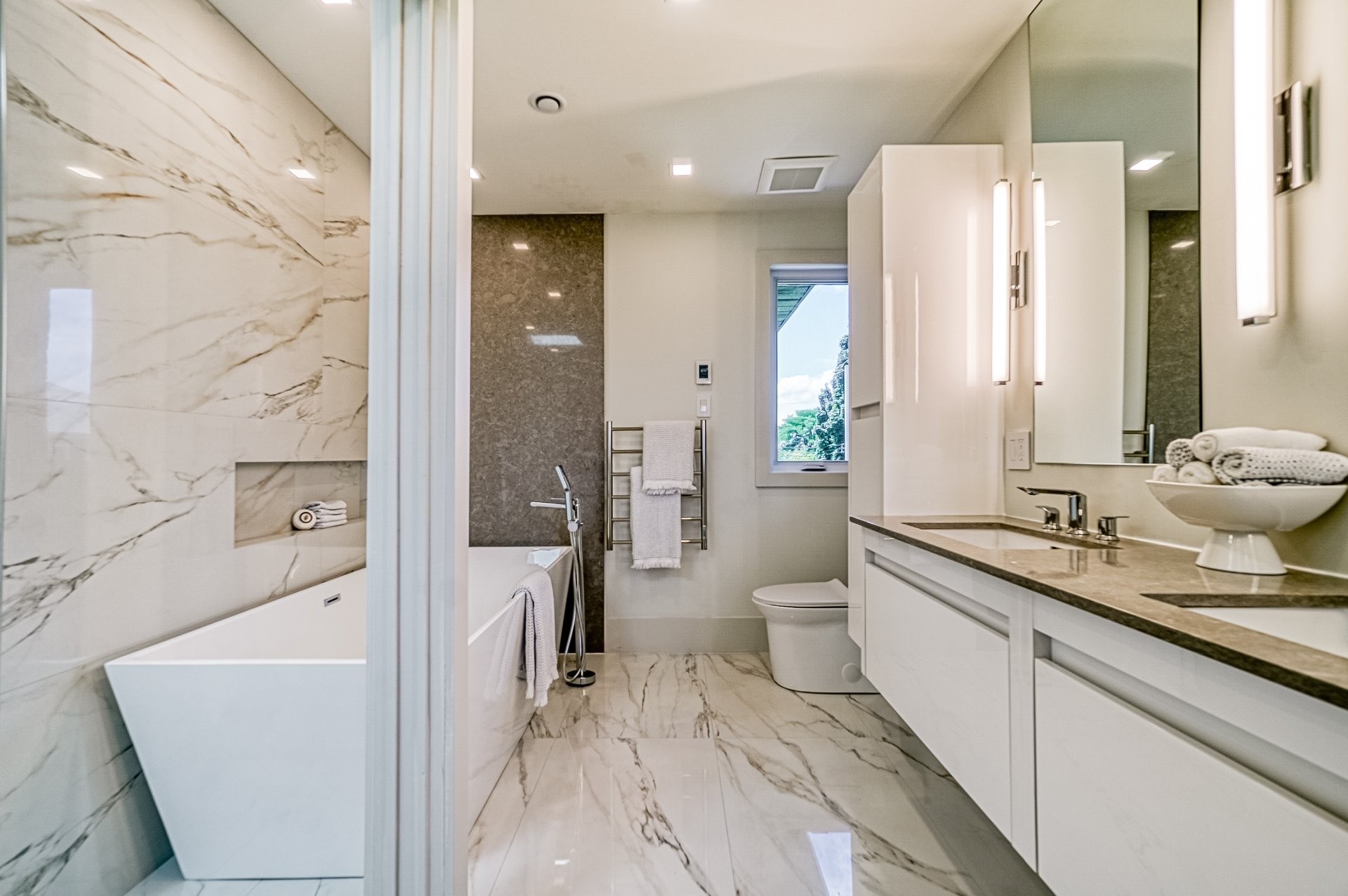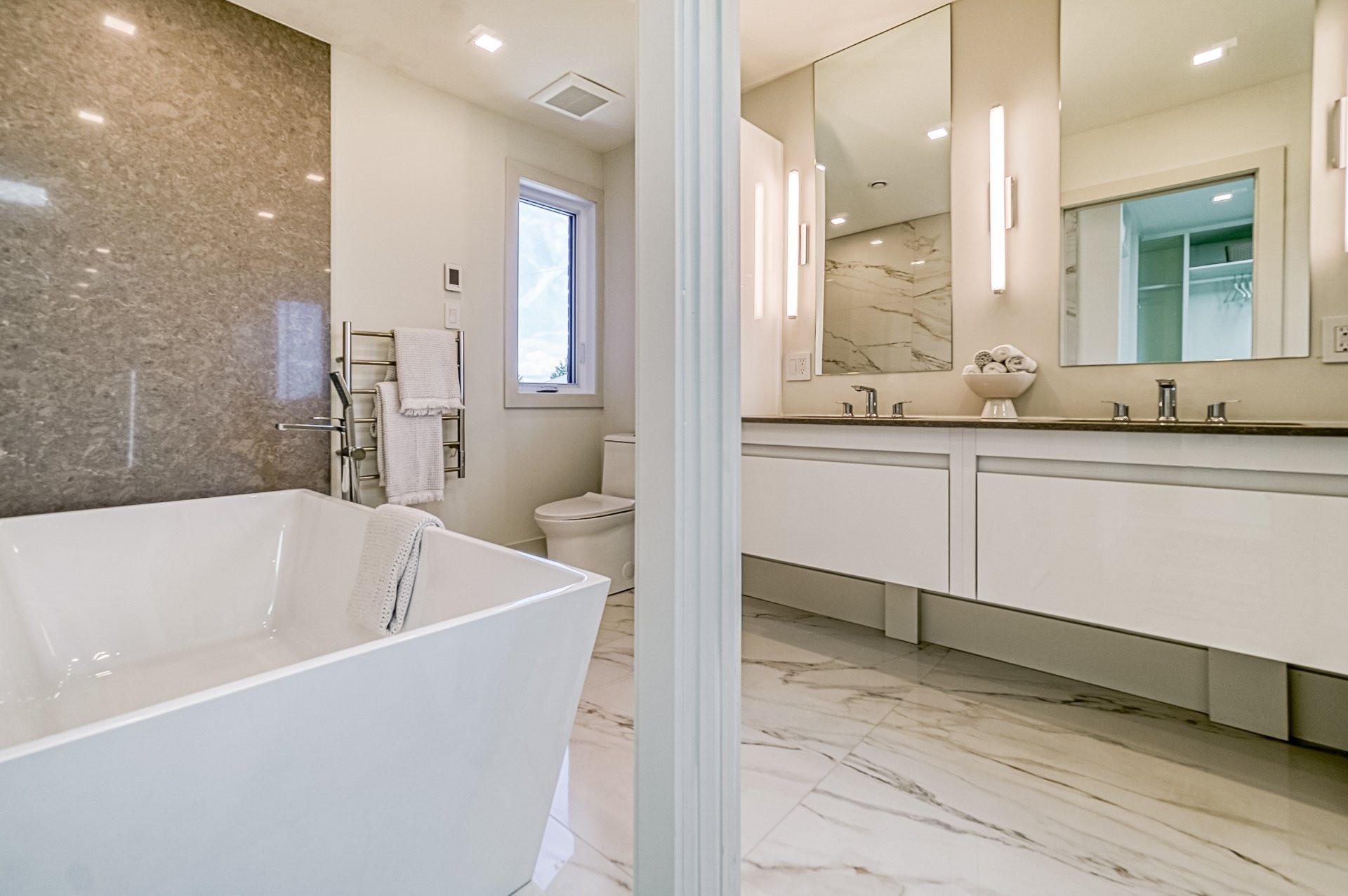 Le plancher chauffant en céramique avec une finition lustrée crée une atmosphère confortable et riche rendant hommage aux nombreux tons neutres que l'on retrouve dans cette maison.