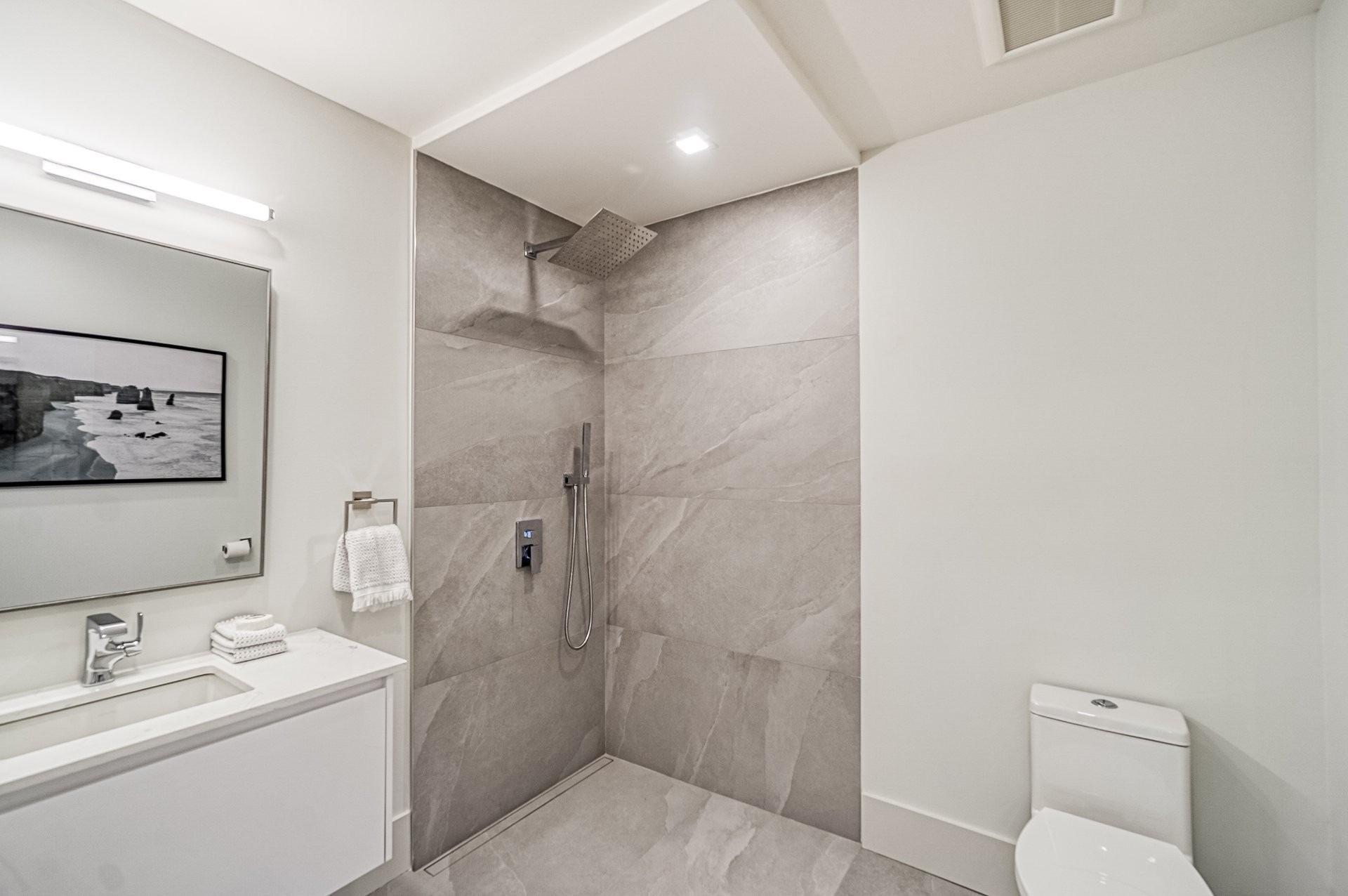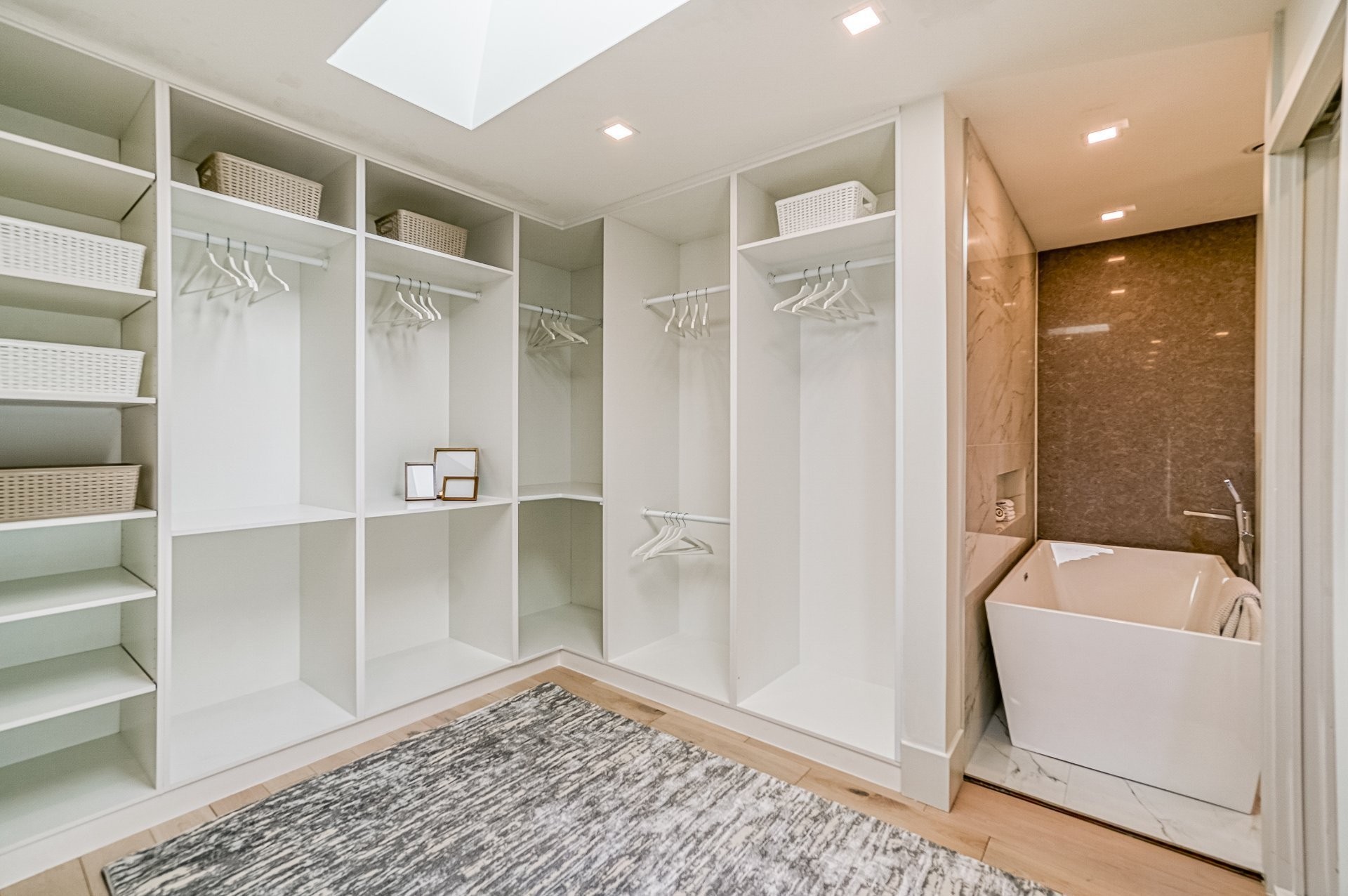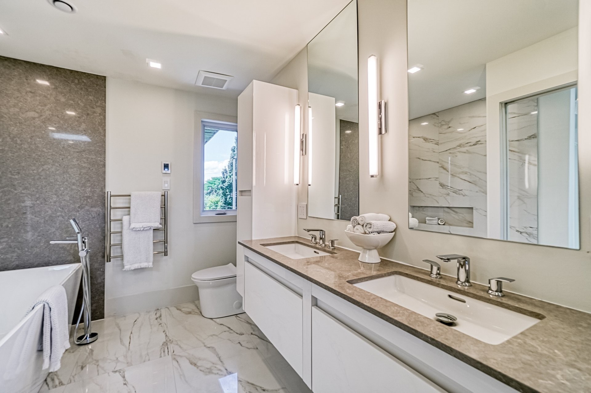 Le plancher chauffant en céramique avec une finition lustrée crée une atmosphère confortable et riche rendant hommage aux nombreux tons neutres que l'on retrouve dans cette maison.