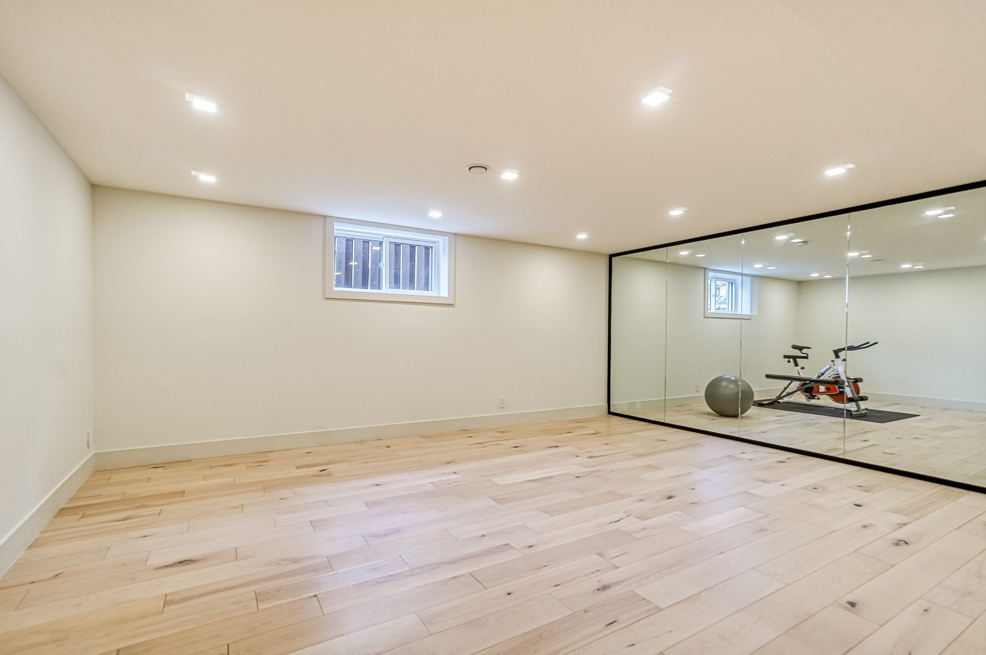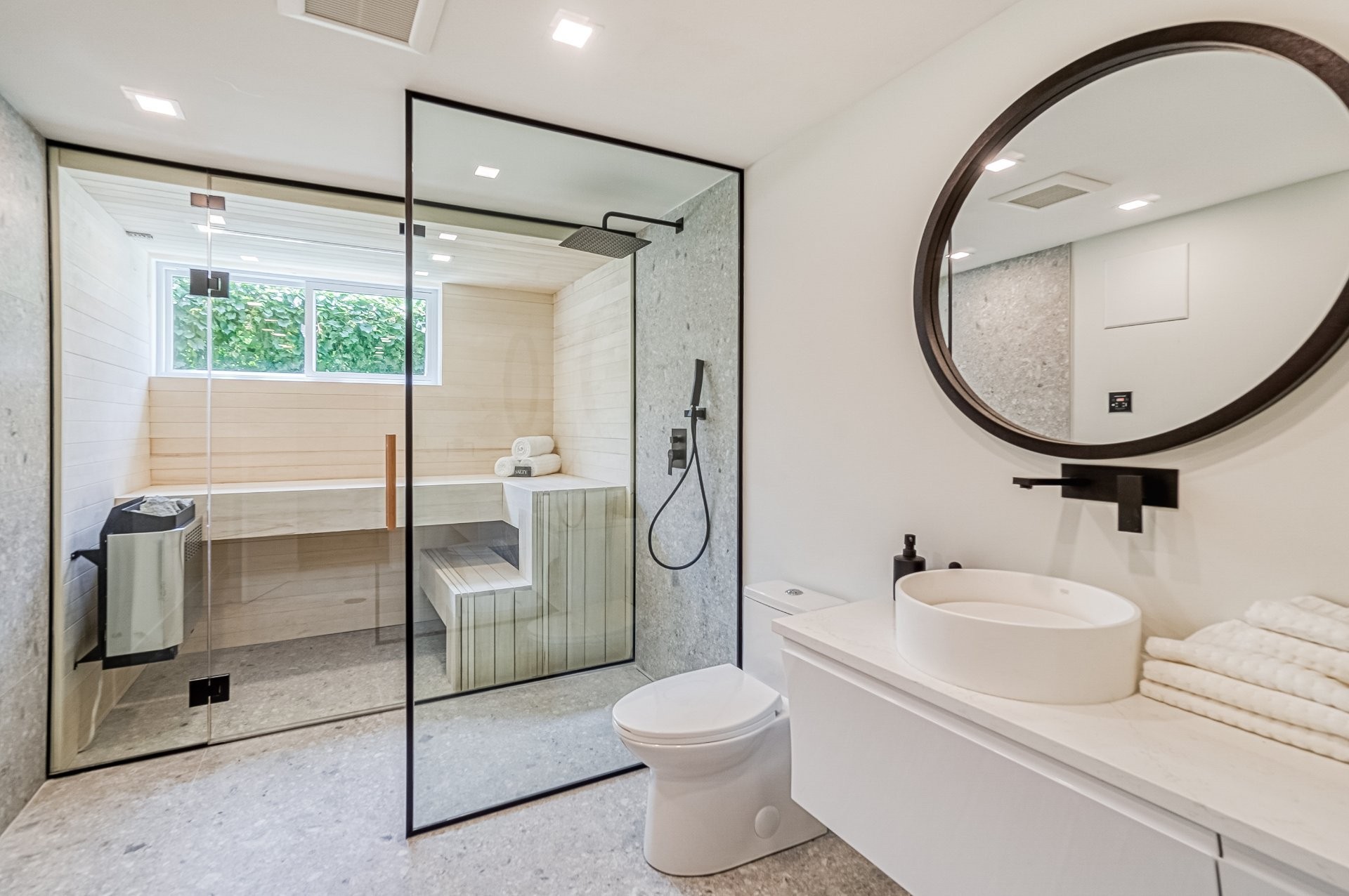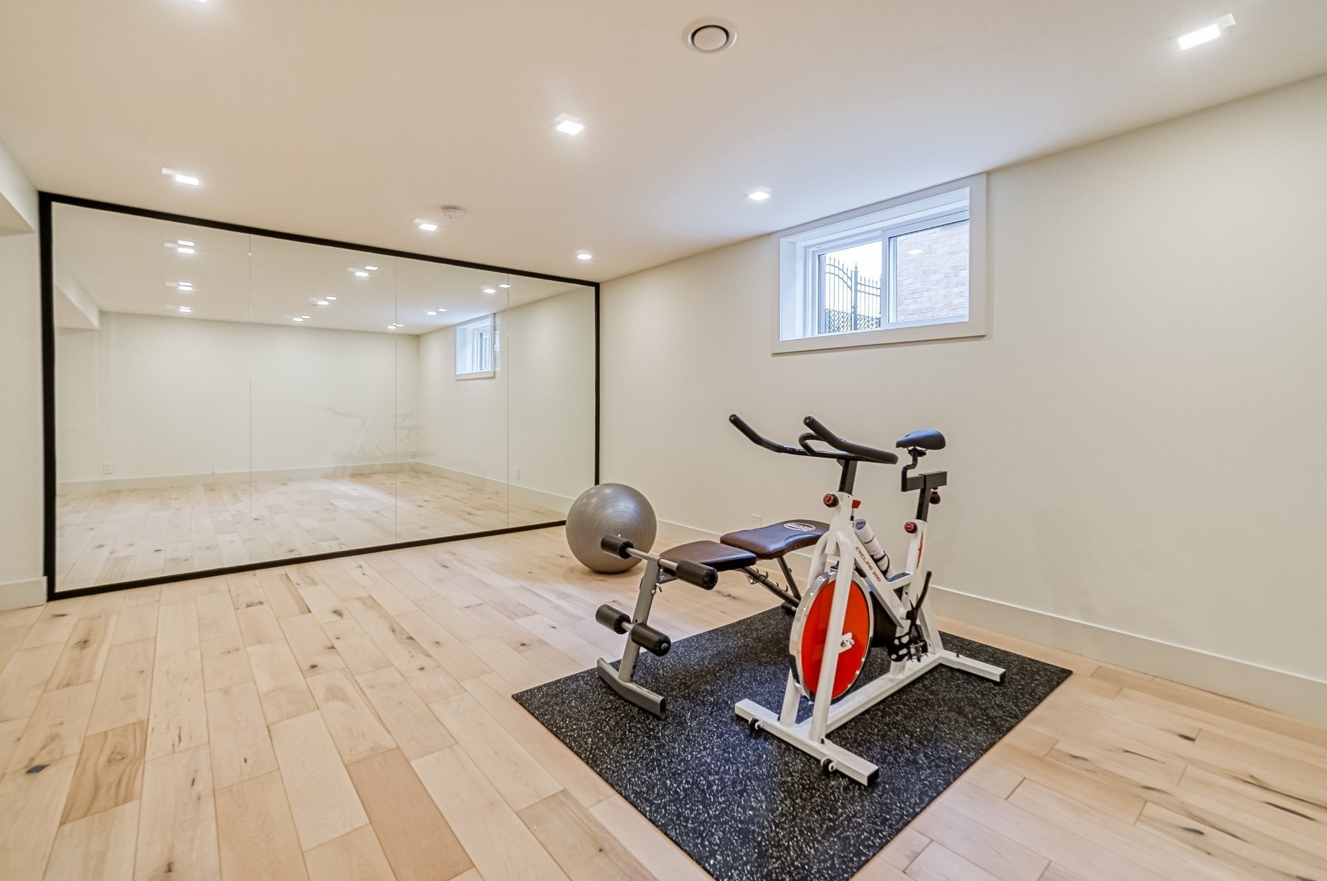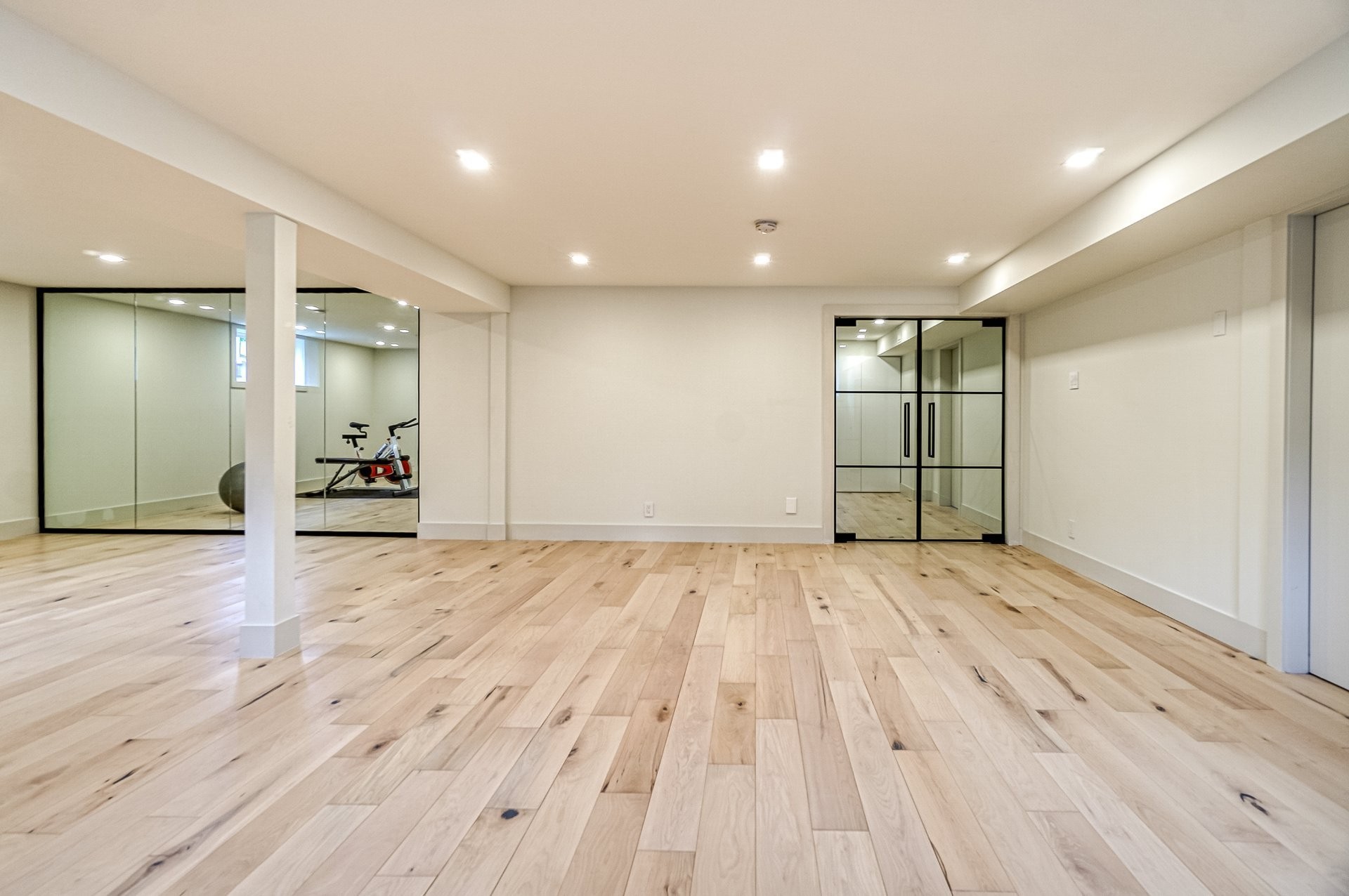 Le sous-sol reflète une relation appropriée avec les niveaux supérieur et principal de cette maison. Les panneaux de verre aux accents métalliques noirs aident à créer une distinction entre la salle familiale et l'espace de remise en forme actuel. Une autre salle de bain complète comprend un sauna en cèdre ajoutant la touche finale au sous-sol. Pour finir une belle salle de cinéma maison pour une expérience de cinéma parfaite.