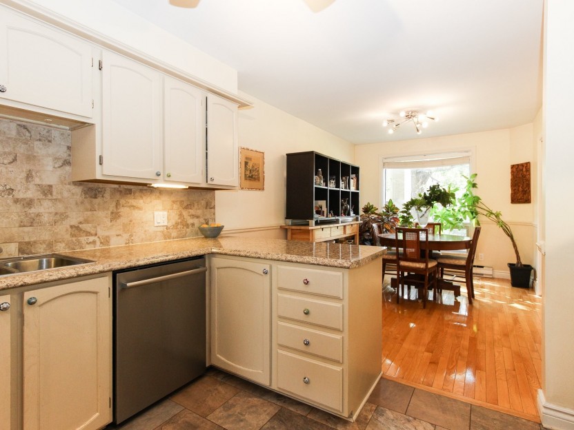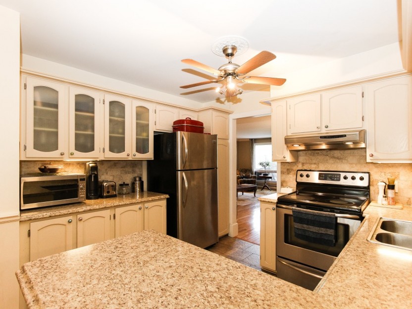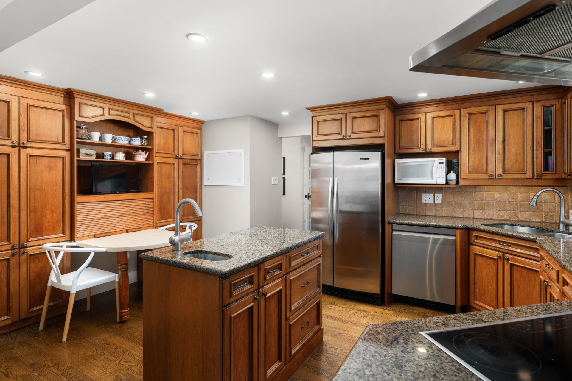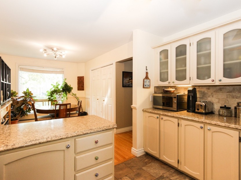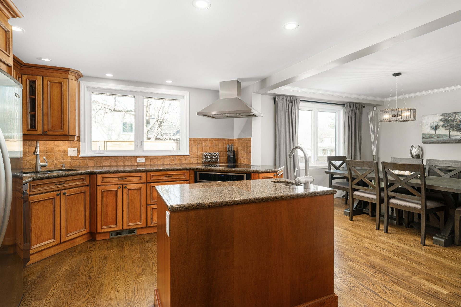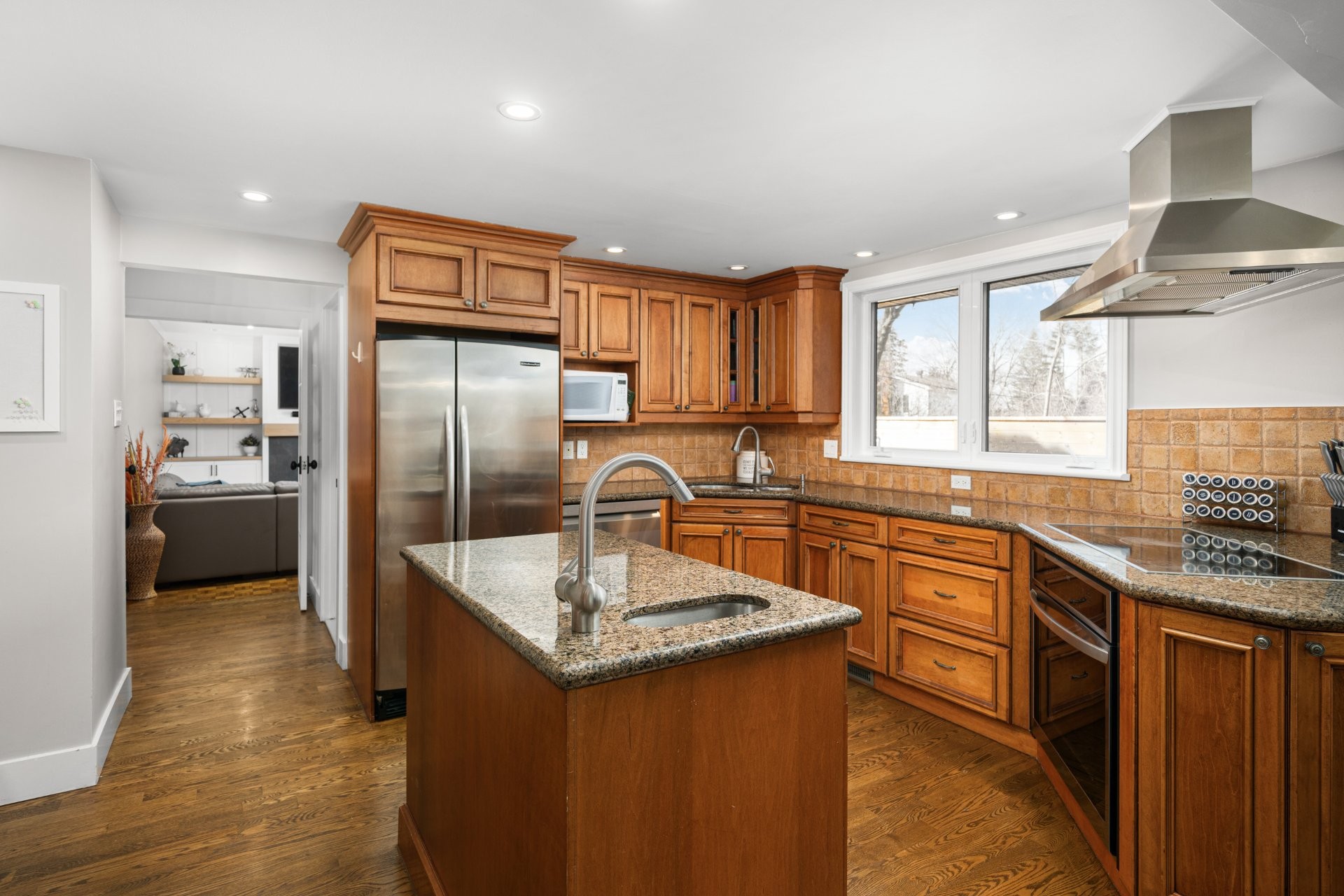La cuisine témoigne d'un savoir-faire de qualité avec ses armoires en bois massif, ses comptoirs en granit durables et son îlot central pratique muni d'un deuxième évier. Tout en conservant un style classique, elle est impeccablement entretenue et constitue un espace central convivial pour le quotidien.
