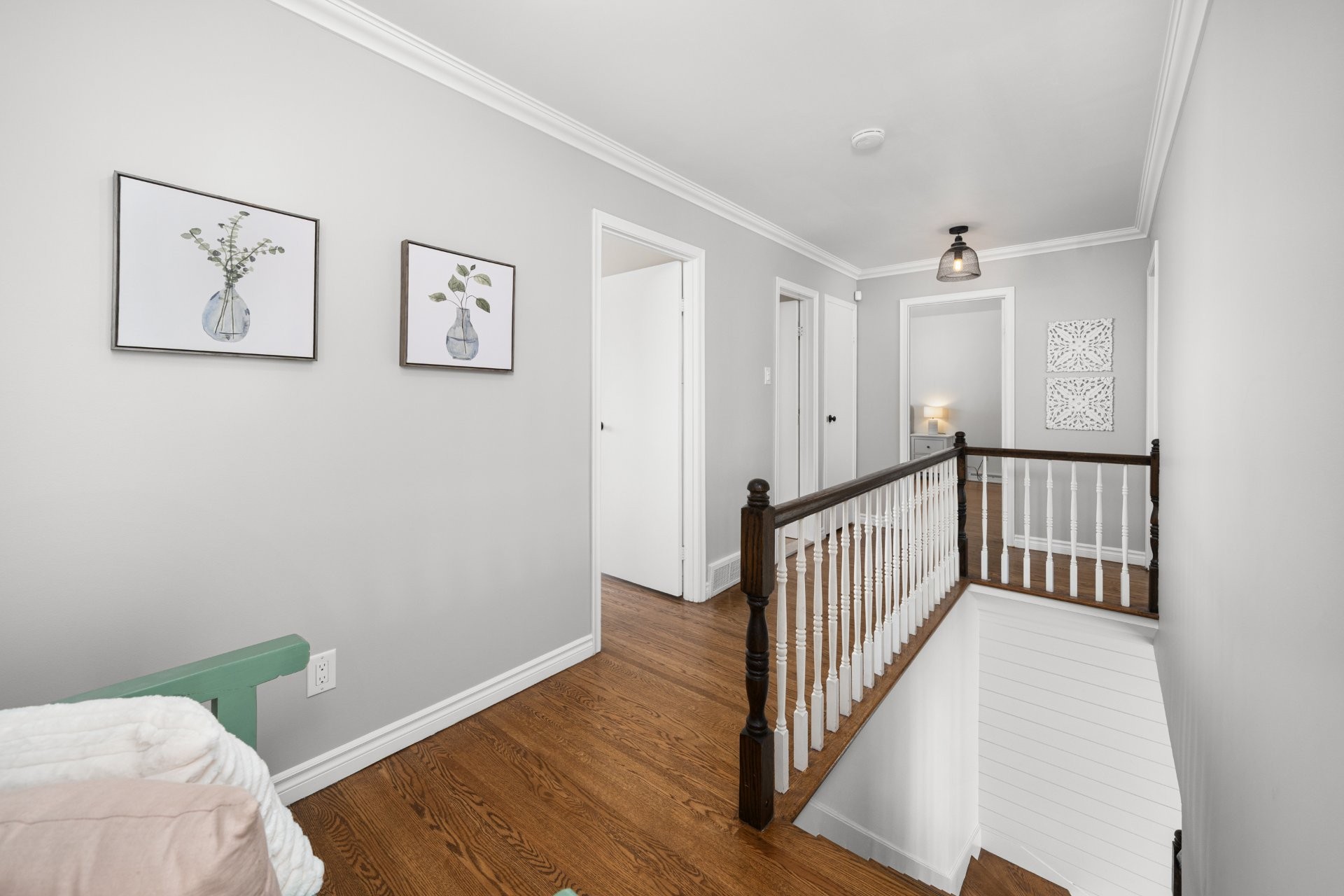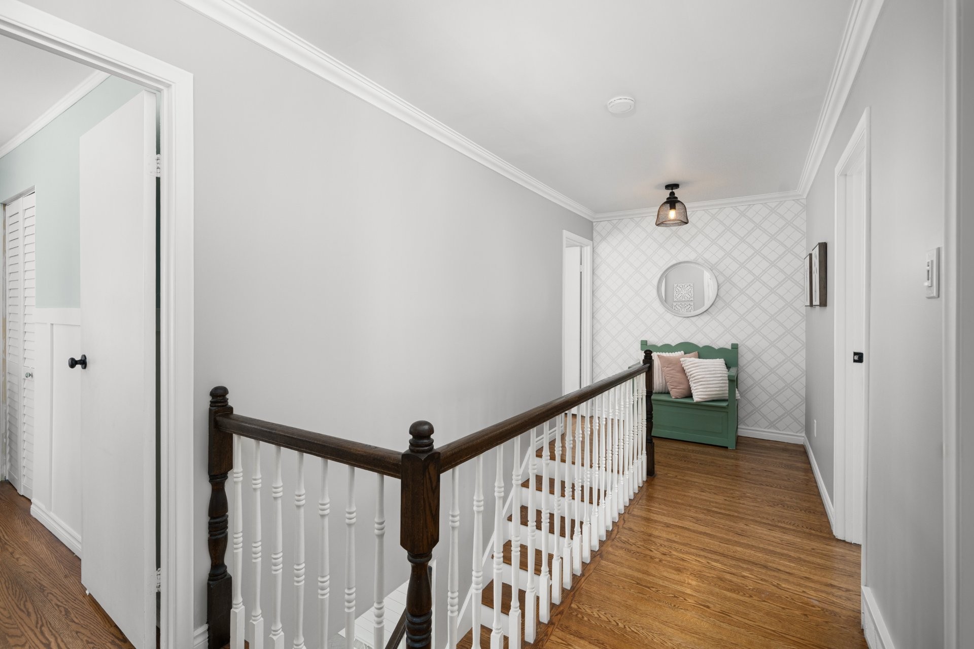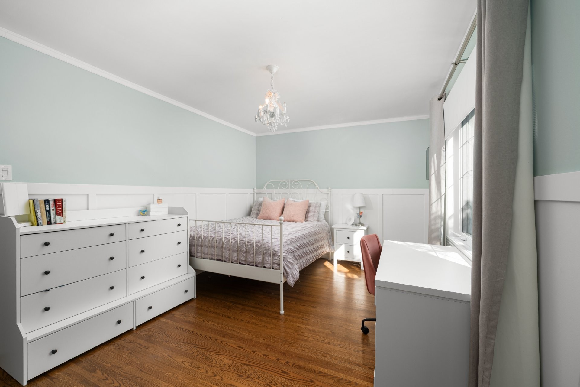 À l'étage, les chambres de dimensions généreuses ont été conçues avec soin, incluant des moulures décoratives dans les chambres des enfants. La suite principale offre un espace de détente paisible avec sa salle de bains attenante.