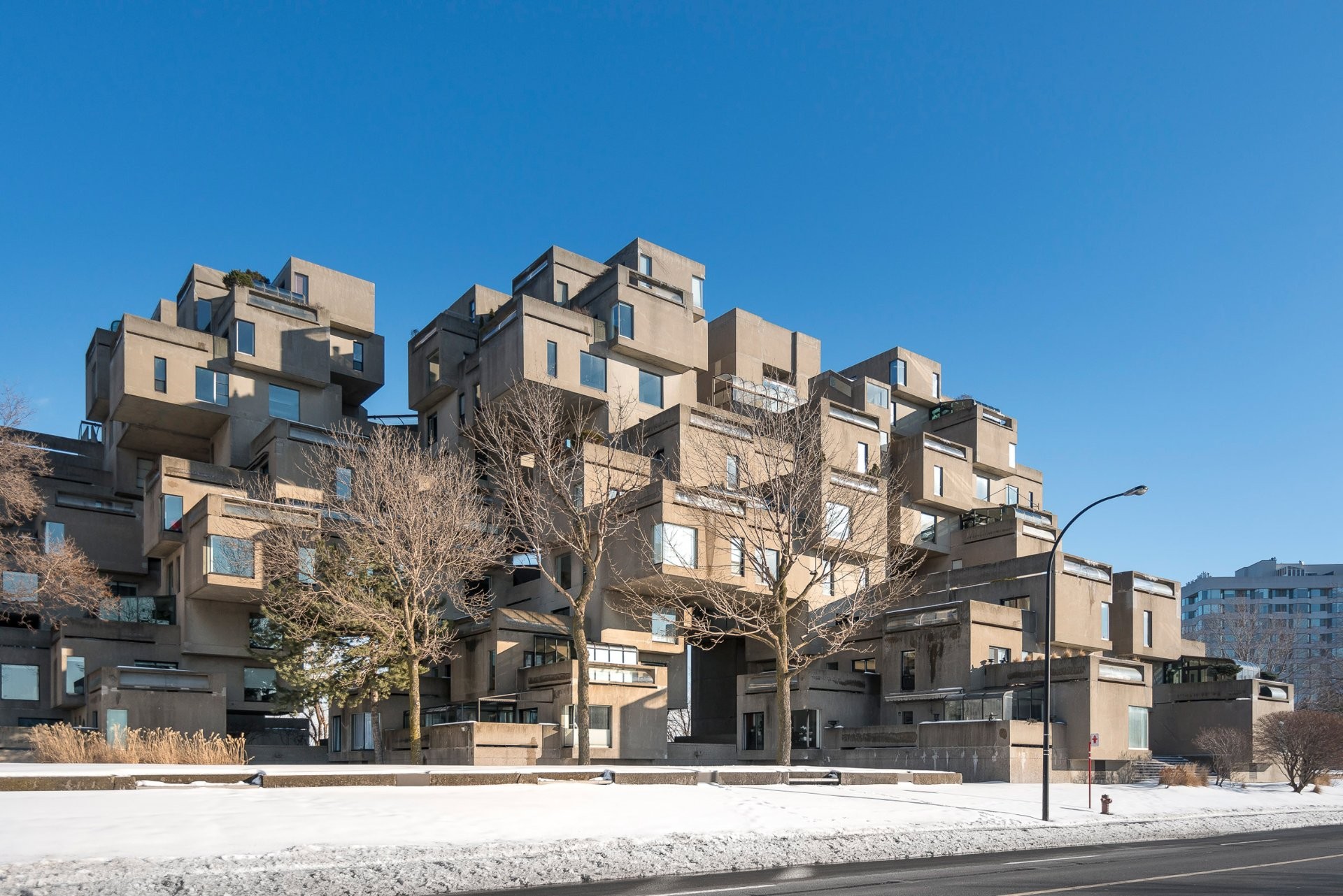 Conçu comme une solution expérimentale à la vie urbaine à haute densité, Habitat 67 empile 354 modules préfabriqués en béton (chacun étant un « cube » massif d'environ 600 pieds carrés pesant 90 tonnes) pour former une structure pyramidale en gradins de 12 étages. Le résultat allie l'intimité et les commodités d'une maison de banlieue (terrasses privées sur le toit, lumière naturelle abondante, espaces extérieurs semblables à des jardins) à l'énergie de la vie urbaine.