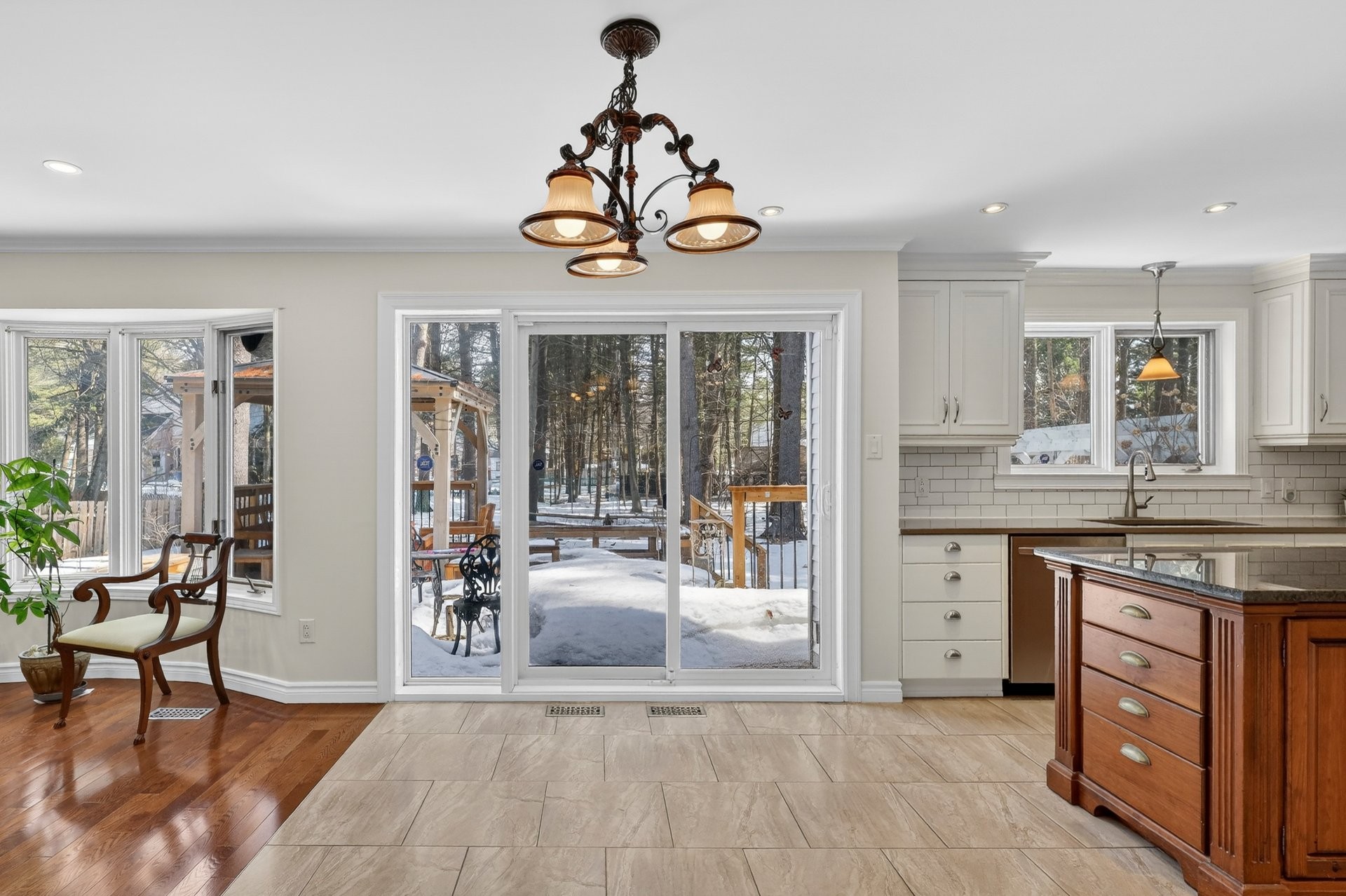 Le coin repas s'ouvre par des portes-patio sur une grande terrasse donnant sur une cour arrière en pointe de tarte, aménagée avec une charmante treille et un espace en pavé uni--idéale pour profiter de l'extérieur.