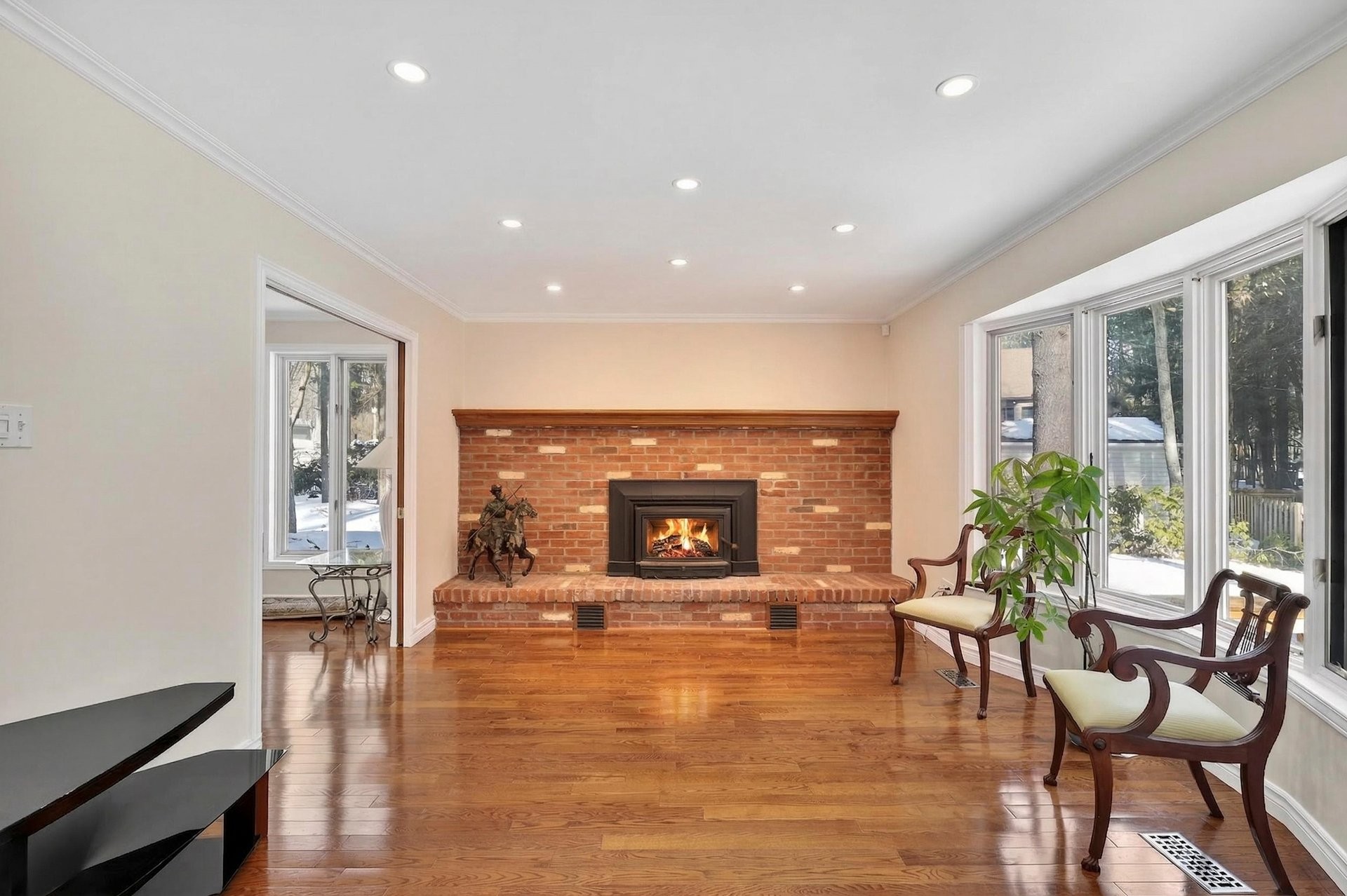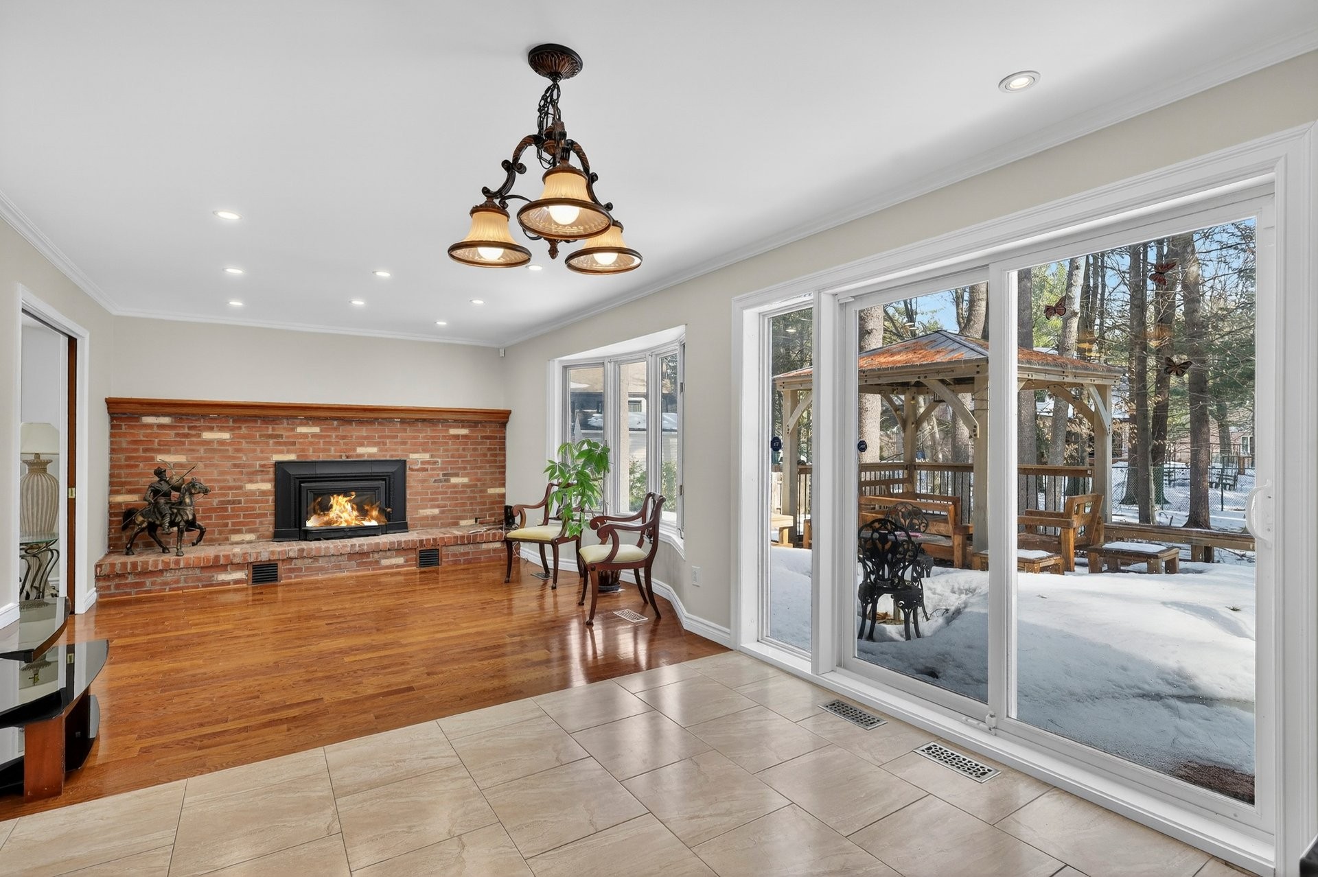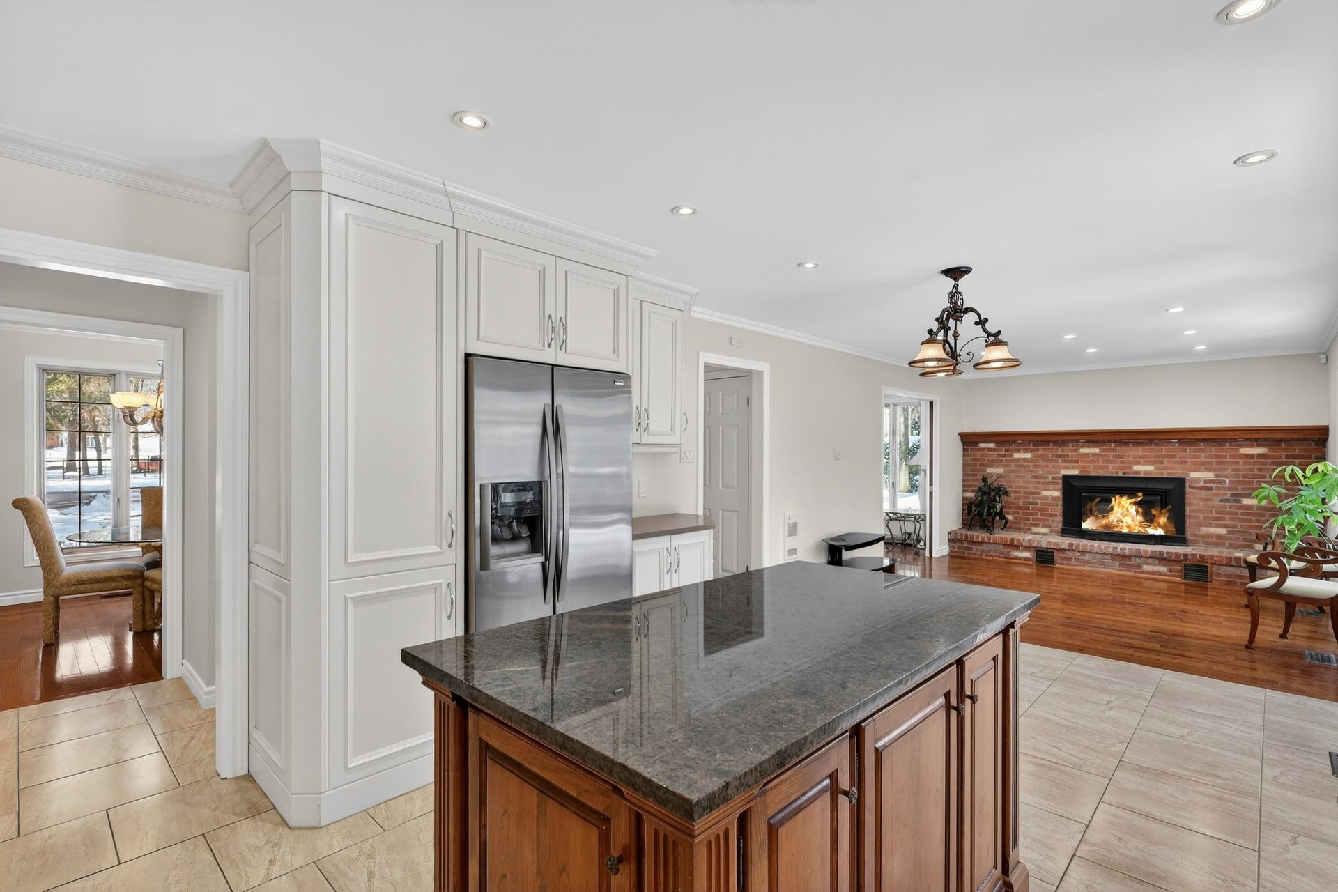 Adjacente au coin repas, la chaleureuse salle familiale est agrémentée de planchers de bois franc et d'un mur de briques avec foyer au bois, créant une ambiance conviviale.