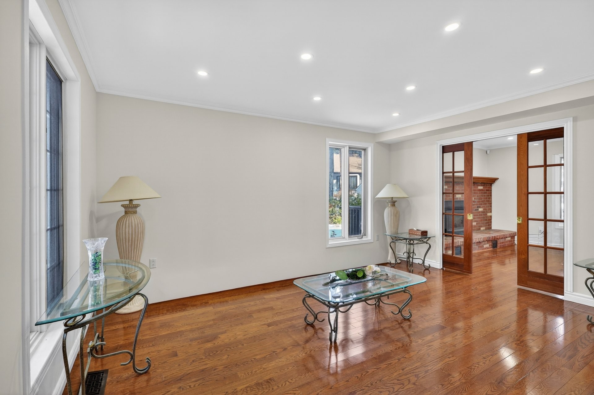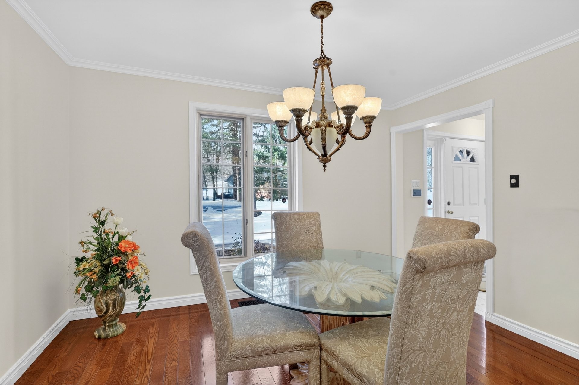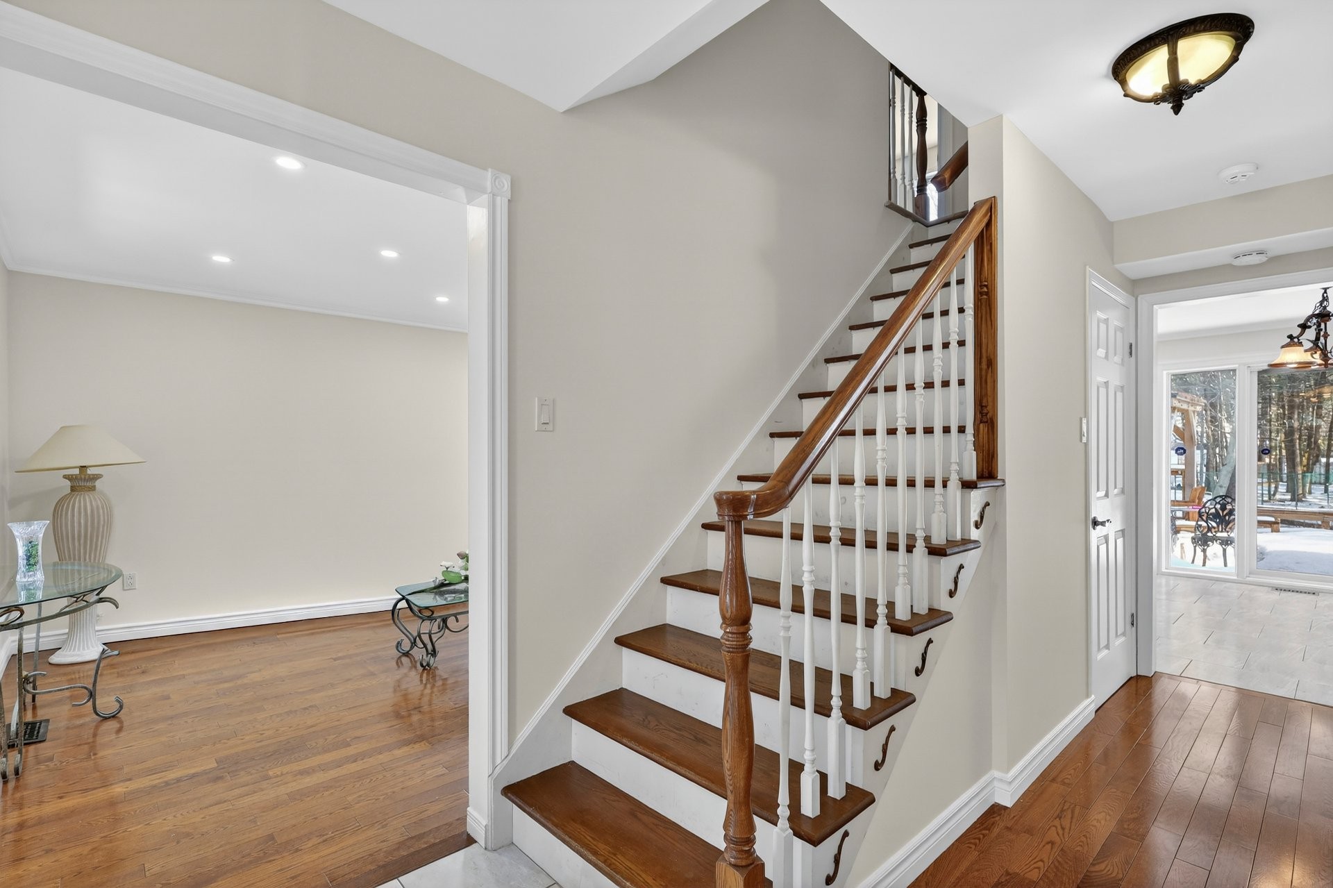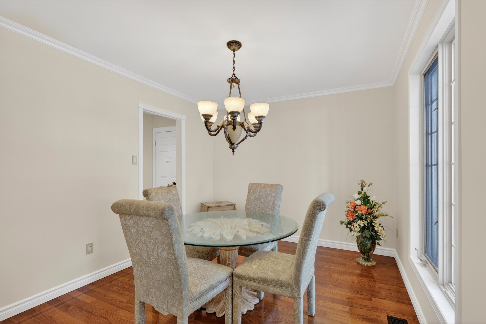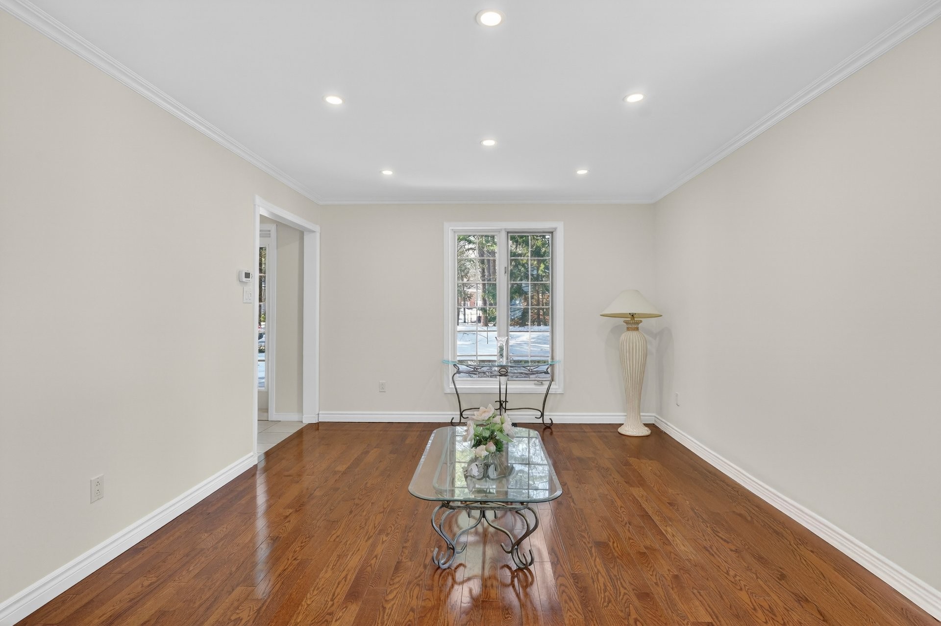 La propriété propose un plan à hall central classique avec salon et salle à manger formels, tous deux dotés de planchers de bois franc.