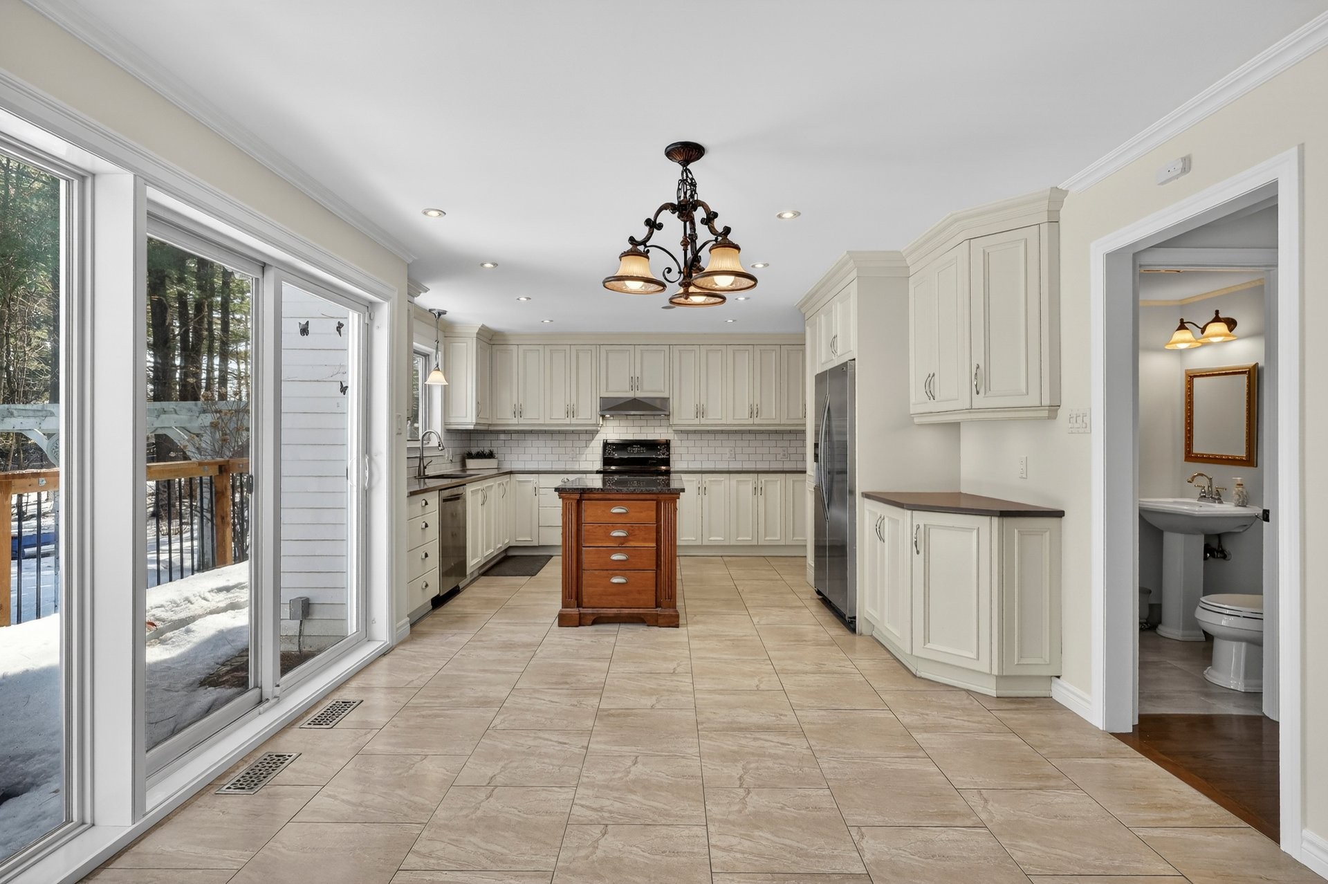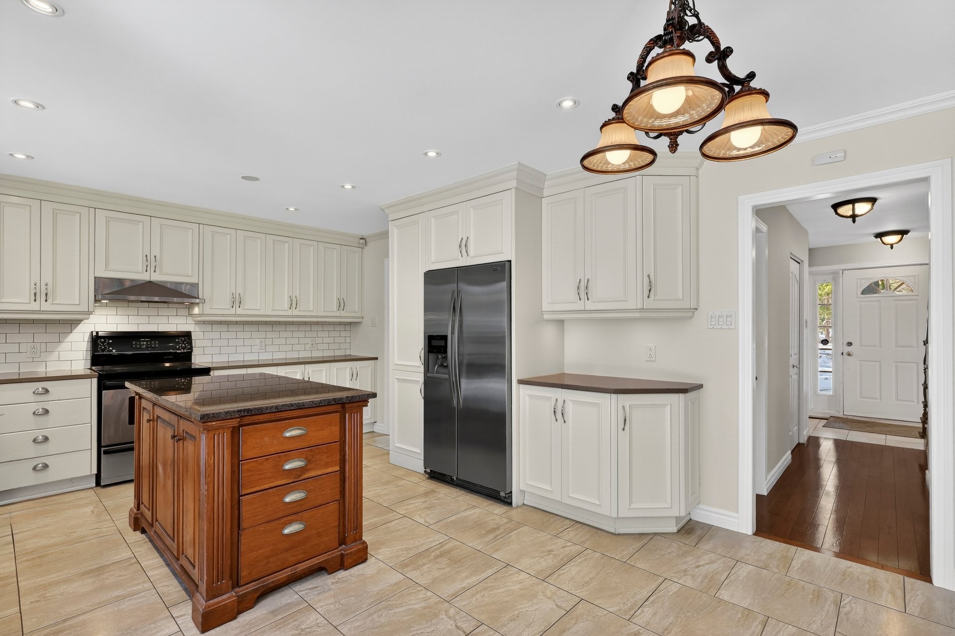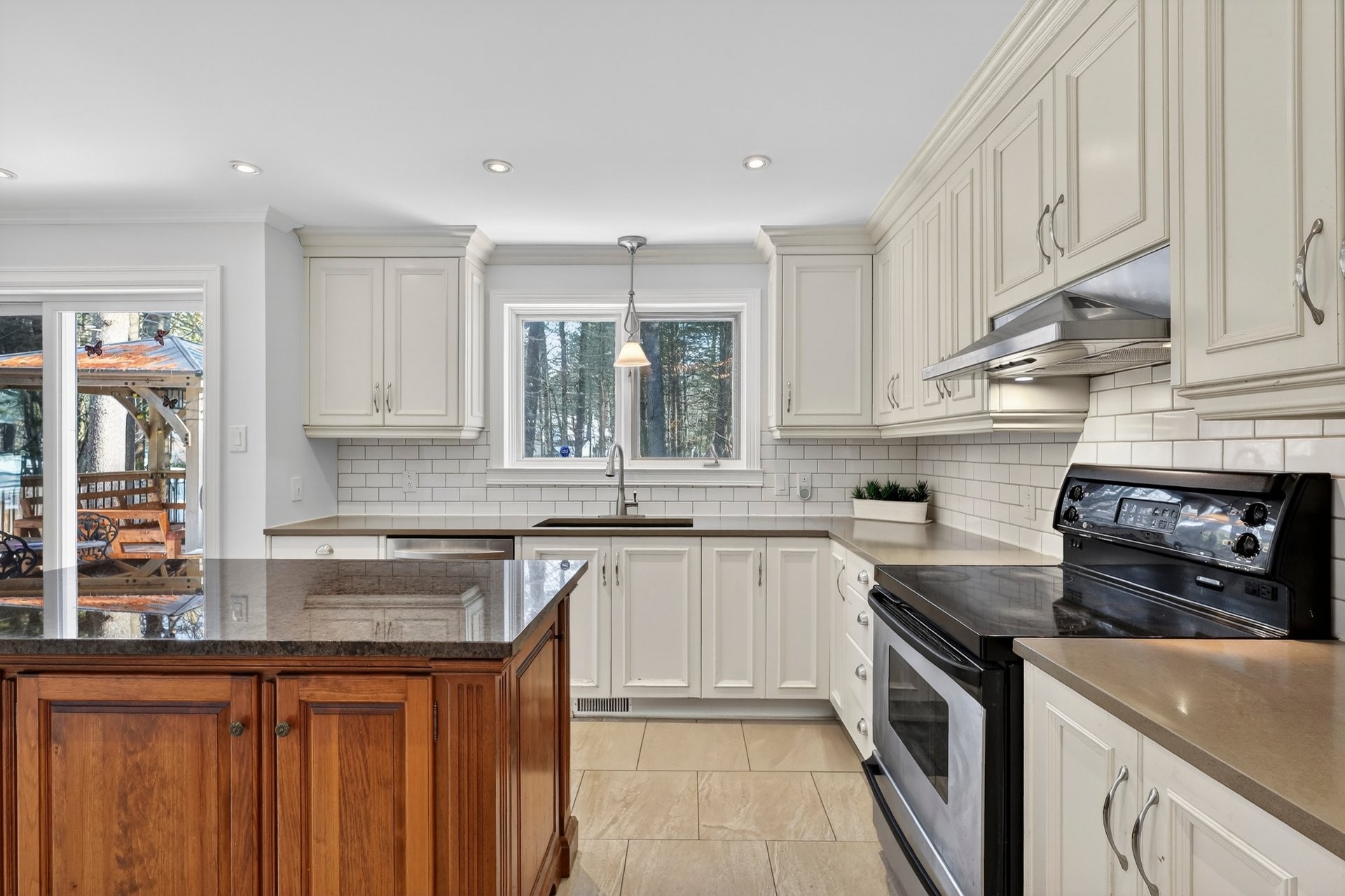 La cuisine rénovée se distingue par ses comptoirs en quartz, son îlot central et son aire ouverte fluide vers le coin repas et la salle familiale.