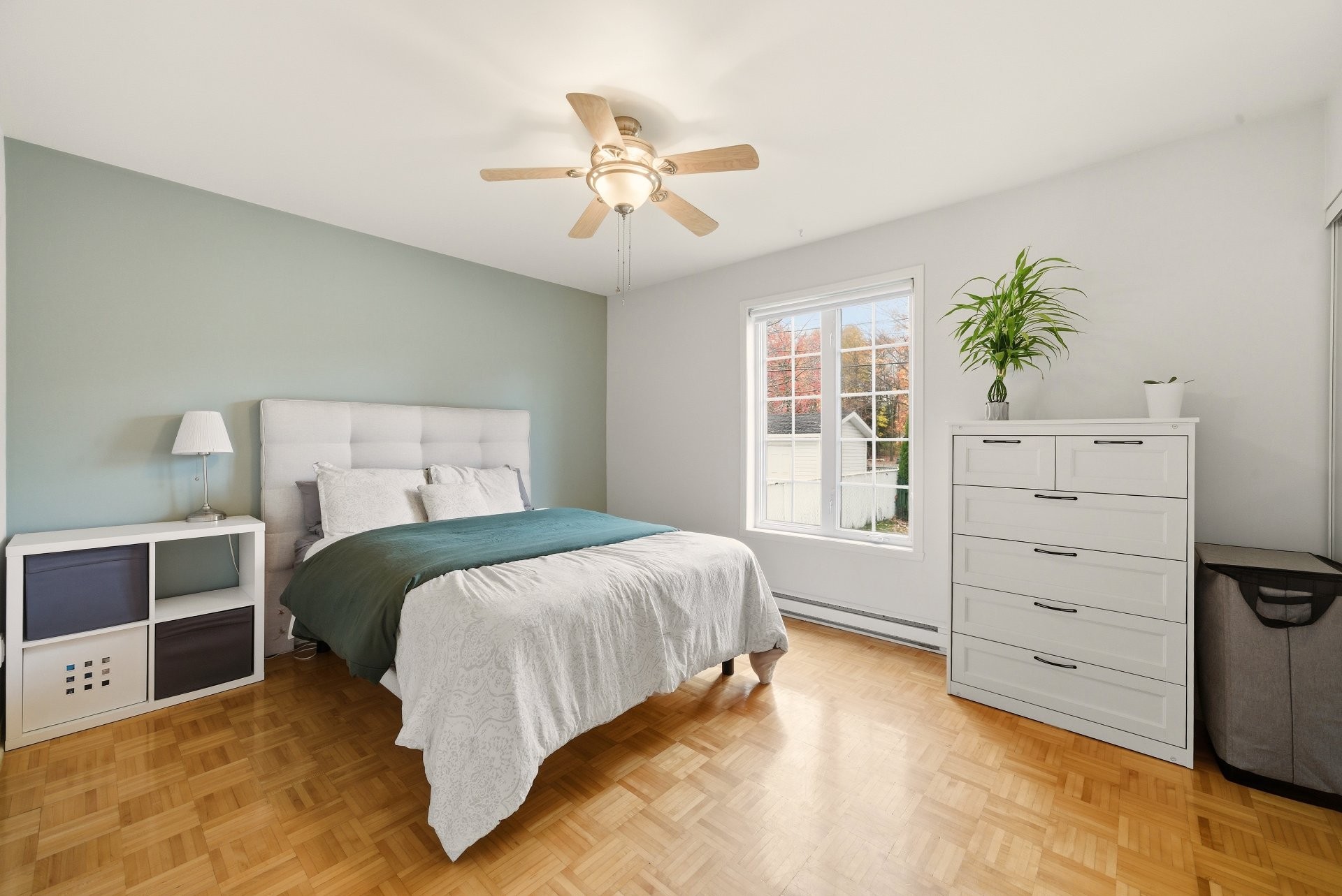 Luminaires, étagères, pôles à rideaux et rideaux, rangement dans le garde-robe de la 2e chambre à coucher à l'étage