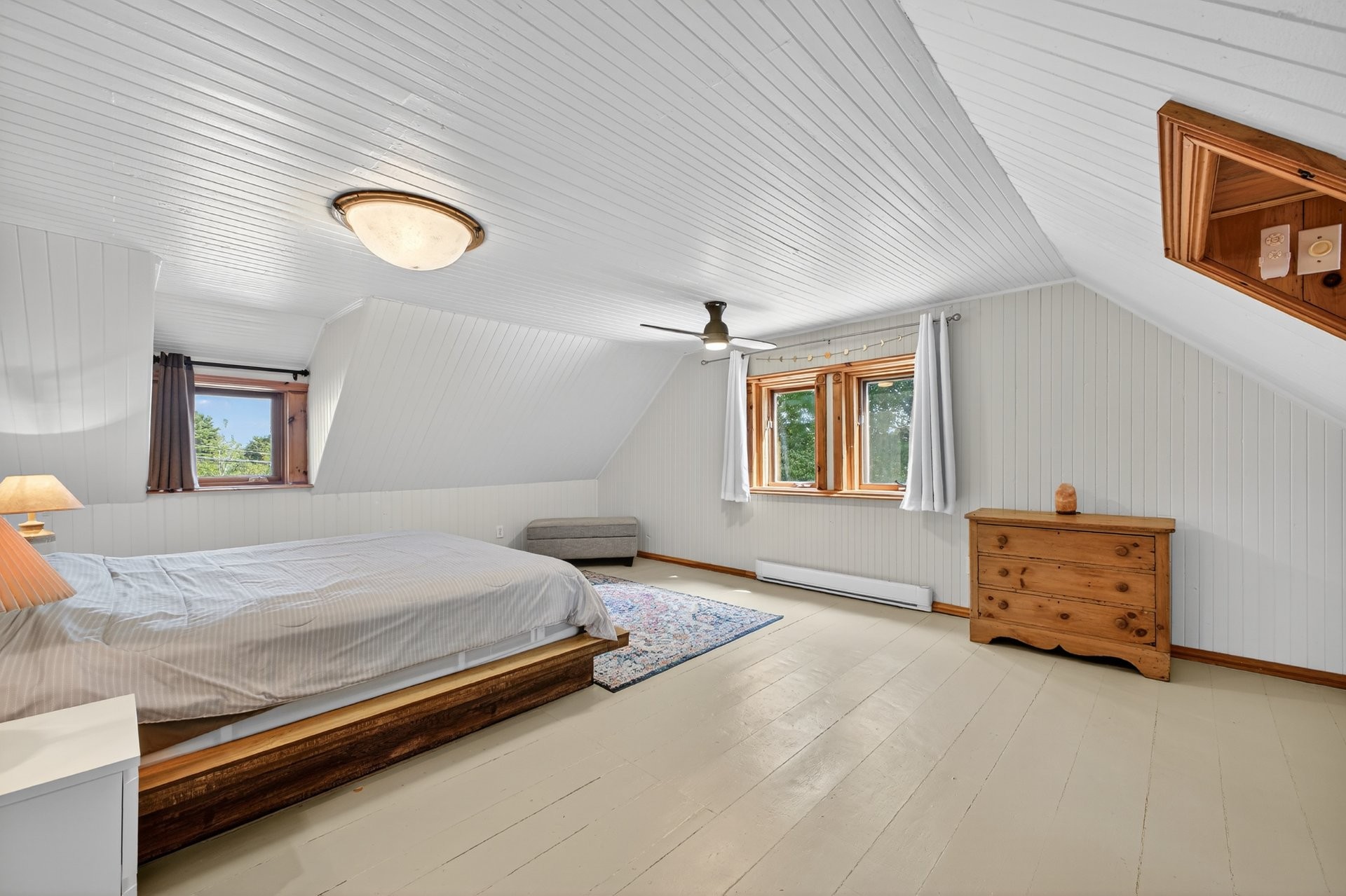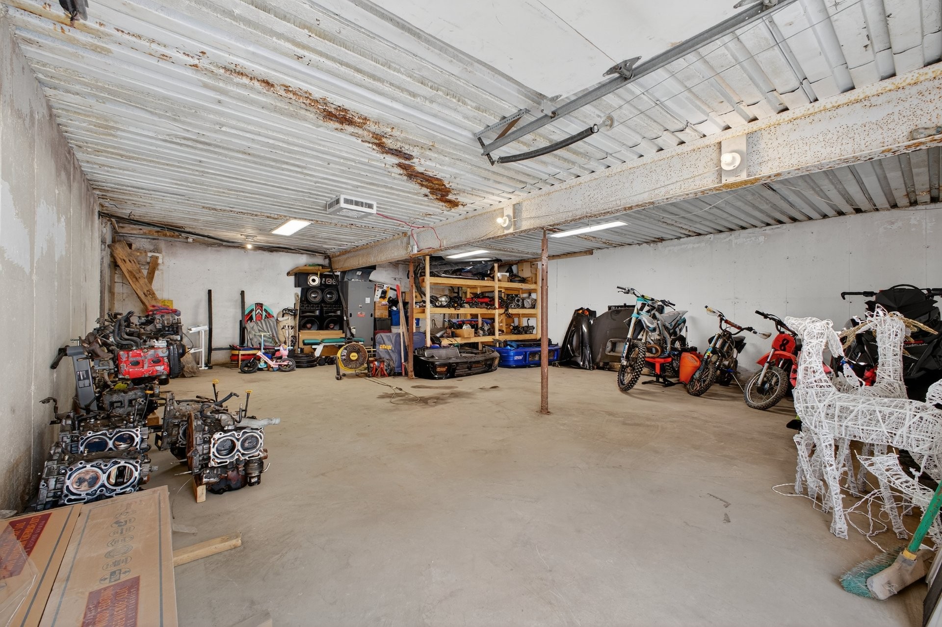 Couverture de fenêtre dans la chambre des enfants, réfrigérateur et congélateur coffre au sous-sol, miroir au-dessus du chariot de bar, mobilier d'extérieur, laveuse et sécheuse. Poêle à granulés dans un garage détaché.