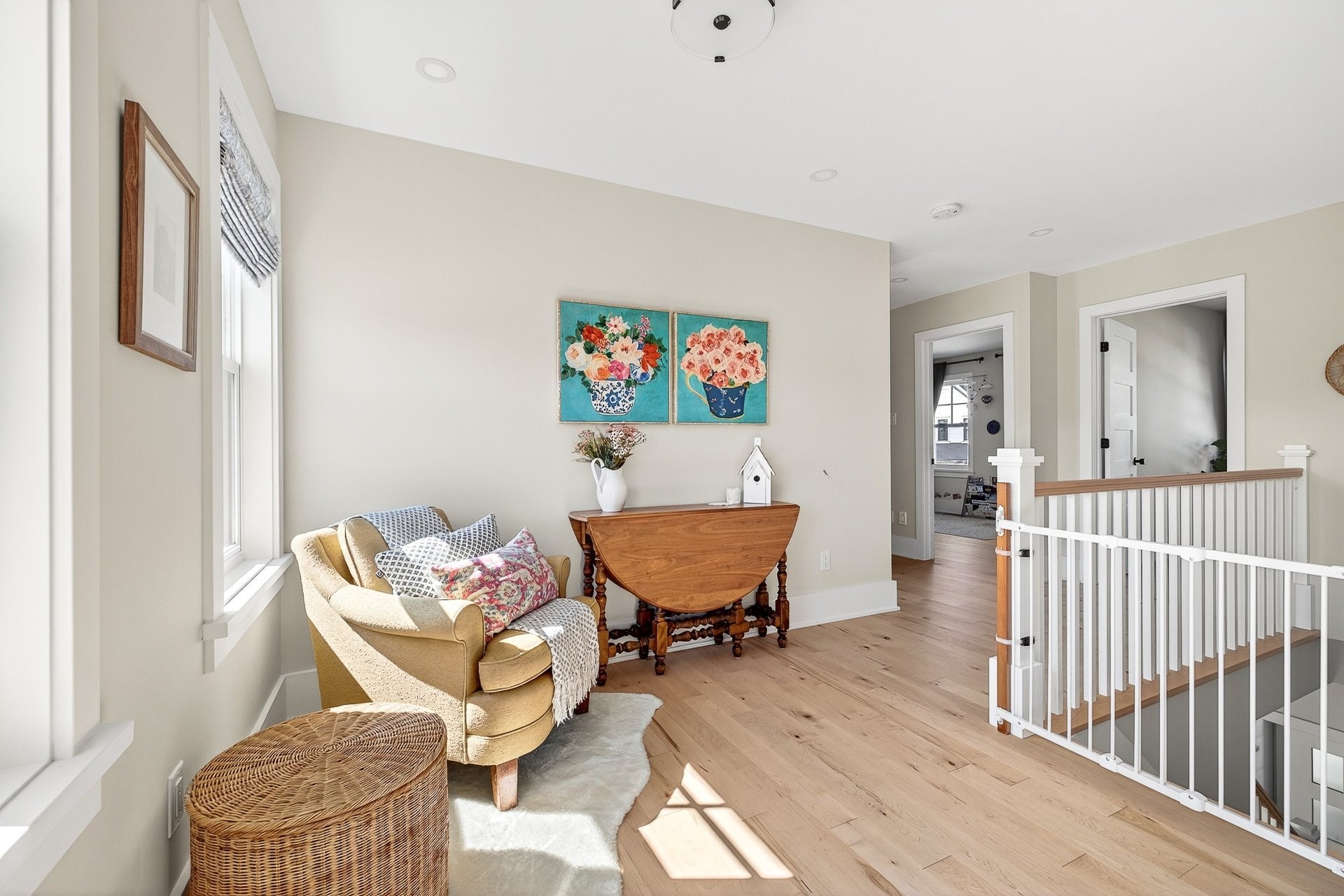 - Le palier de l'étage dispose de stores romains sans cordons, imprimé William Morris.