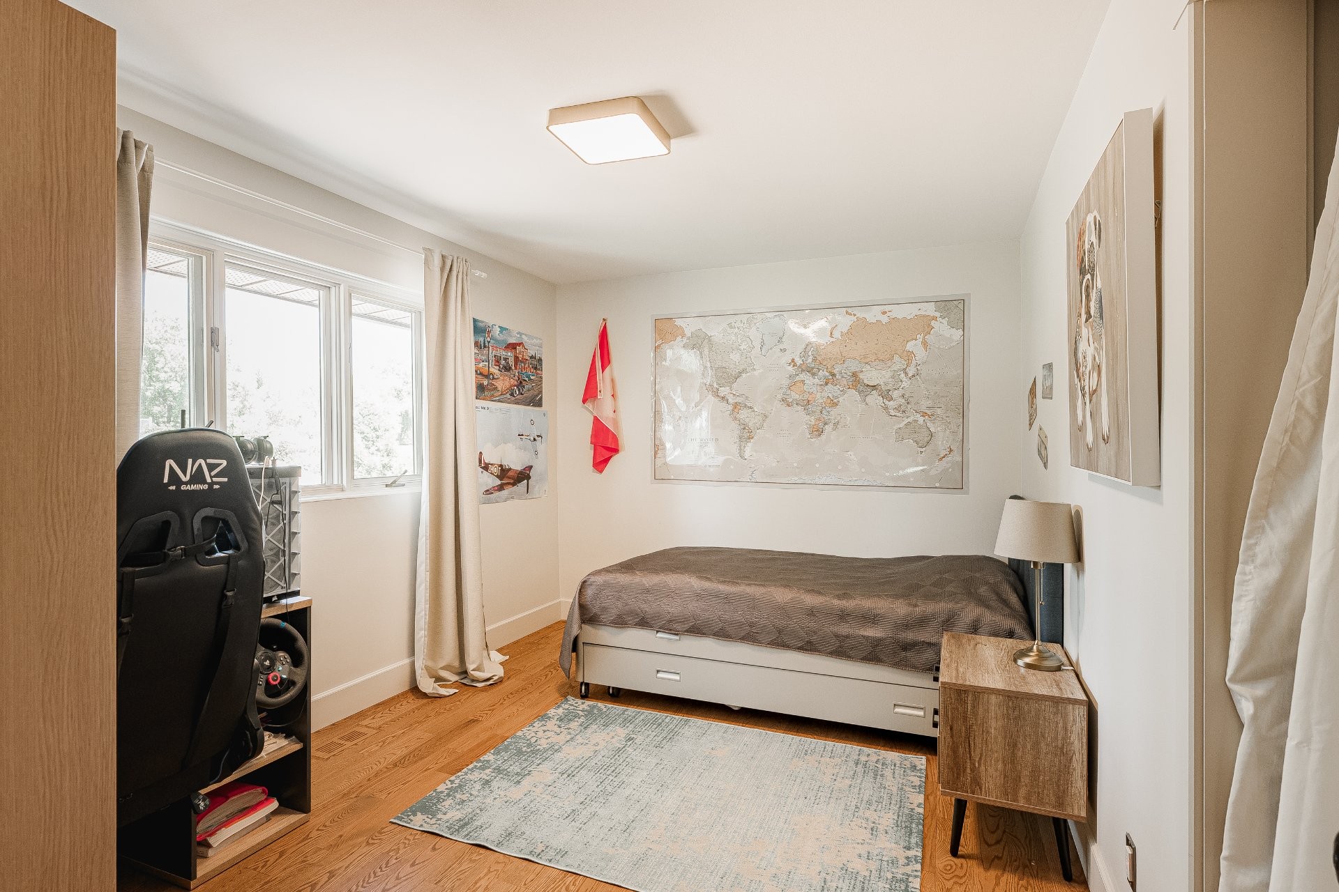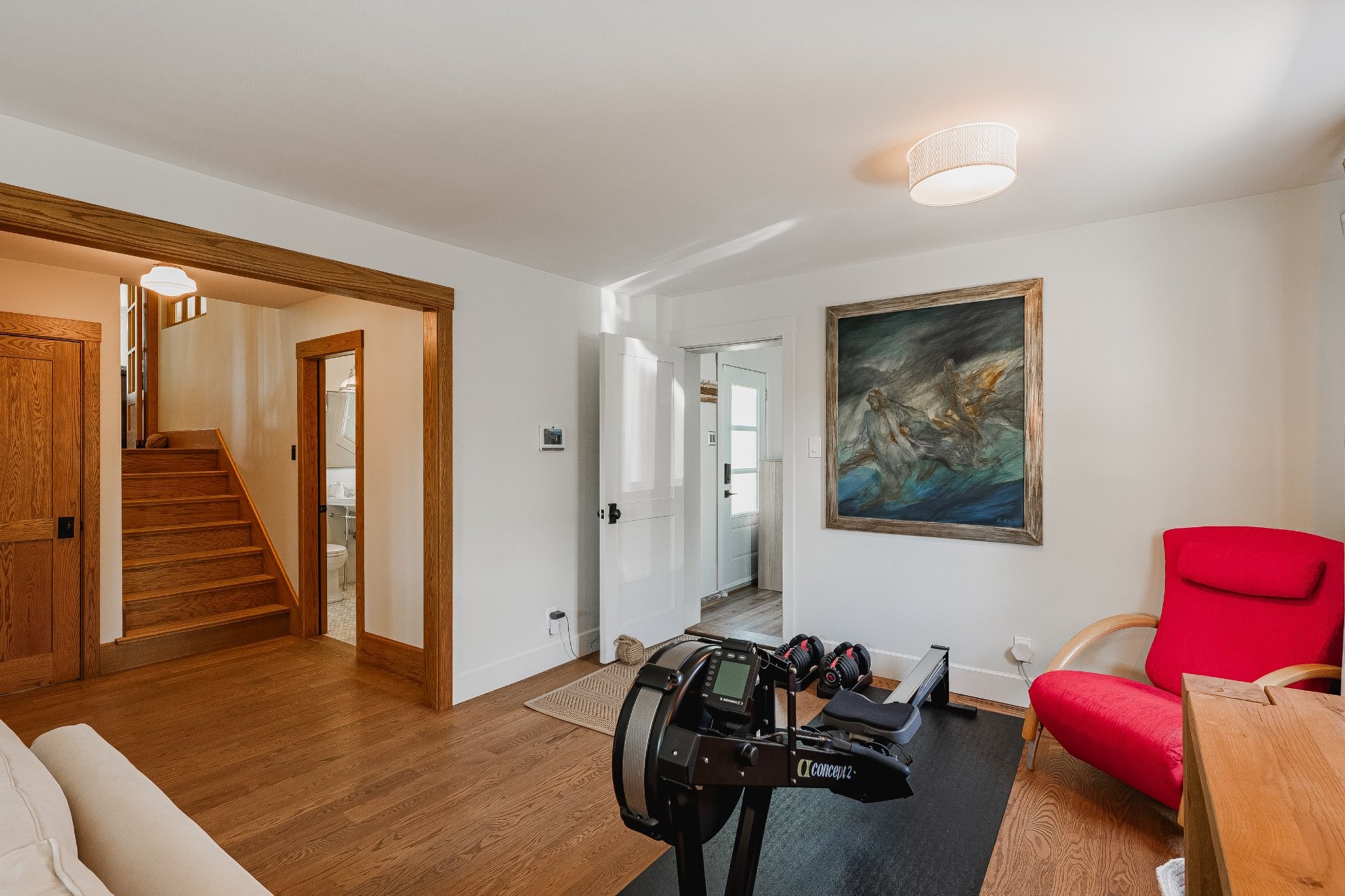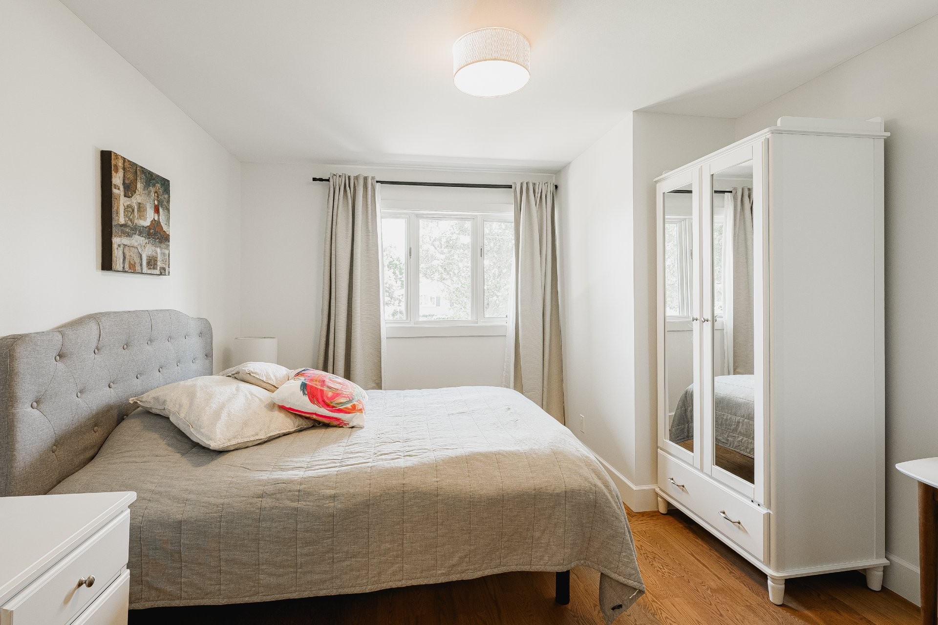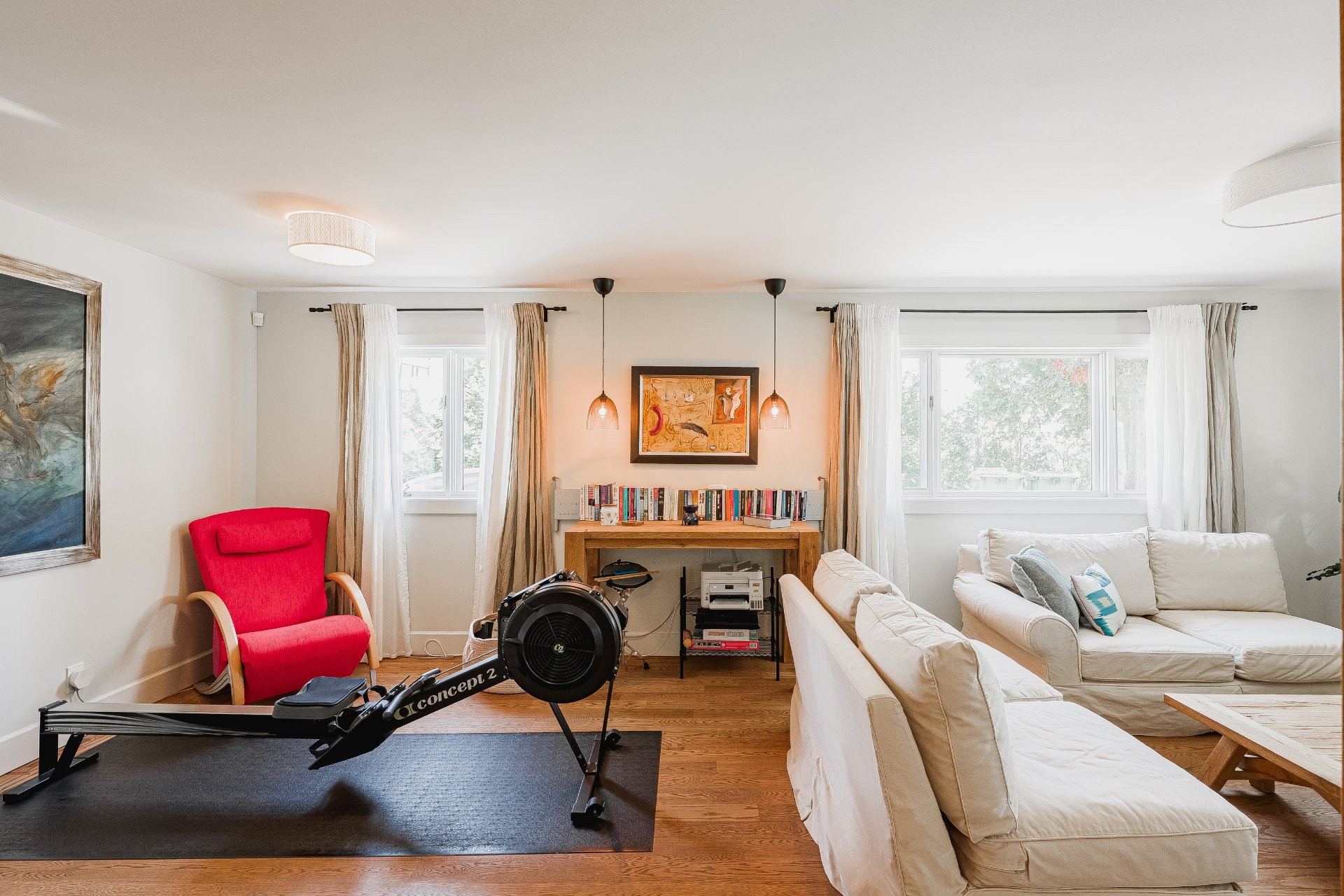 Le rez-de-jardin lumineux et aéré comprend une salle familiale confortable avec de grandes fenêtres, une quatrième chambre et une deuxième salle de bain complète. Ce niveau donne également accès à un pratique vestibule de service (mudroom), relié à la fois à la cour arrière et au garage attenant.